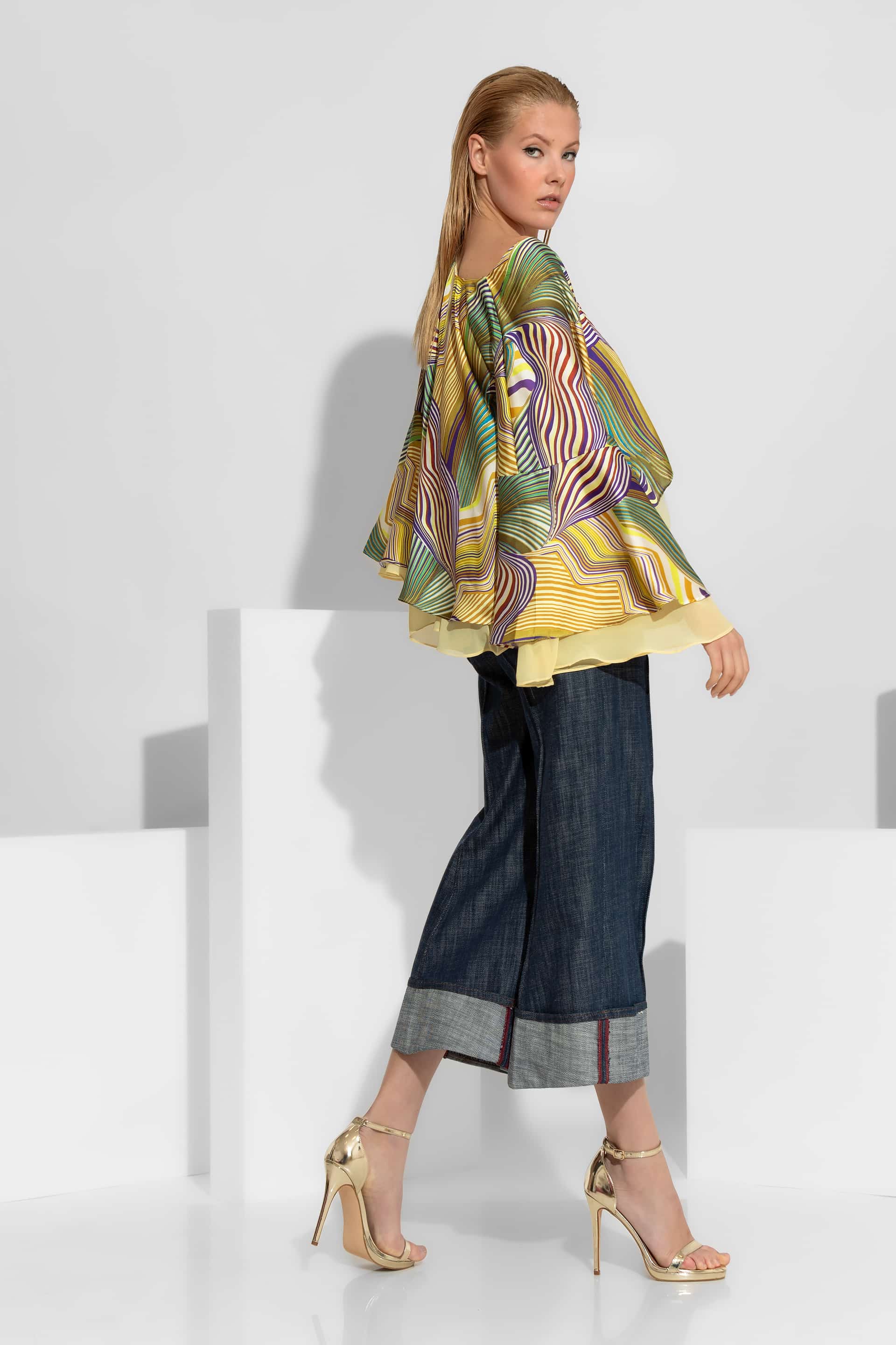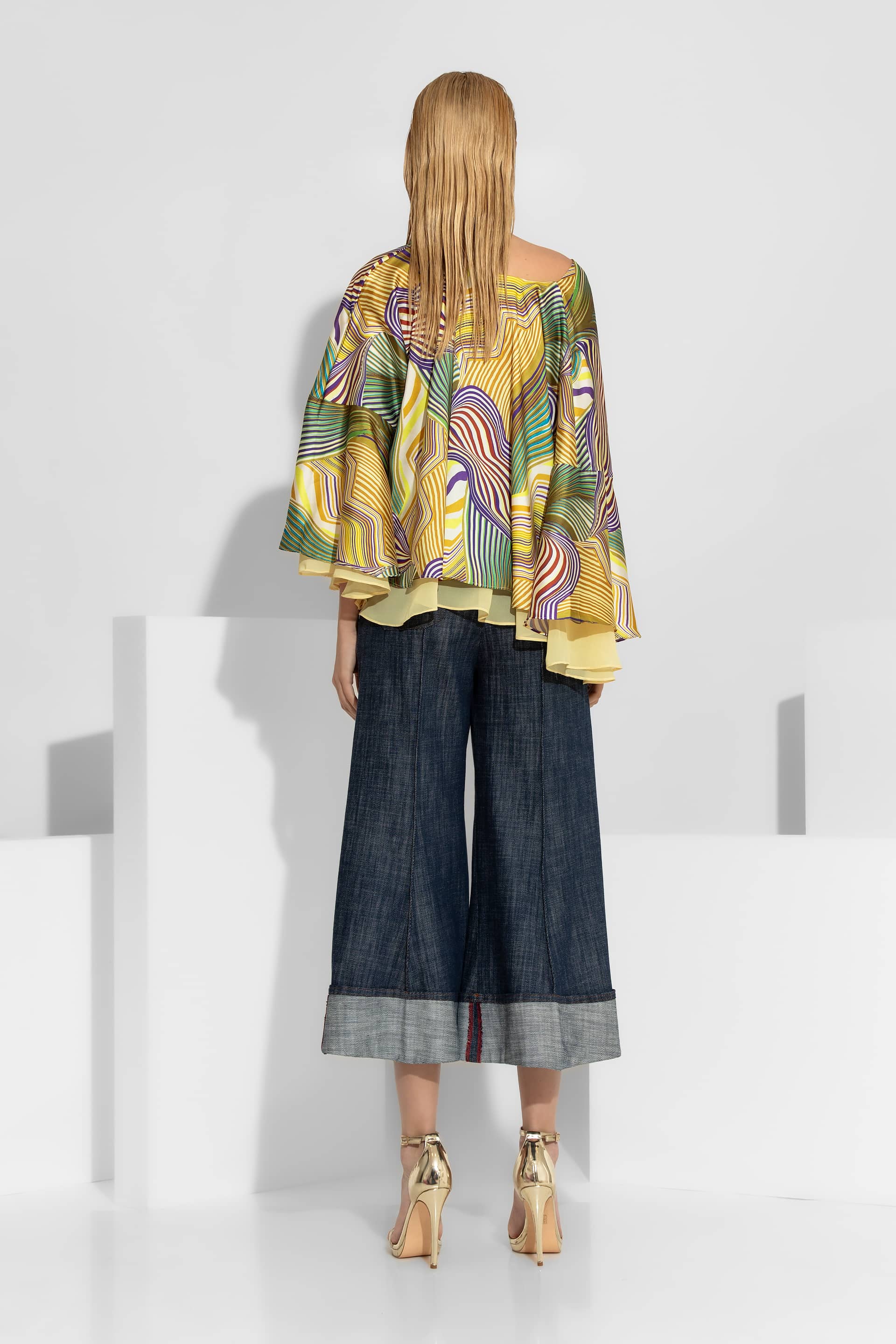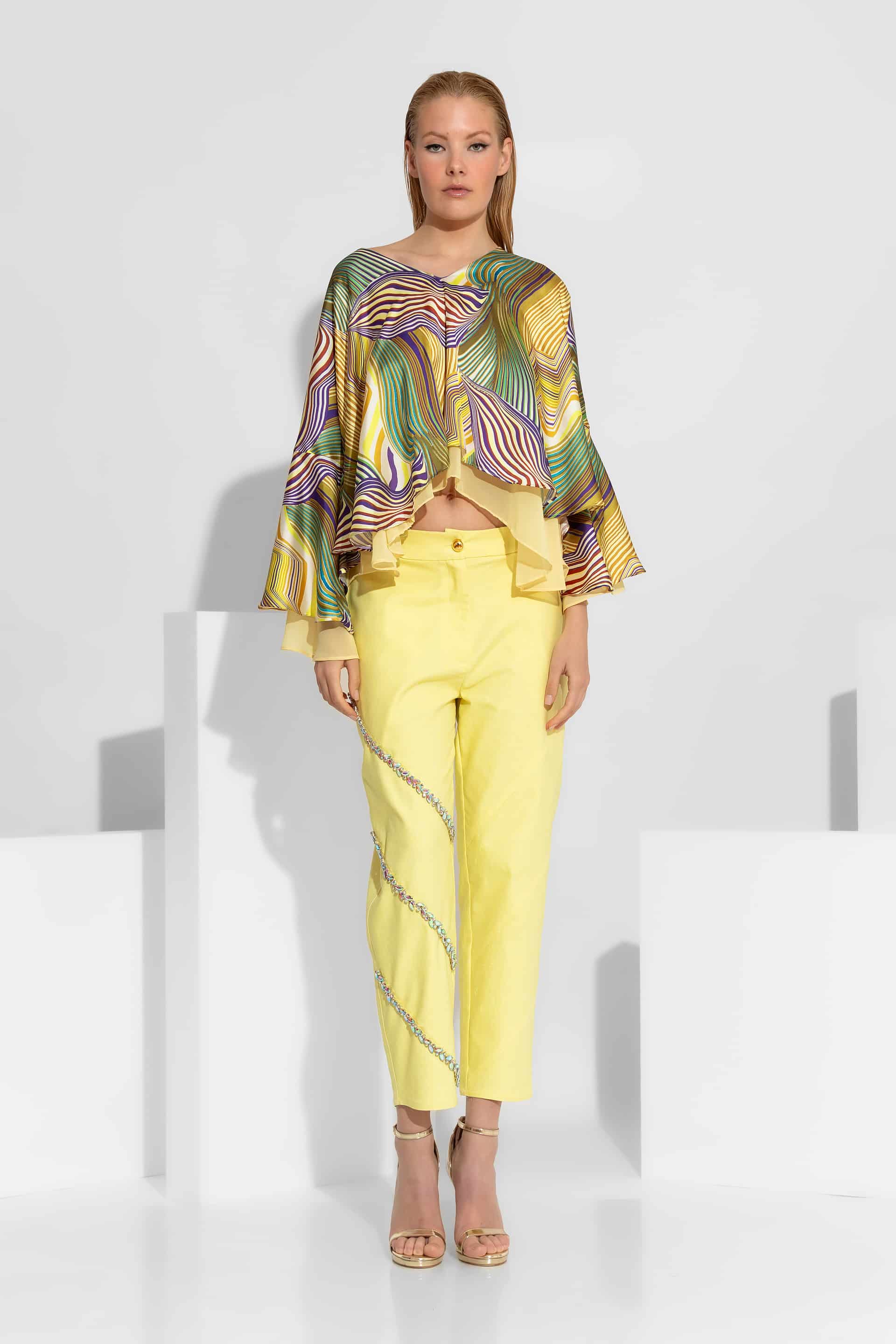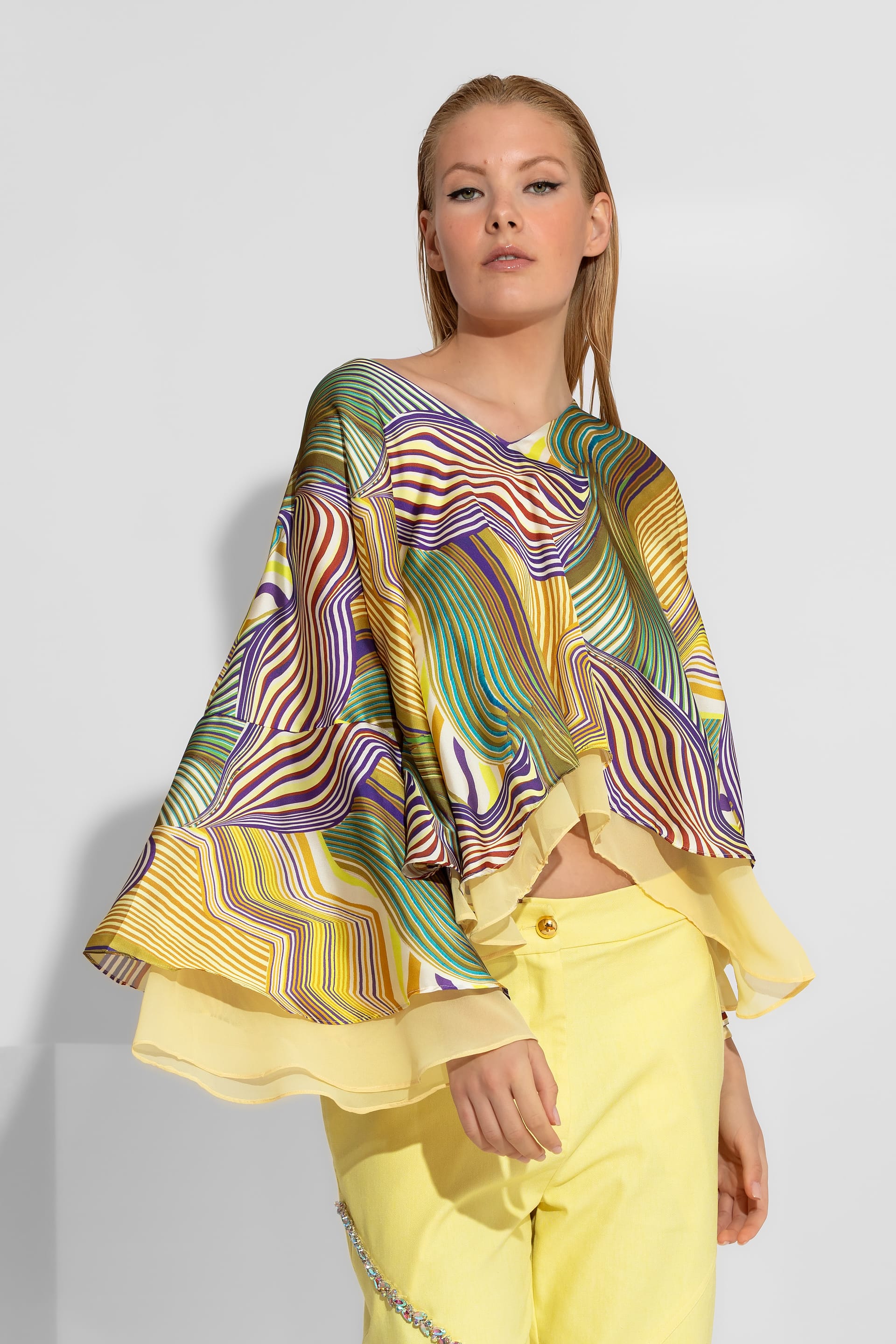 An impressive satin top featuring a vibrant abstract pattern in yellow and green tones. Designed with a sophisticated double flounce and dramatic wide sleeves, this piece offers a voluminous, flowy silhouette. Perfectly paired with high-waisted trousers for a luxurious resort or cocktail look.