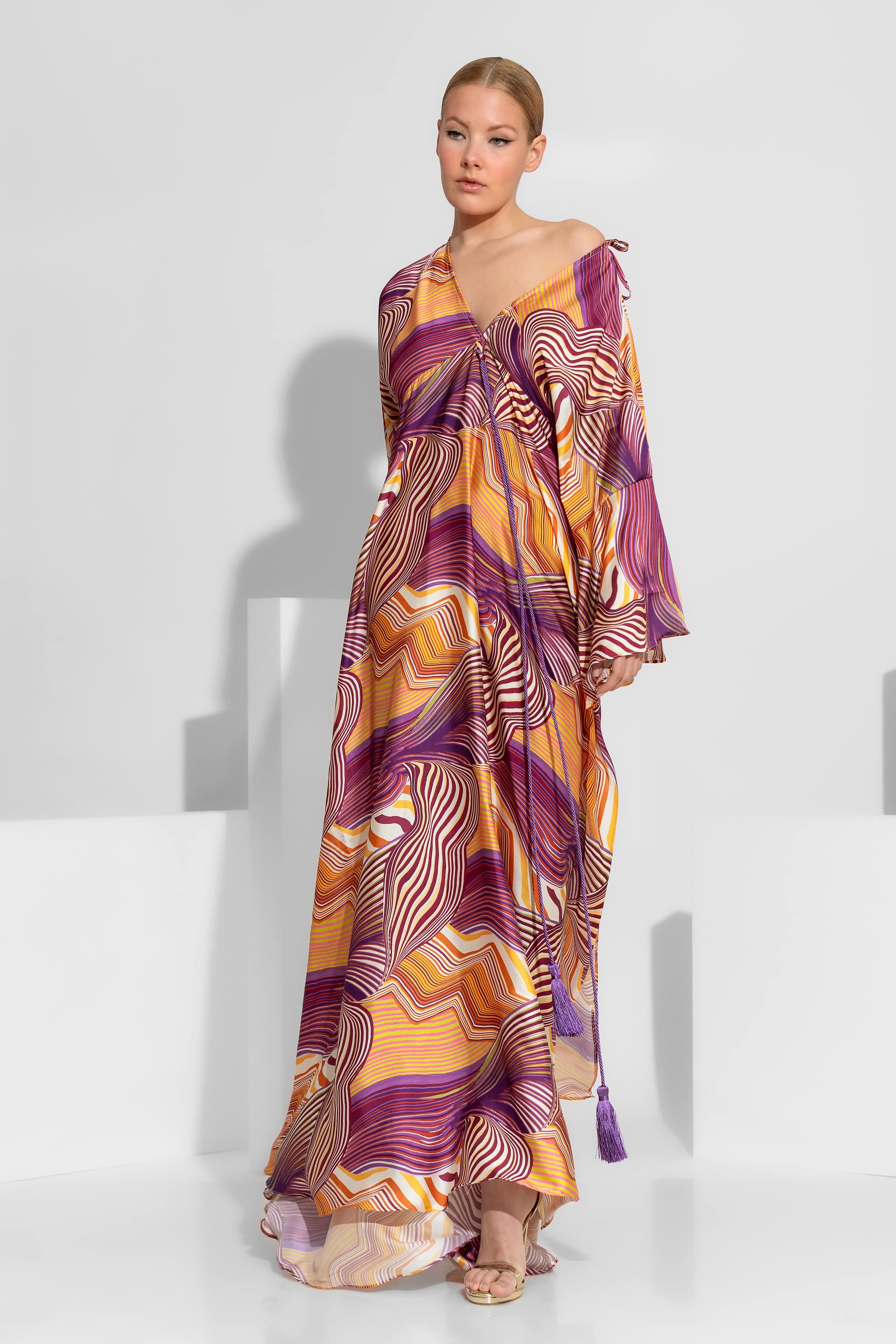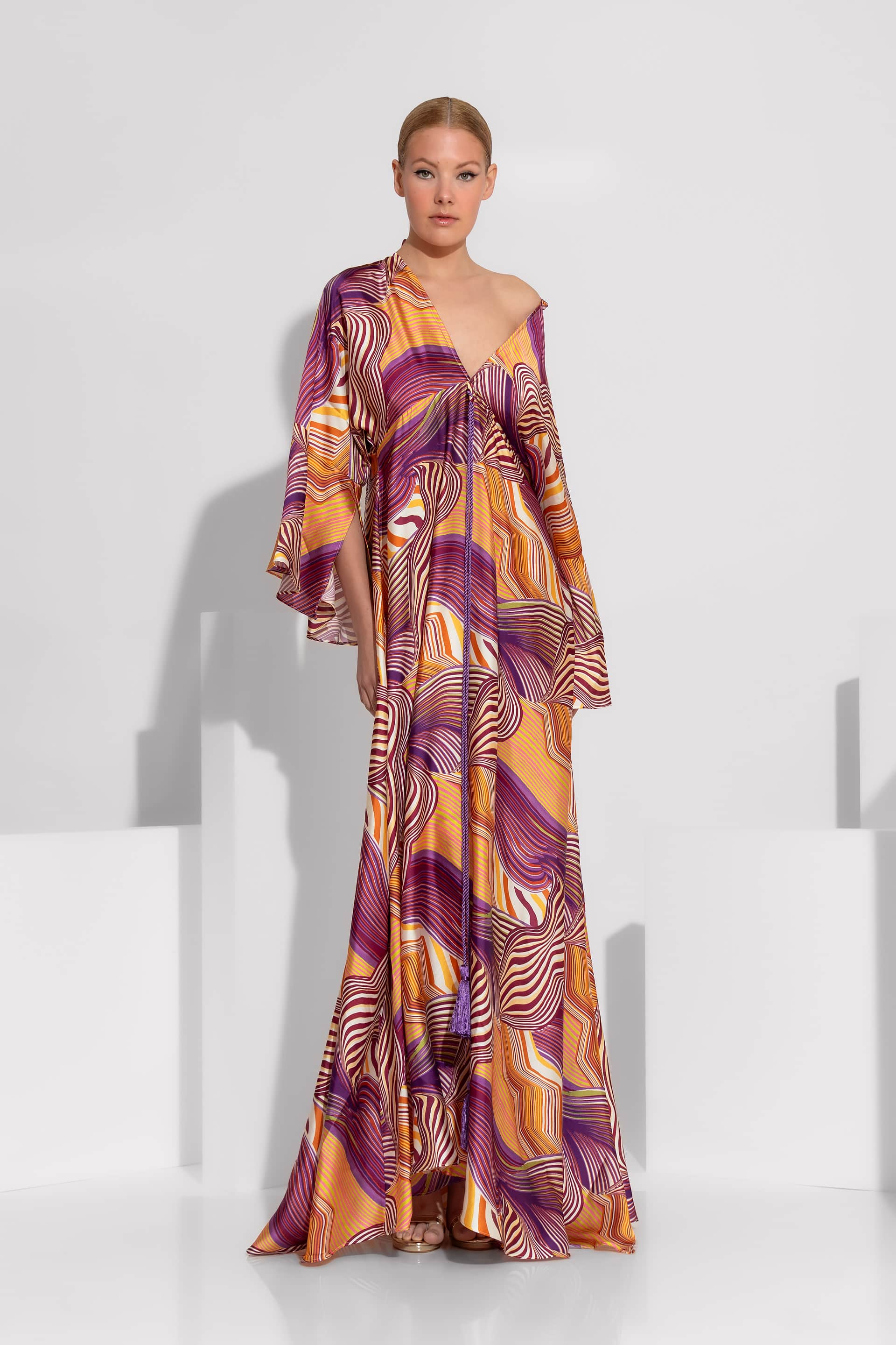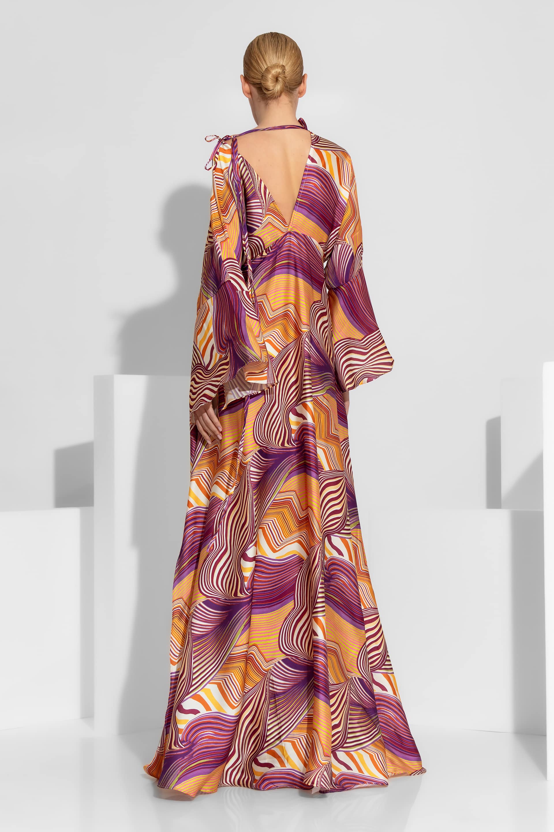 A mesmerizing satin creation featuring a vibrant abstract pattern, a flattering V-neckline, and dramatic wide sleeves. This maxi dress exudes bohemian luxury with its voluminous silhouette and fluid movement, making it an ideal choice for high-end summer events and evening appearances.