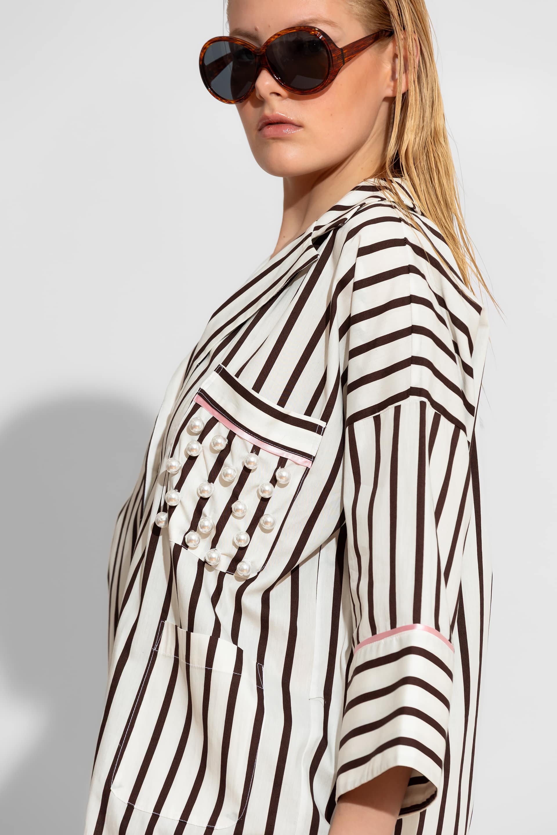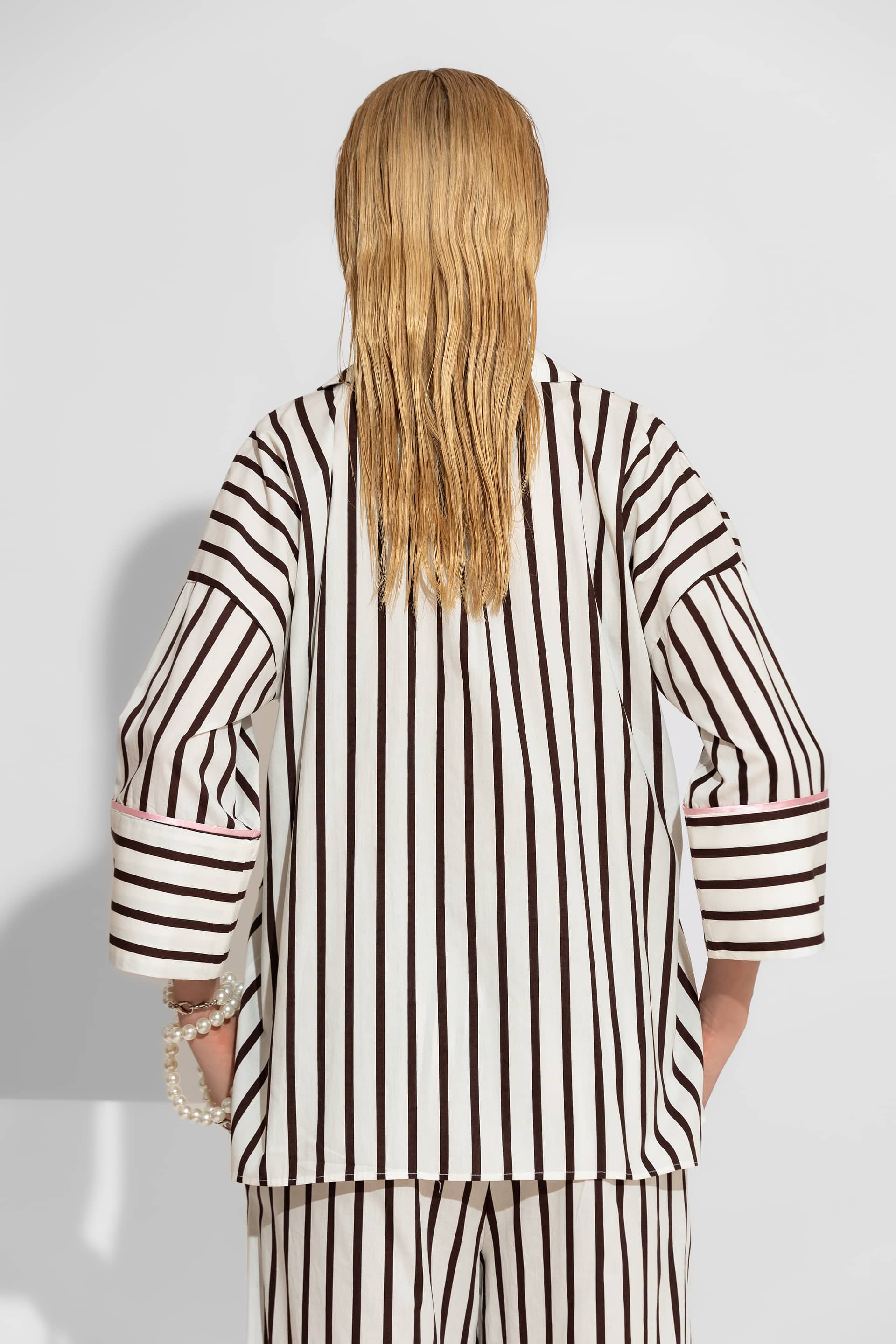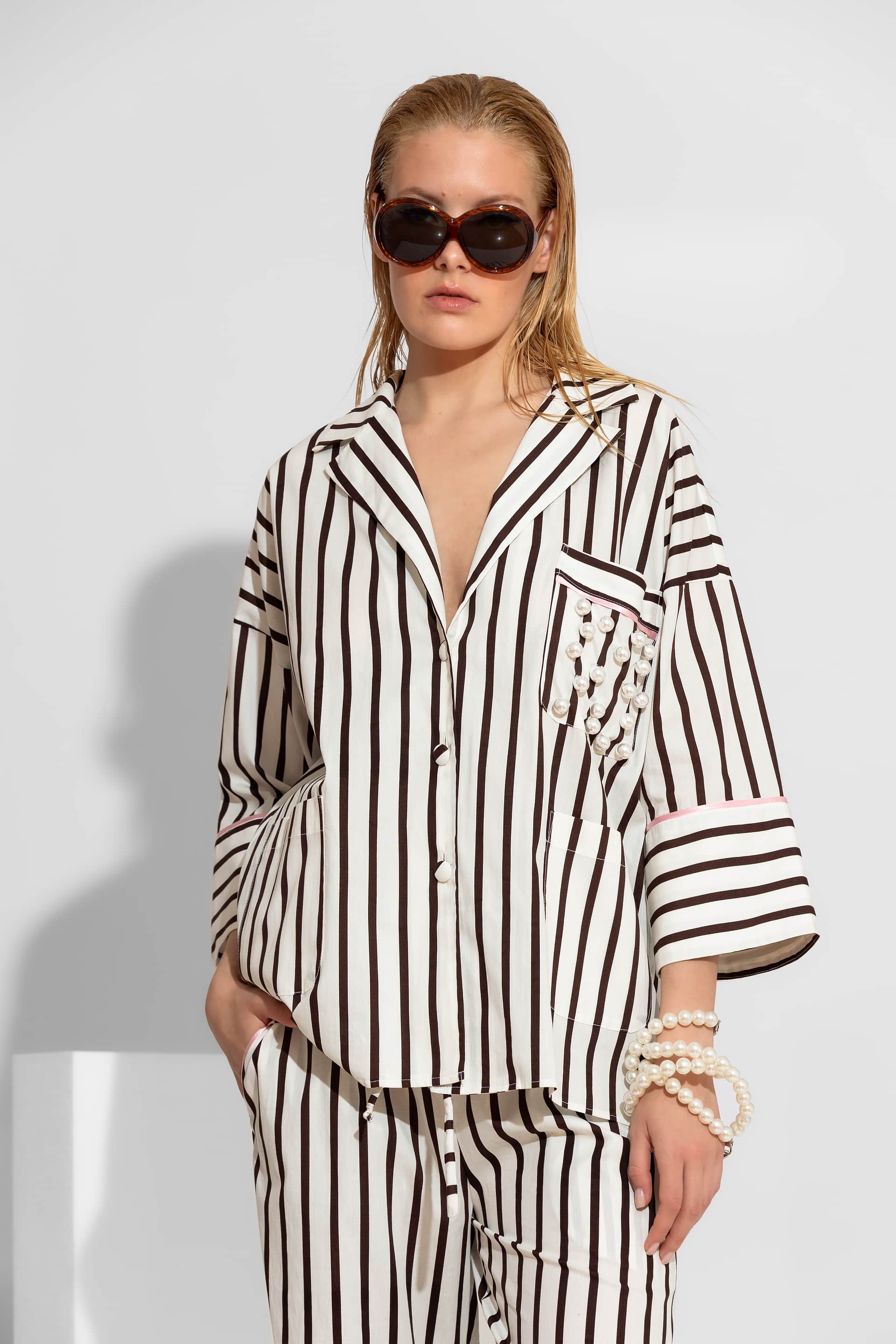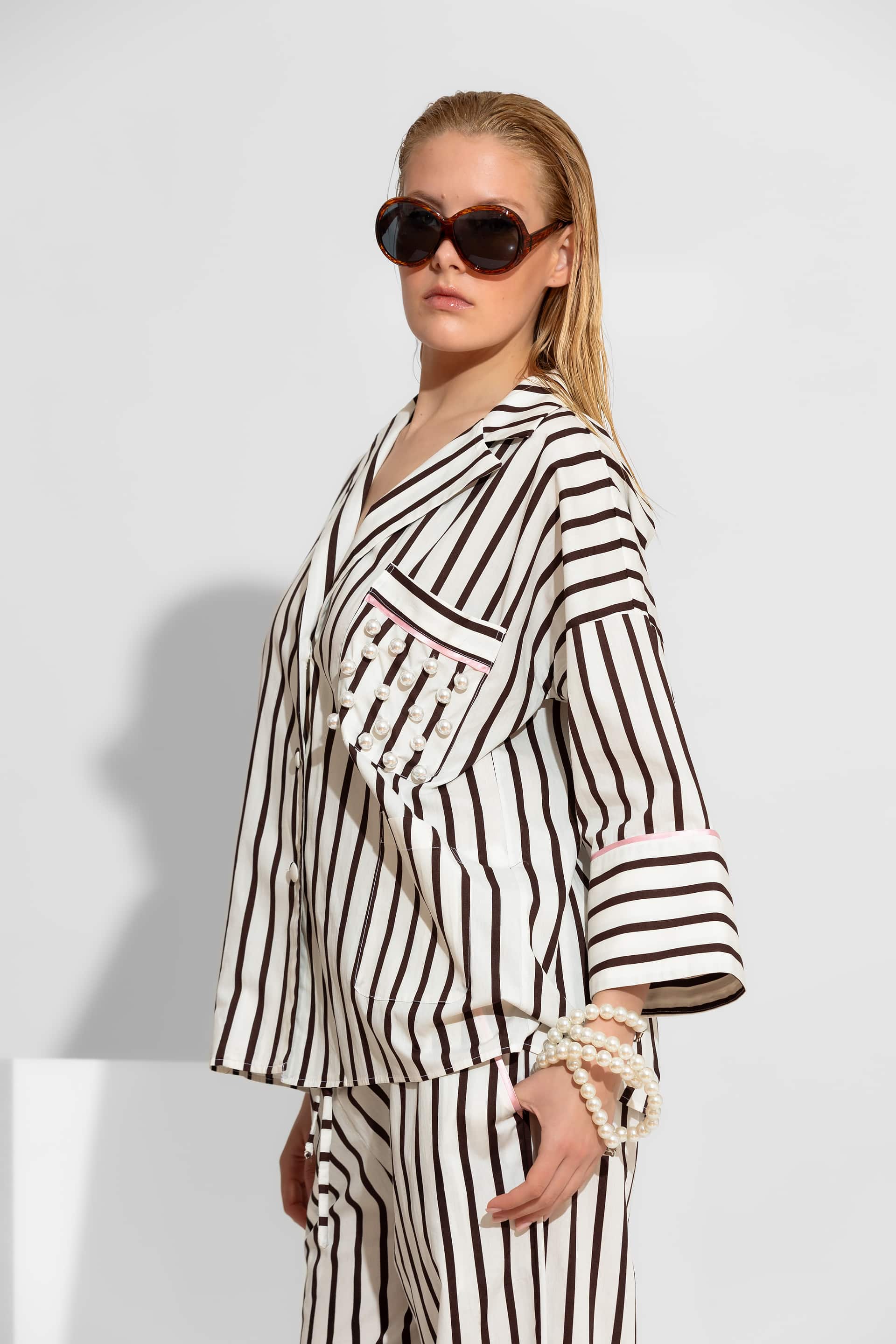 A high-end, statement piece crafted from 100% premium cotton poplin, featuring a bold vertical stripe pattern. This shirt combines a modern oversized silhouette with artisanal details, such as hand-embroidered pearls on the chest pocket and elegant pink contrast piping on the cuffs. Designed for versatility, it includes two functional lower pockets and matching fabric-covered buttons for a refined, luxury finish.