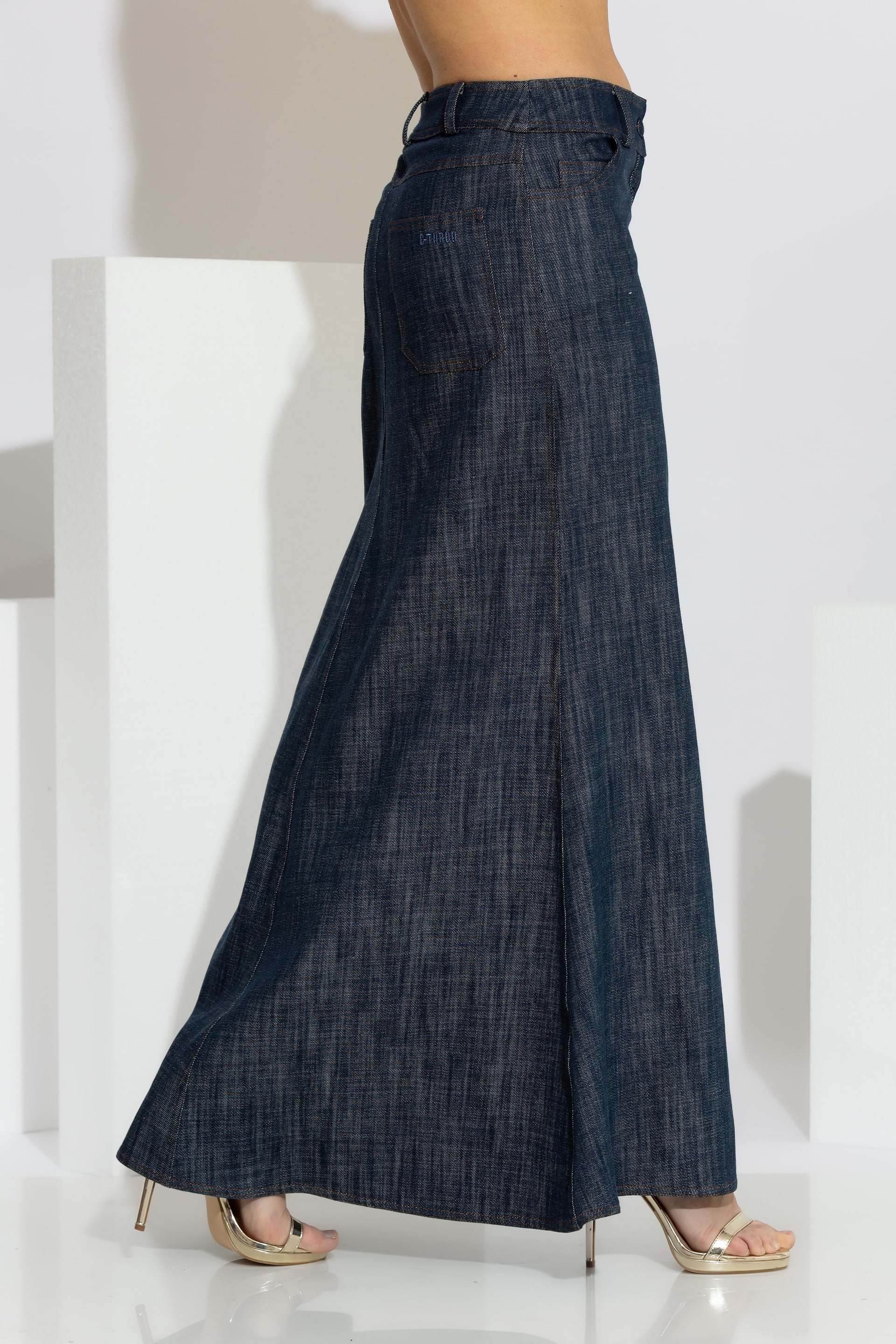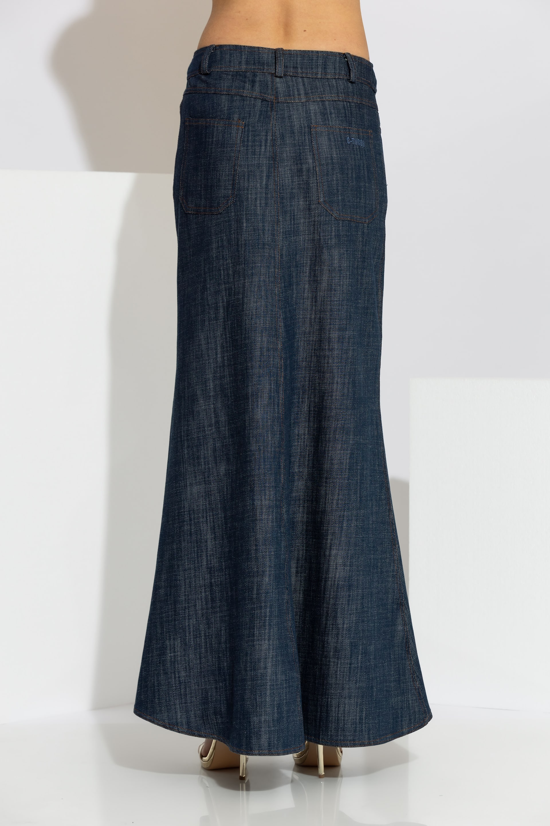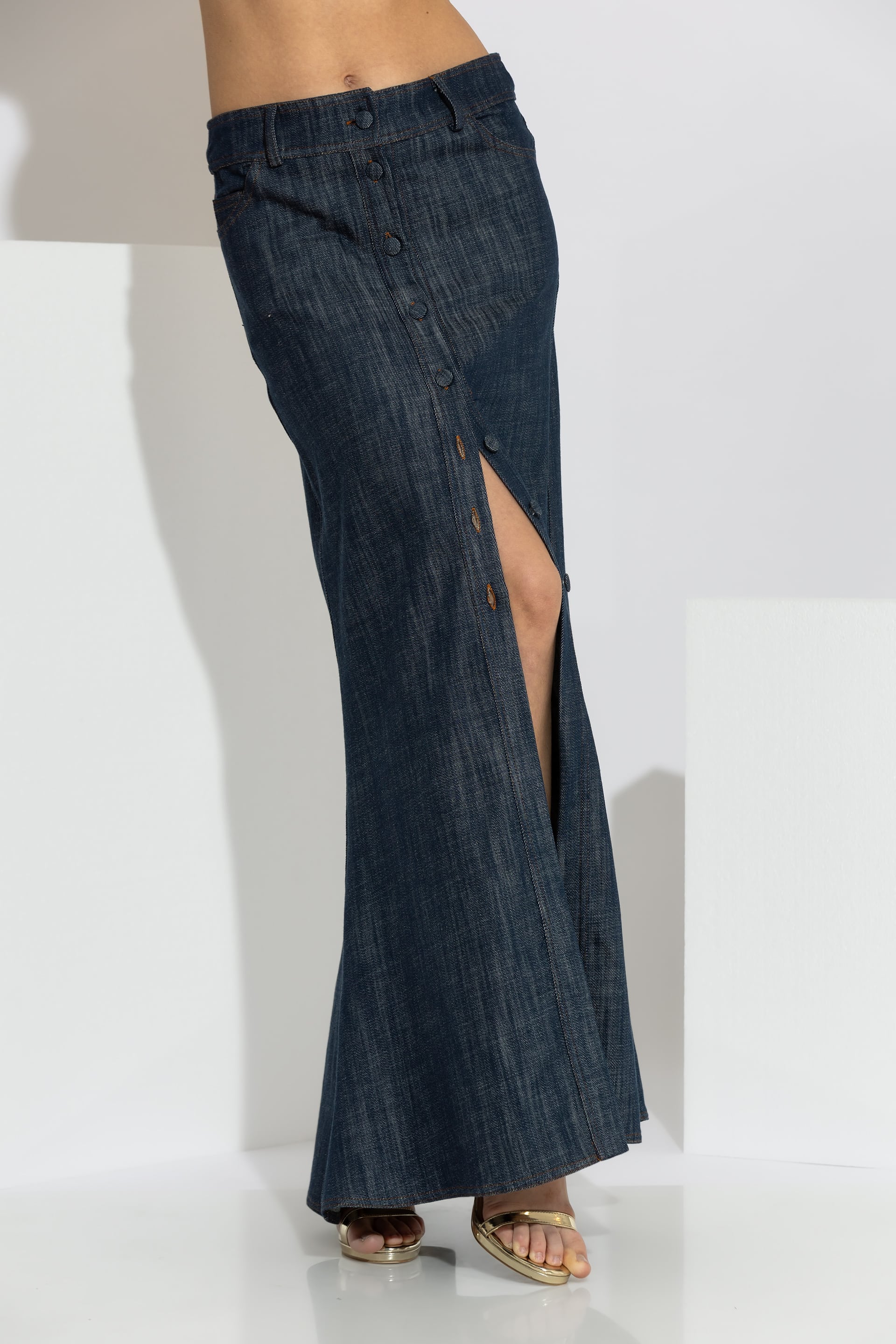This maxi denim skirt redefines classic denim with a modern, feminine perspective. It features an elegant front button closure, ending in a striking deep slit that adds movement and dynamism to every step. It is a versatile piece that can be worn from morning with sneakers to evening with high-heeled sandals.
