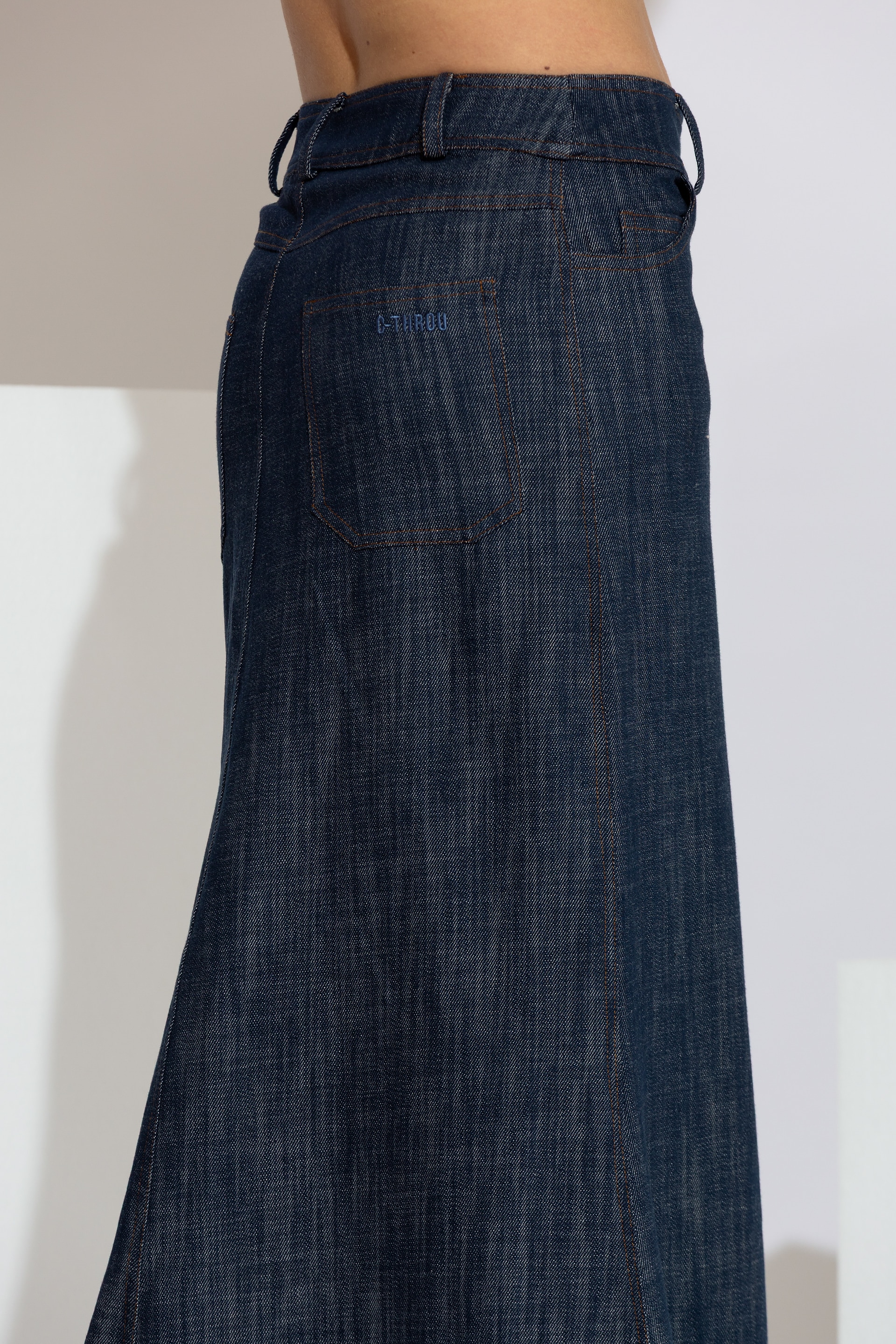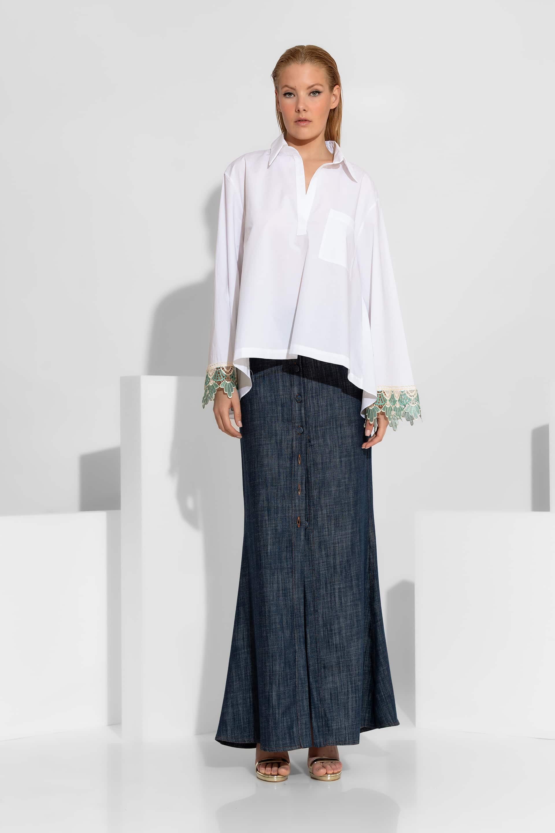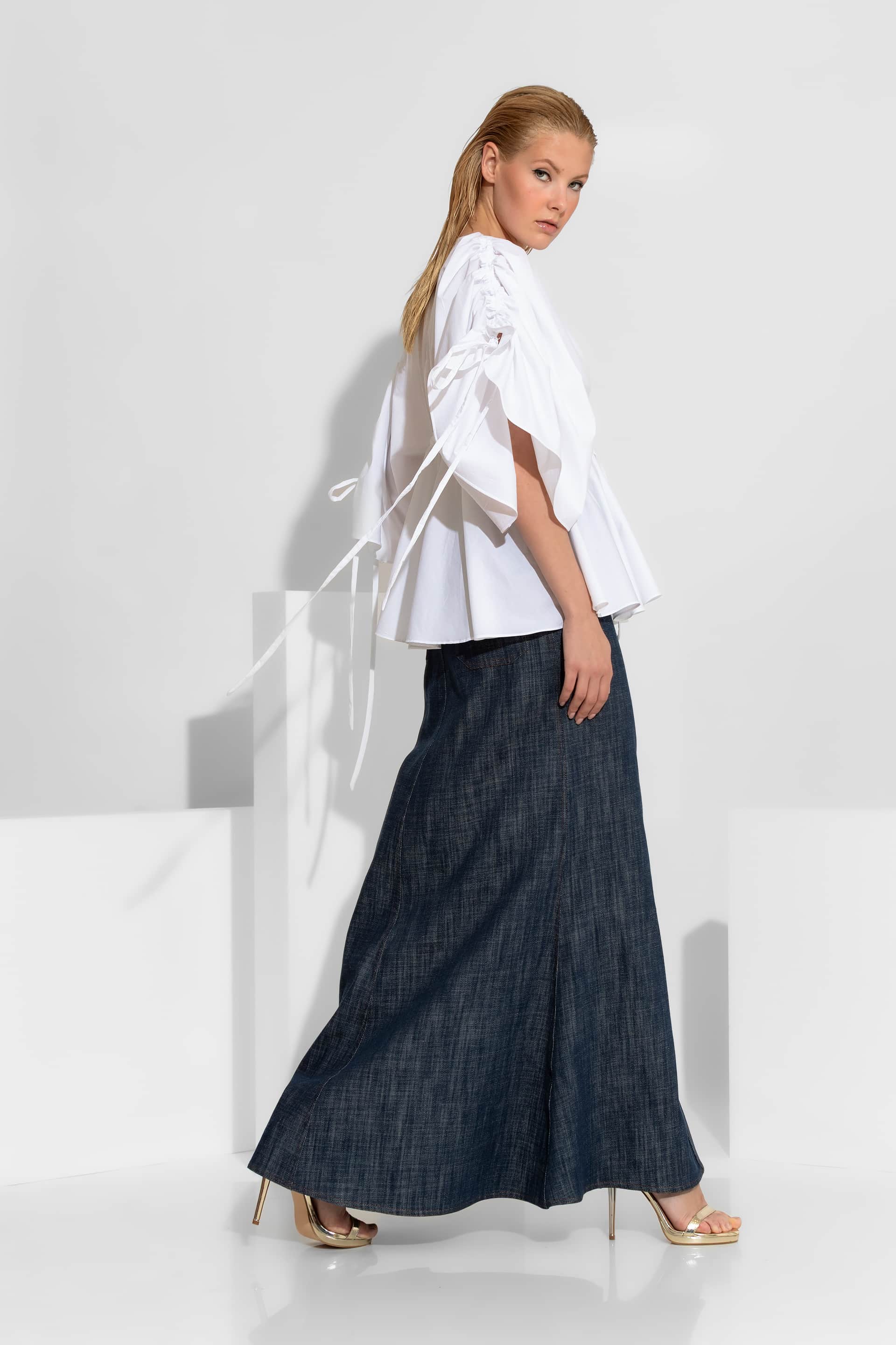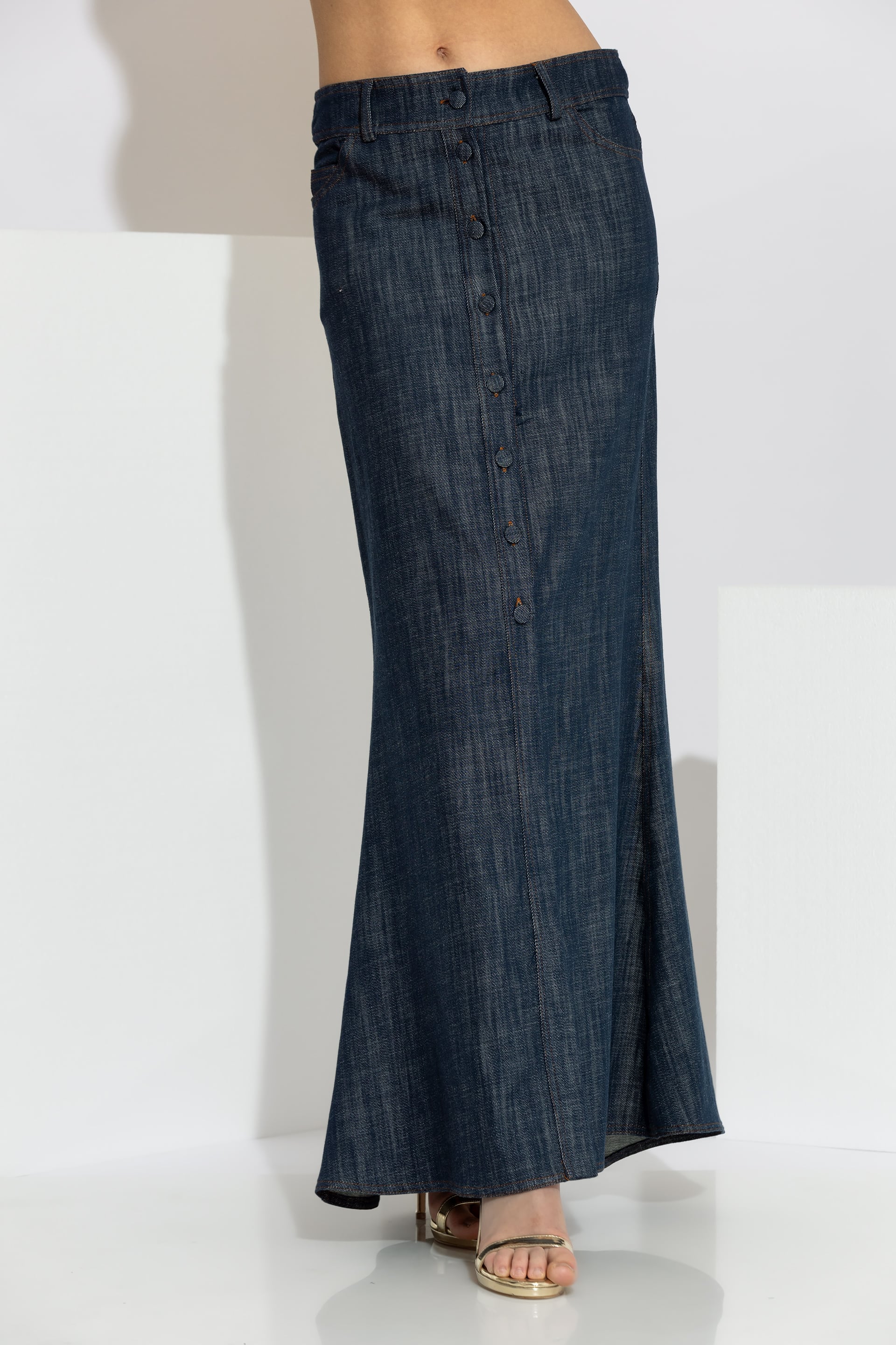 This maxi denim skirt redefines classic denim with a modern, feminine perspective. It features an elegant front button closure, ending in a striking deep slit that adds movement and dynamism to every step. It is a versatile piece that can be worn from morning with sneakers to evening with high-heeled sandals.