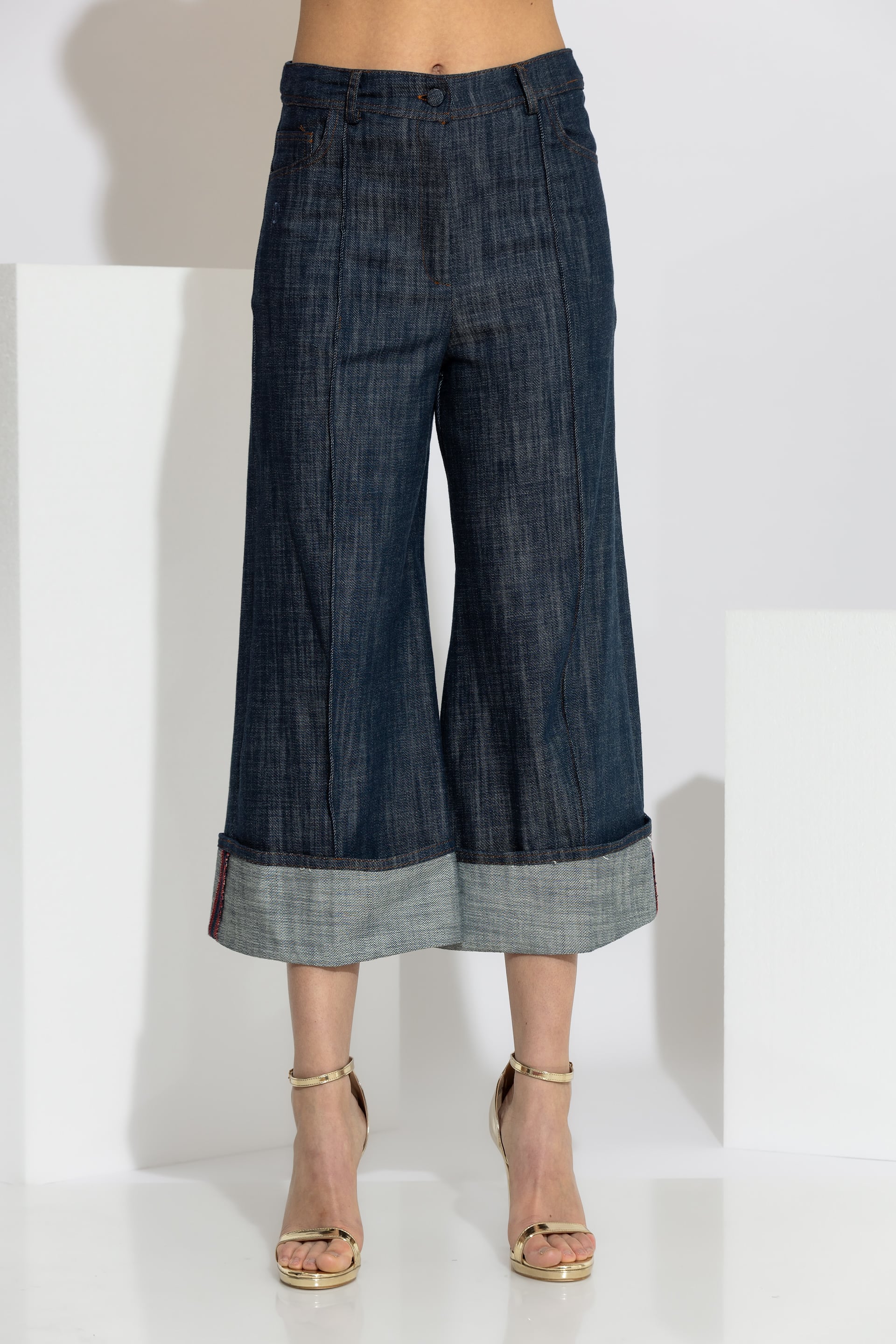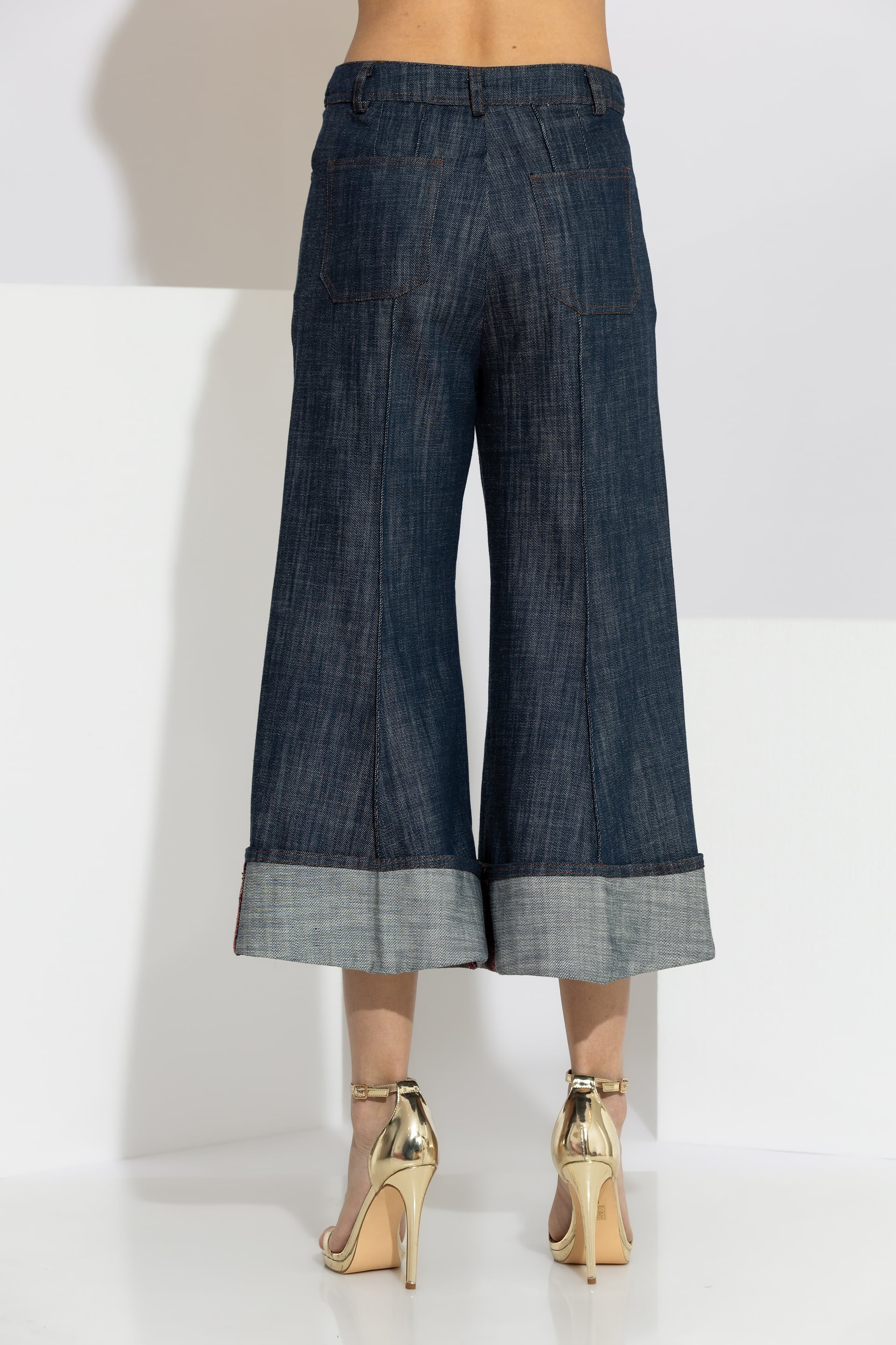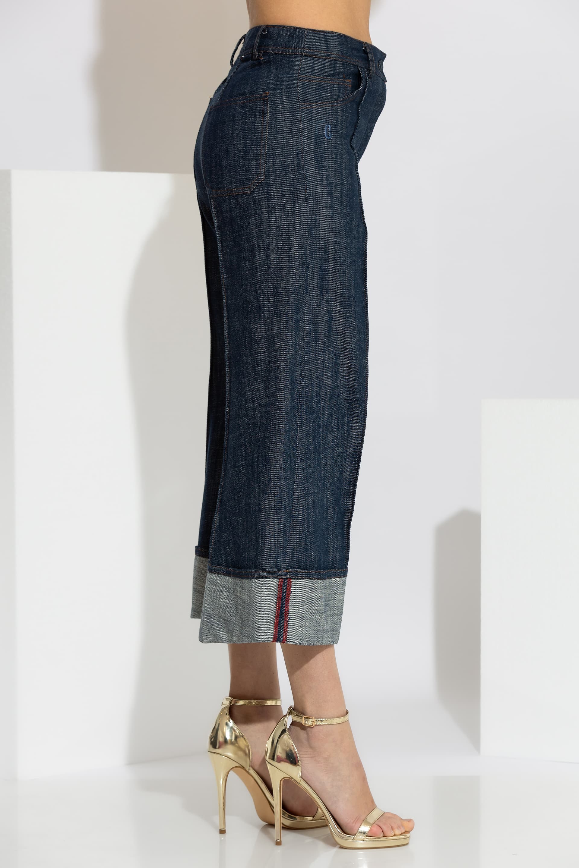 Crafted from 100% premium cotton denim, it offers an authentic texture, durability, and a fit that adapts beautifully to the body. The central seam (nervure) detail and the fixed turned-up hem (cuffs) provide a unique and dynamic finish.