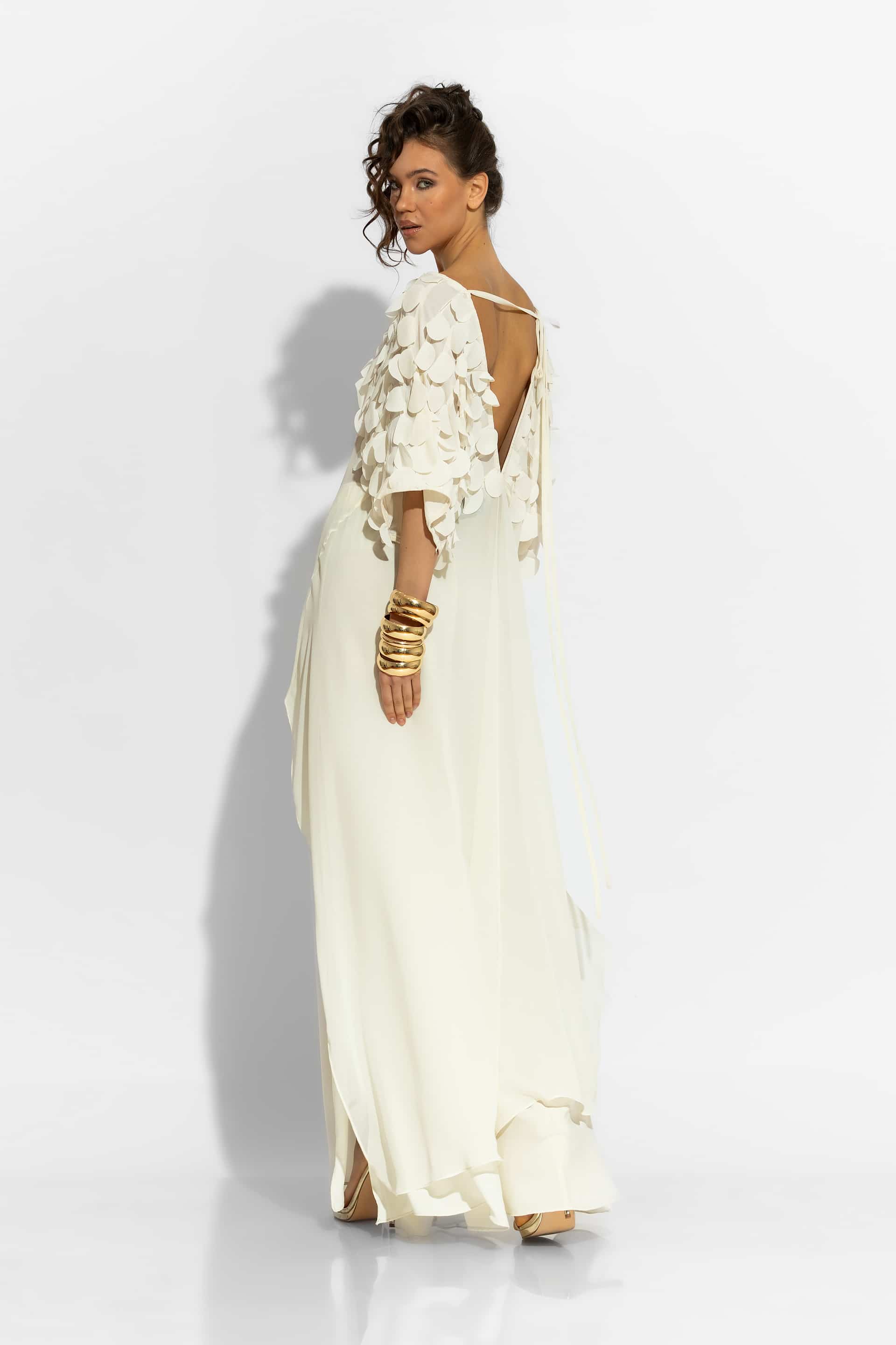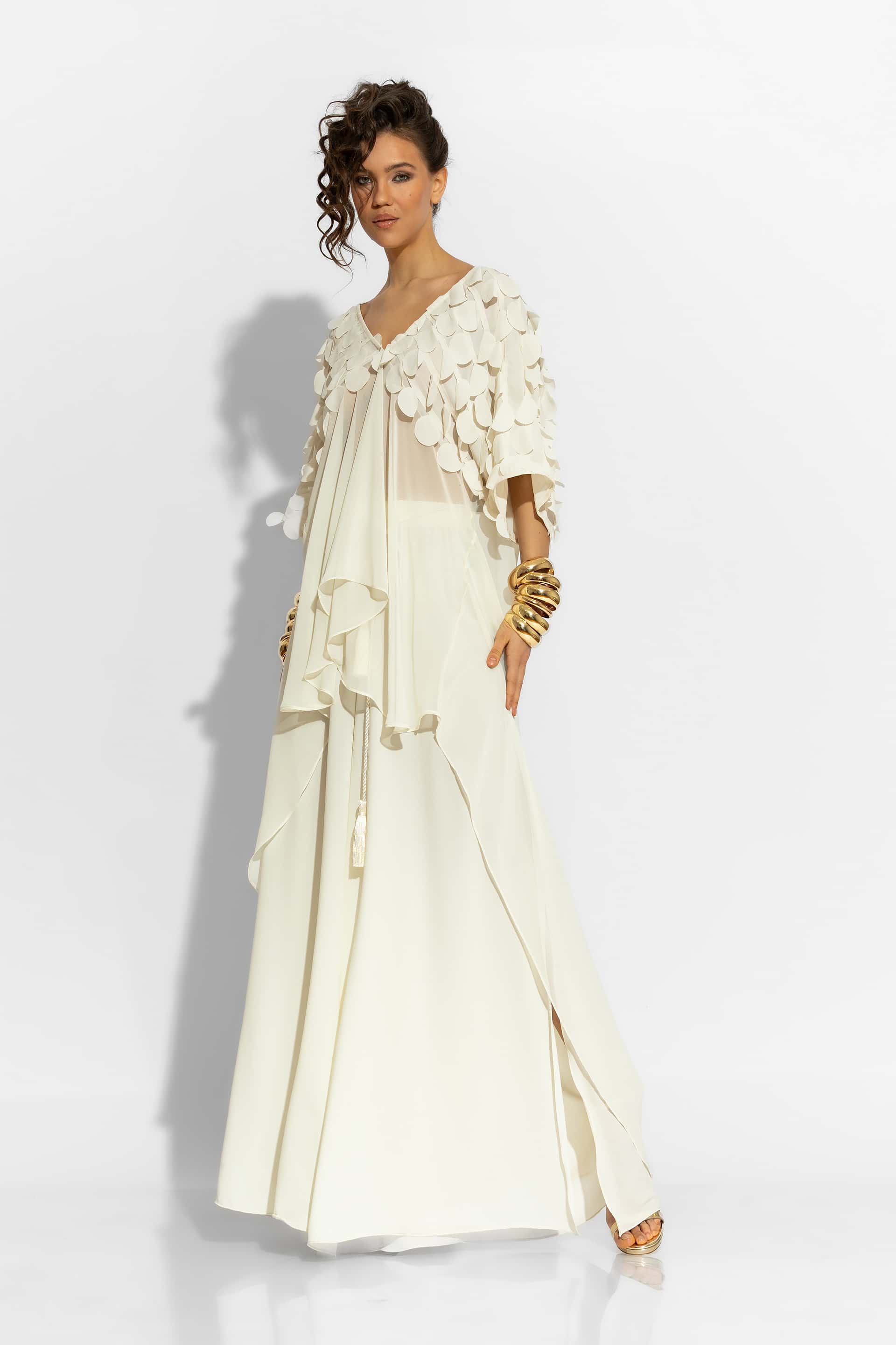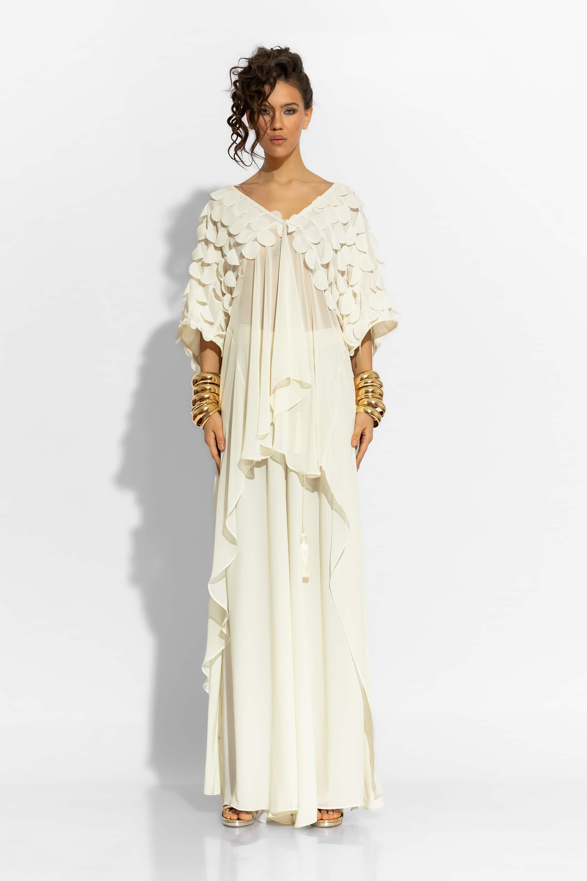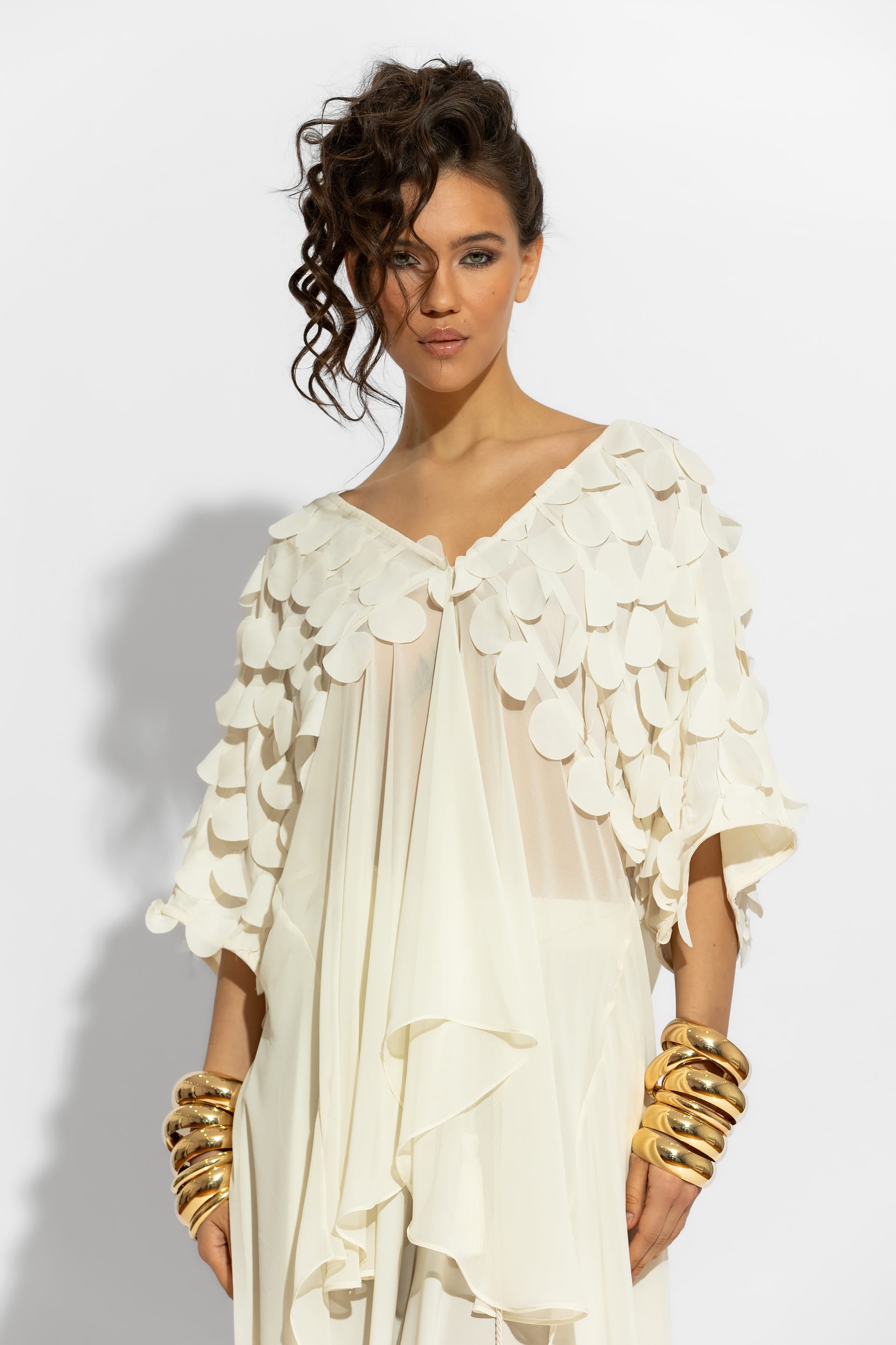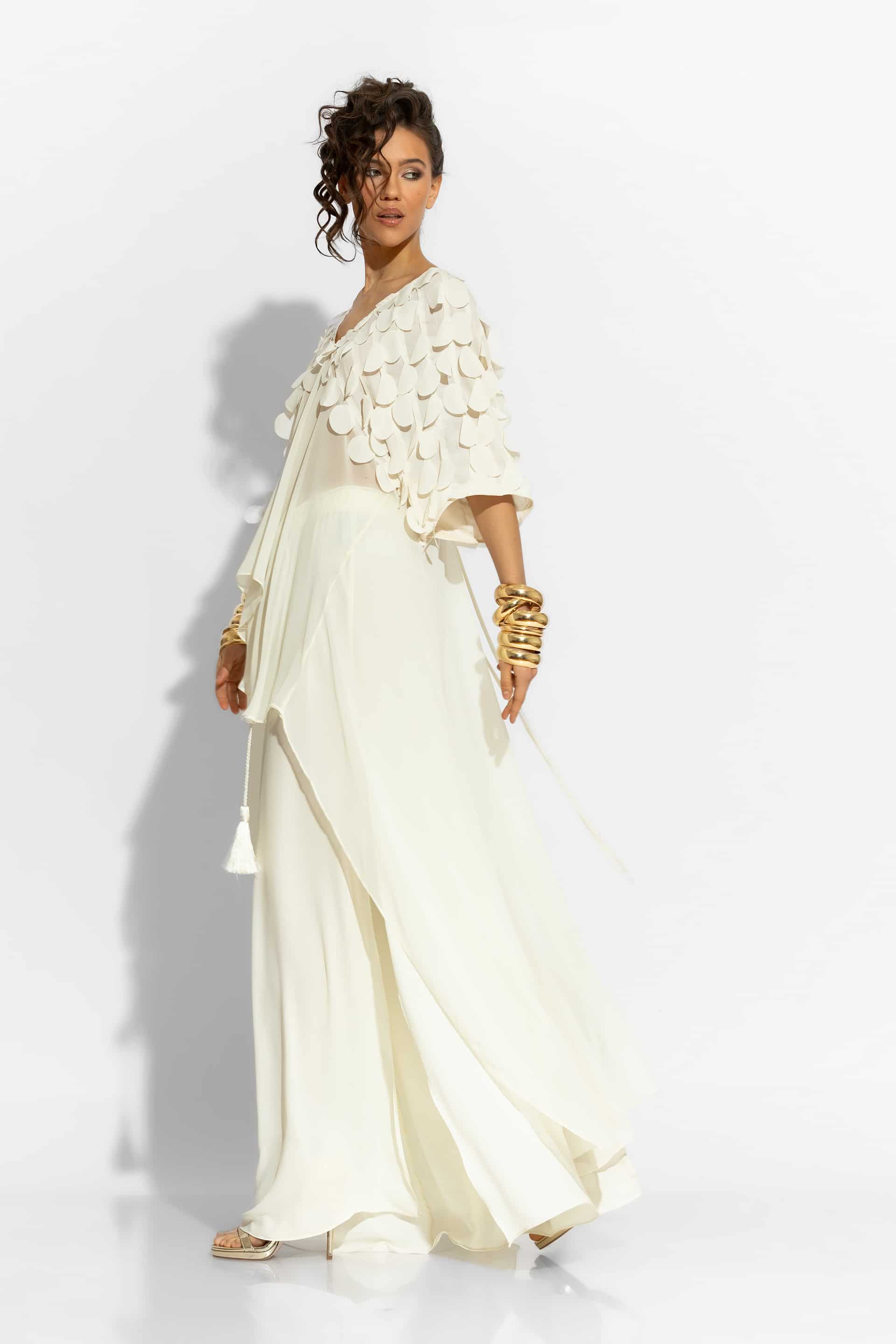 This luxurious blouse is crafted from premium crepe georgette fabric, offering a fluid and elegant silhouette It features a loose asymmetrical fit, with 3D polka dot sleeves that create a sense of effortless movement. A versatile statement piece, perfect for elevating your resort or evening ensemble.