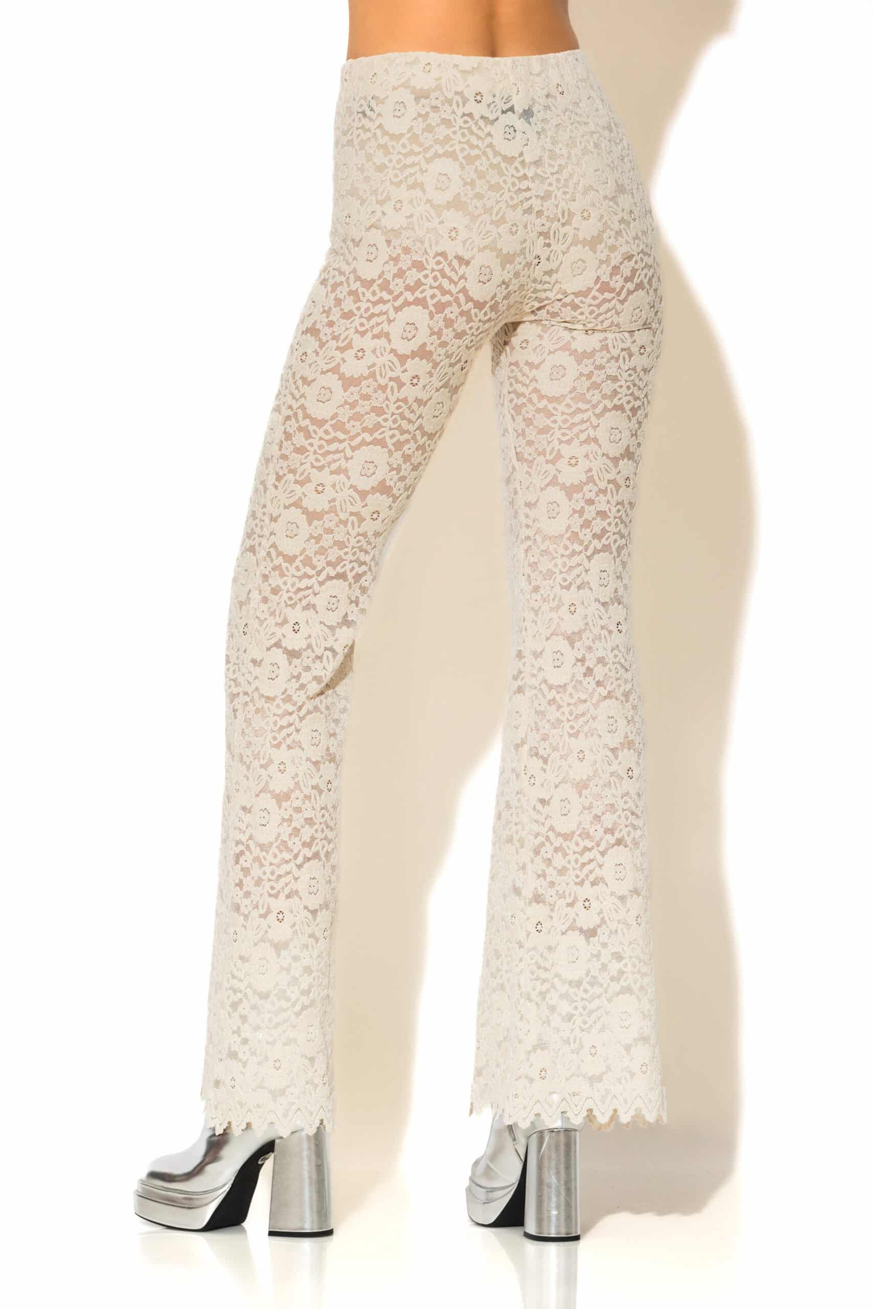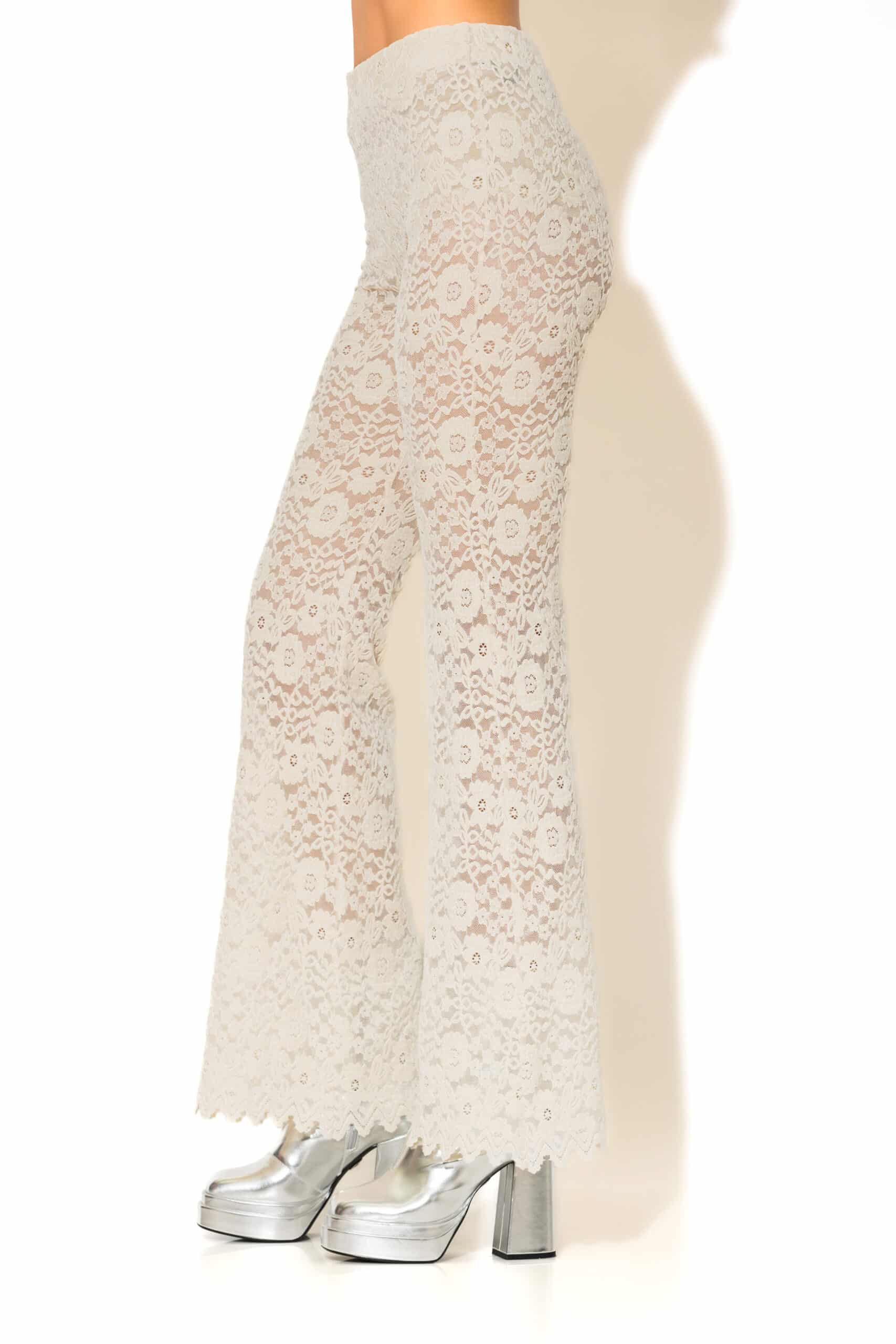 Ημι-διάφανο και εντυπωσιακά κομψό, αυτό το ψηλόμεσο κολάν bell-bottom από flocked δαντέλα αγκαλιάζει το σώμα και χαρίζει θεαματικό άνοιγμα στο τελείωμα. Σχεδιασμένο χωρίς φερμουάρ για καθαρή εφαρμογή, συνδυάζει άνεση με statement ύφος, ιδανικό για βραδινές και cocktail εμφανίσεις.