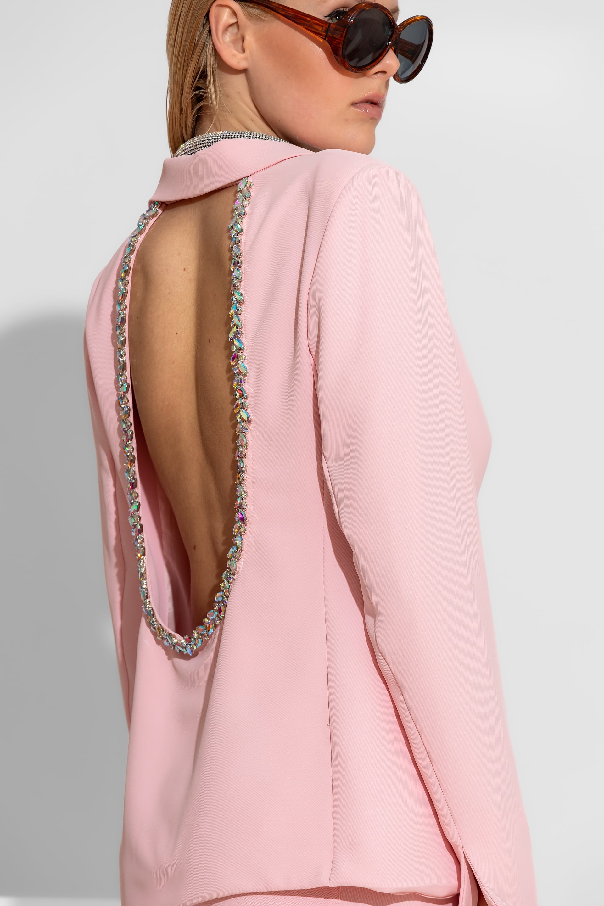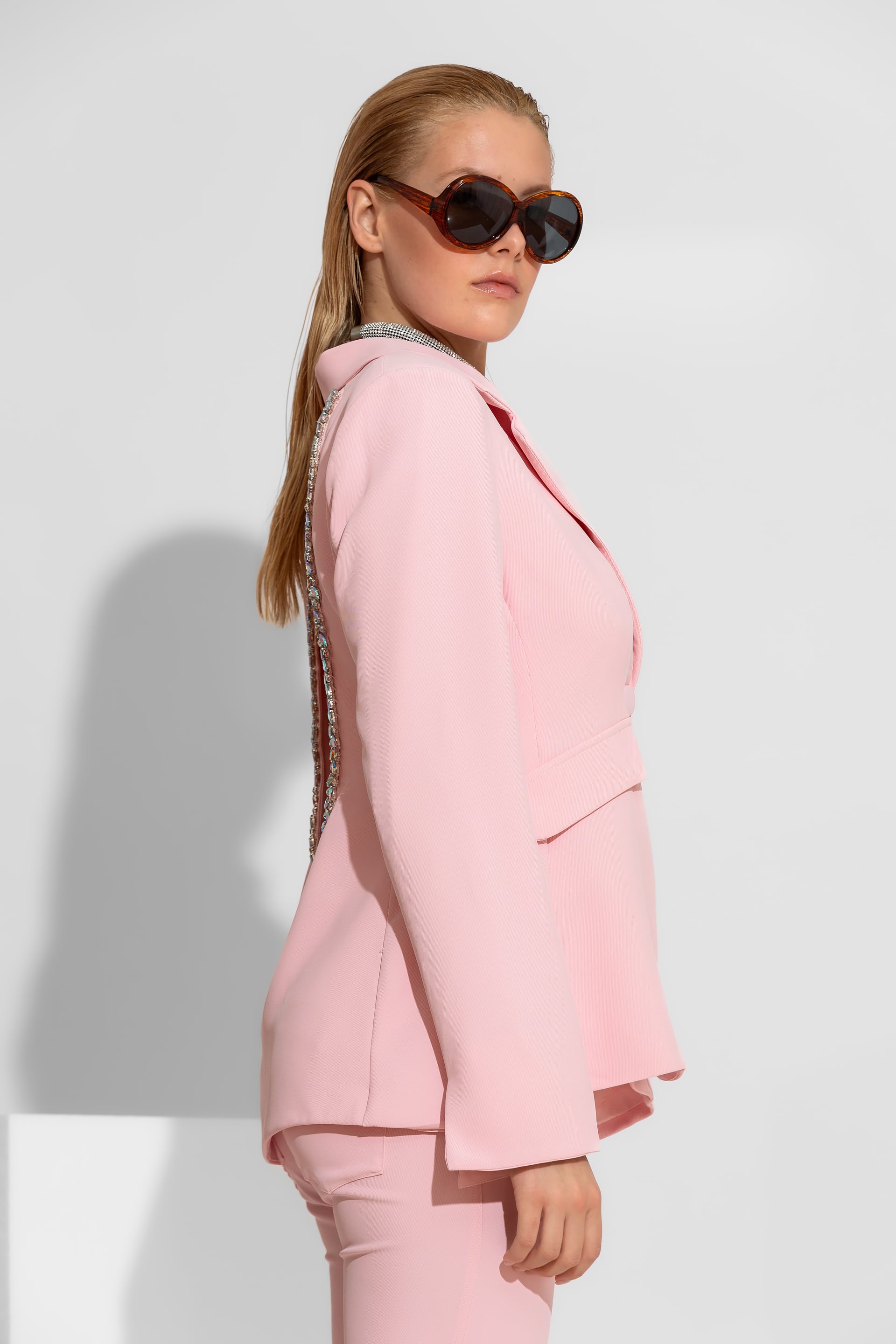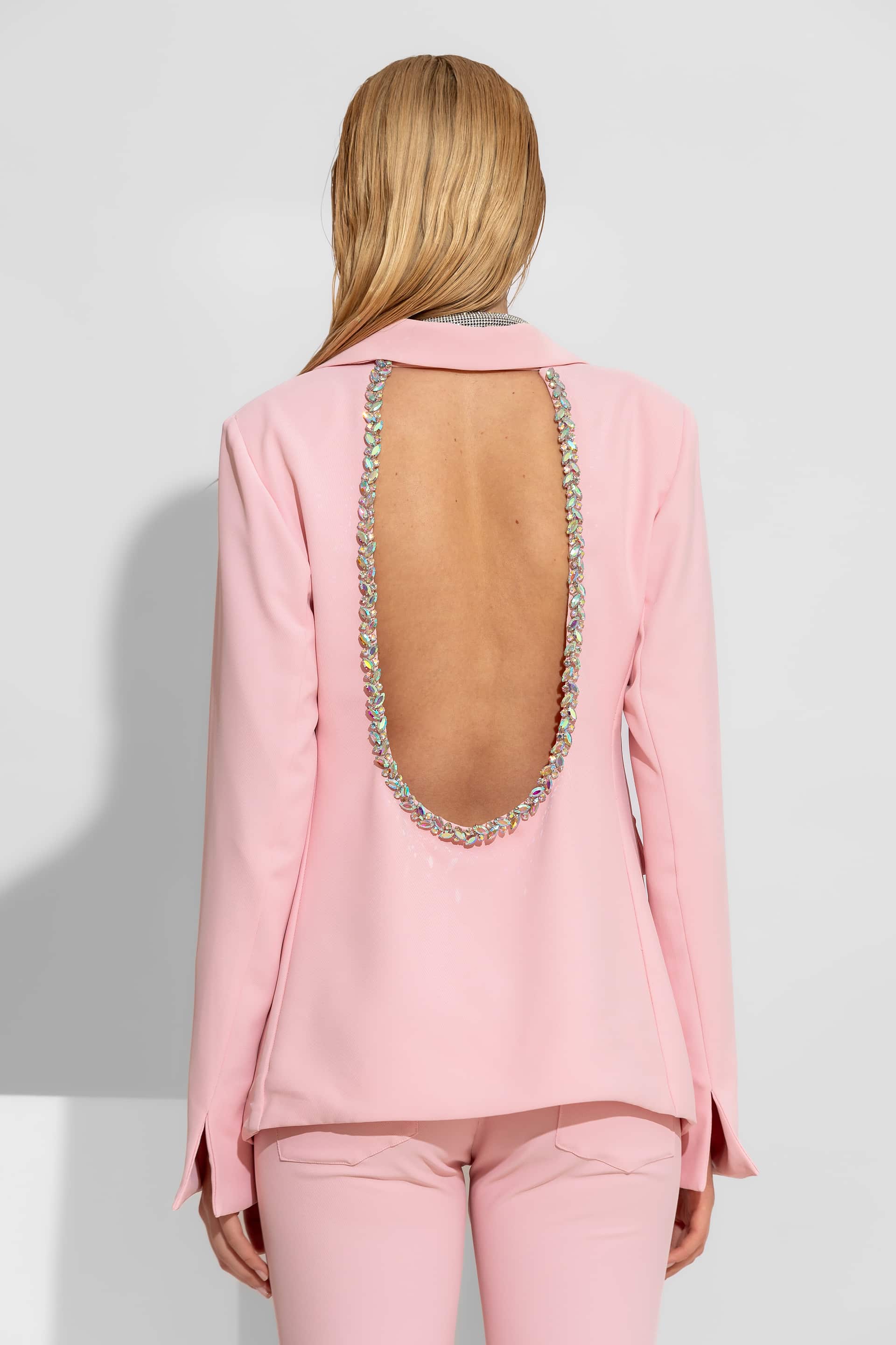 Ένας εντυπωσιακός συνδυασμός κλασικής ραπτικής και τολμηρού σχεδιασμού, το σακάκι είναι κατασκευασμένο από υψηλής ποιότητας κρεπ ύφασμα. Ενώ μπροστά παρουσιάζει ένα σοφιστικέ, δομημένο blazer με κλείσιμο με ένα κουμπί και κομψά πέτα, η πίσω όψη αποκαλύπτει μια εντυπωσιακή βαθιά ανοιχτή πλάτη που πλαισιώνεται από λαμπερές κρυστάλλινες λεπτομέρειες. Ένα αληθινό statement κομμάτι για επίσημες εμφανίσεις με υψηλή αισθητική.