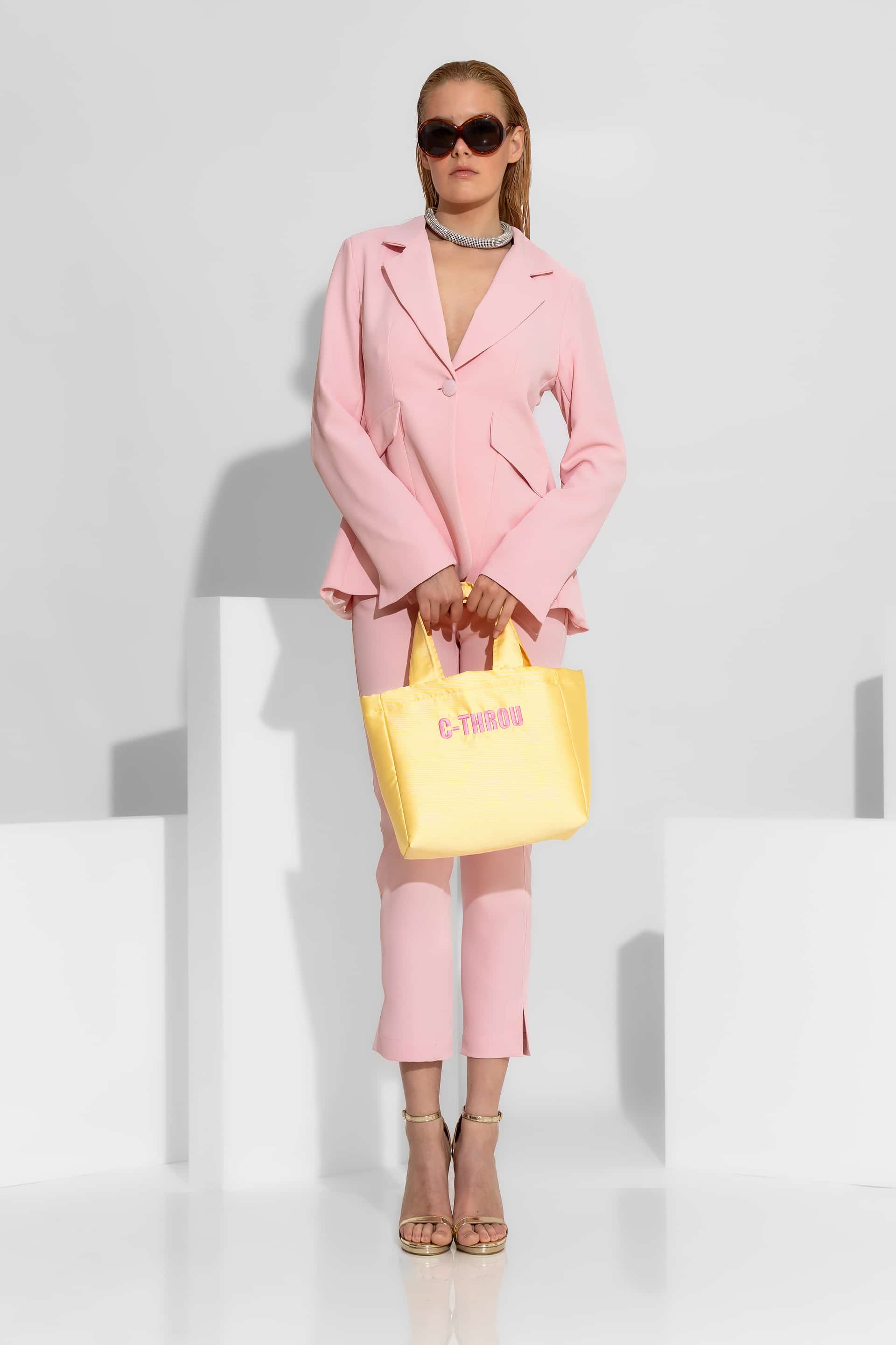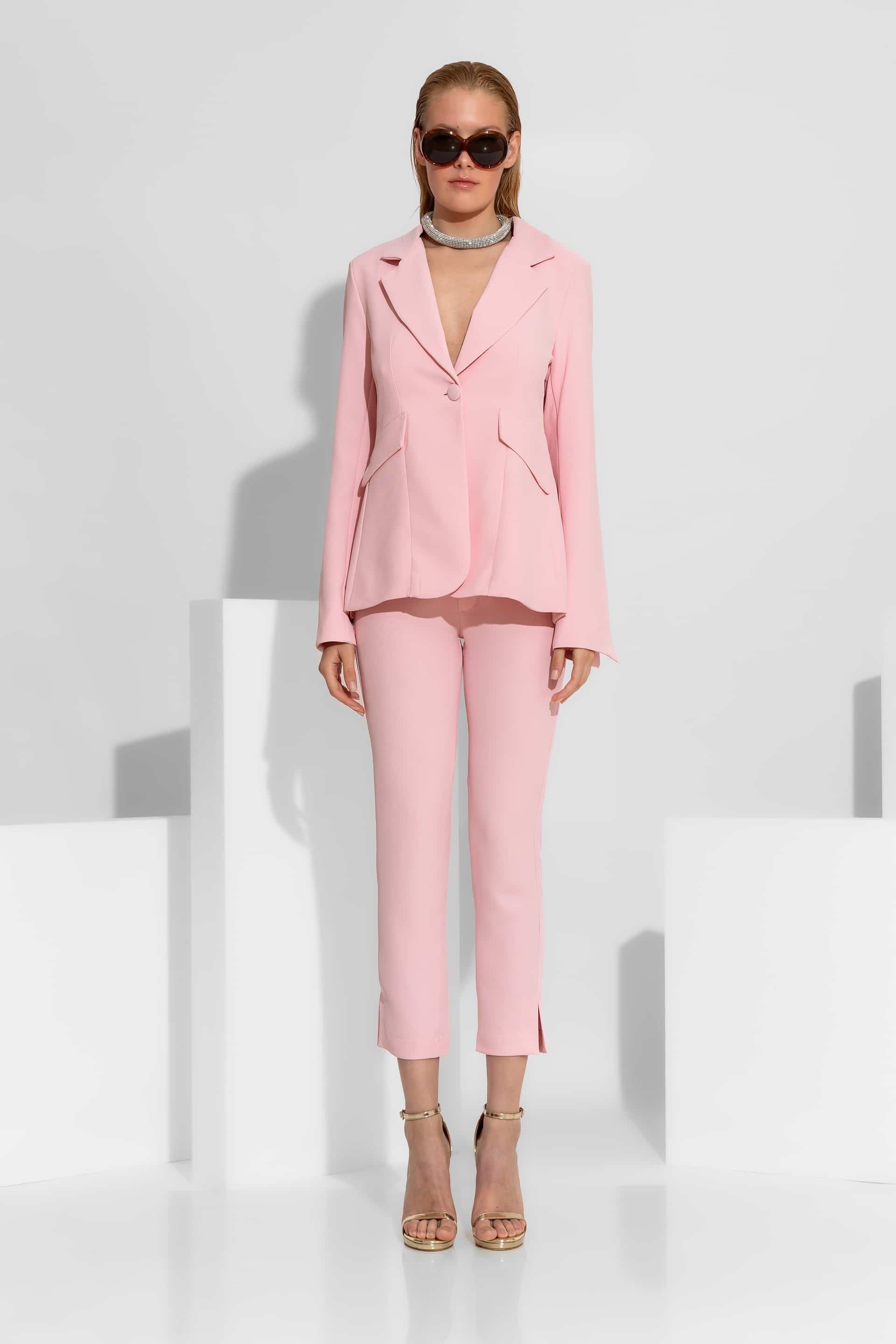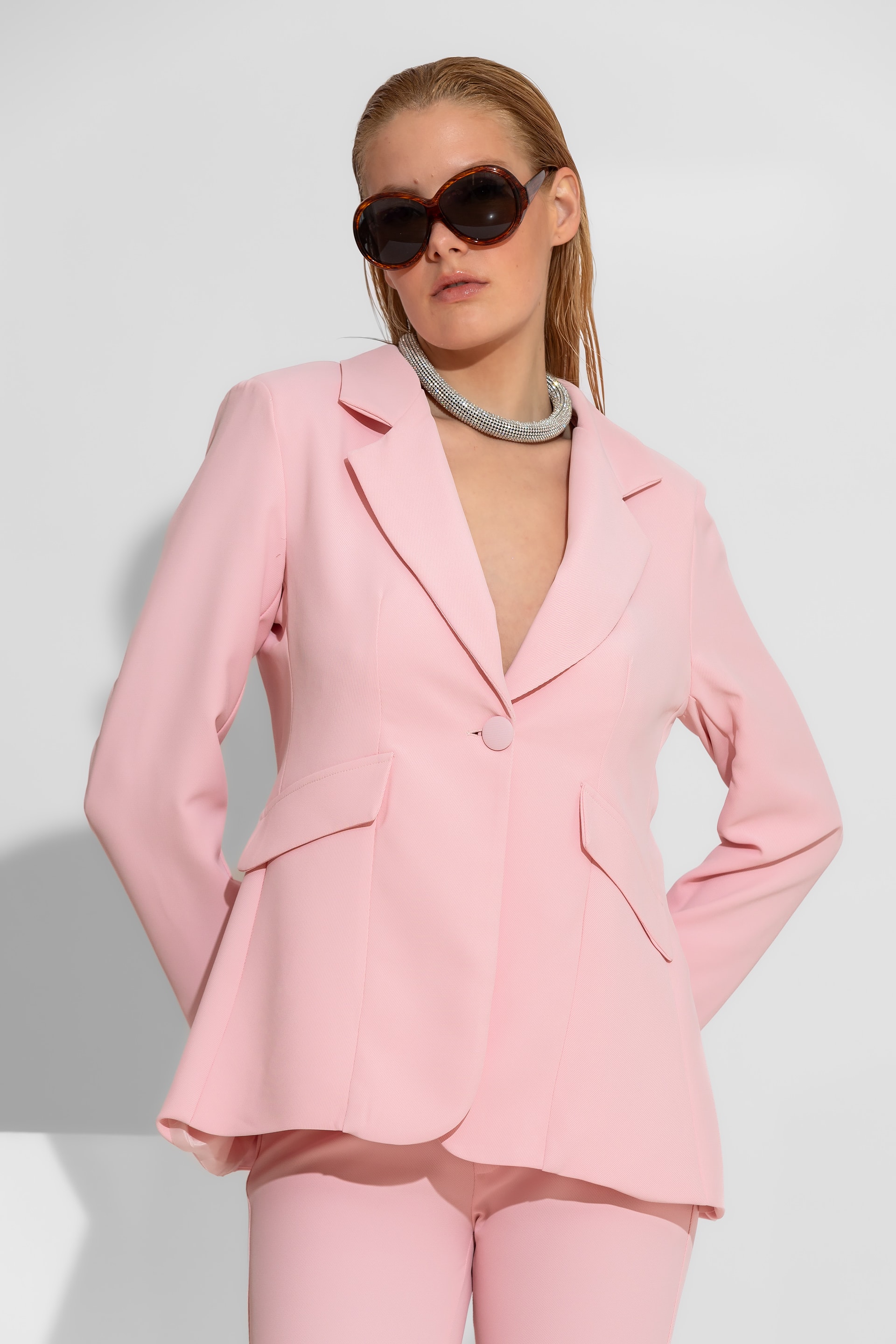 Ένας εντυπωσιακός συνδυασμός κλασικής ραπτικής και τολμηρού σχεδιασμού, το σακάκι είναι κατασκευασμένο από υψηλής ποιότητας κρεπ ύφασμα. Ενώ μπροστά παρουσιάζει ένα σοφιστικέ, δομημένο blazer με κλείσιμο με ένα κουμπί και κομψά πέτα, η πίσω όψη αποκαλύπτει μια εντυπωσιακή βαθιά ανοιχτή πλάτη που πλαισιώνεται από λαμπερές κρυστάλλινες λεπτομέρειες. Ένα αληθινό statement κομμάτι για επίσημες εμφανίσεις με υψηλή αισθητική.
