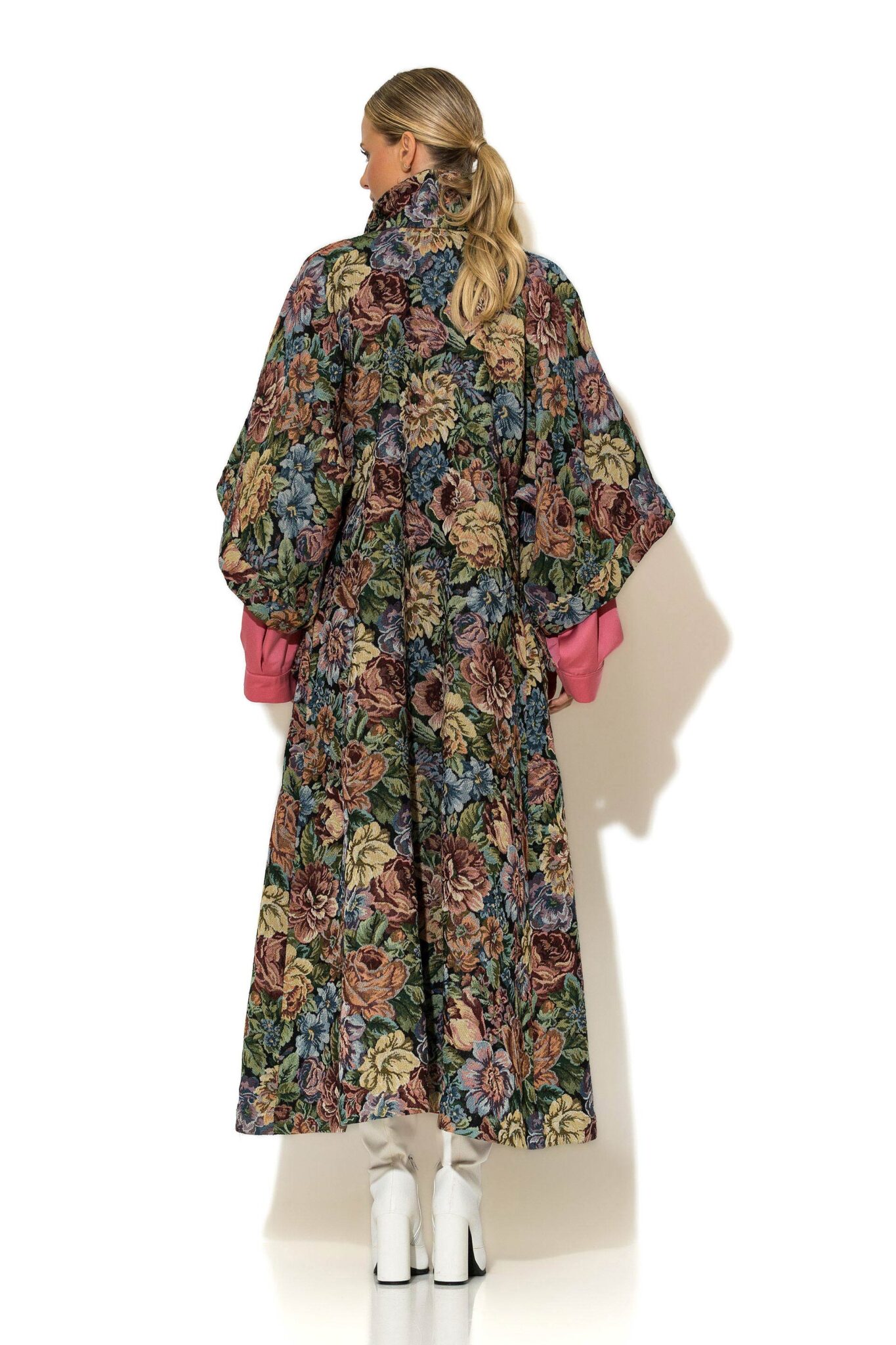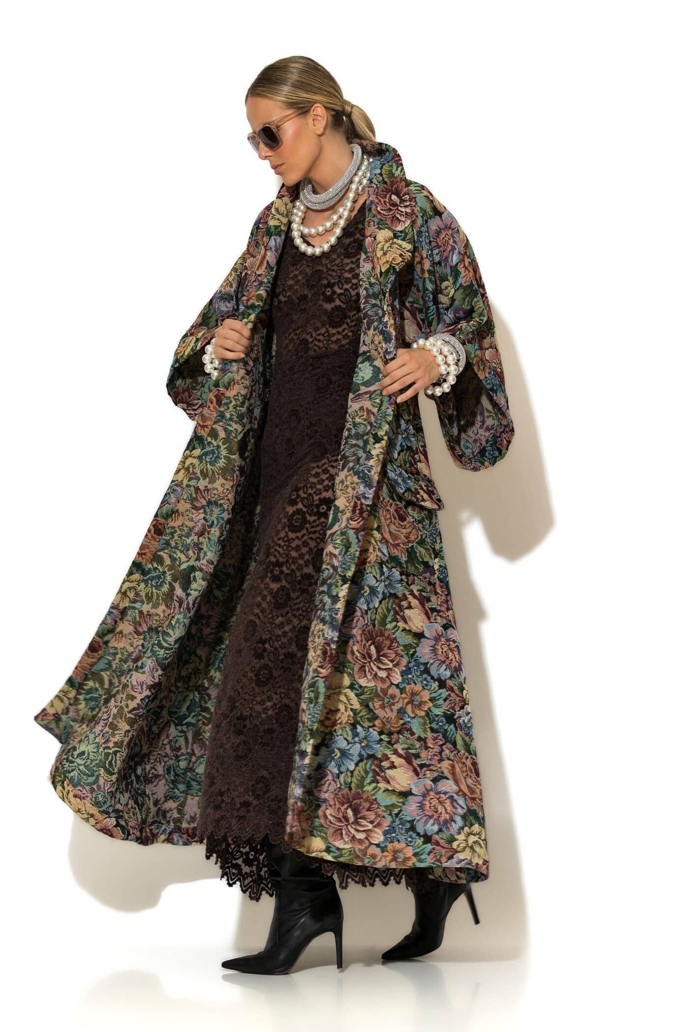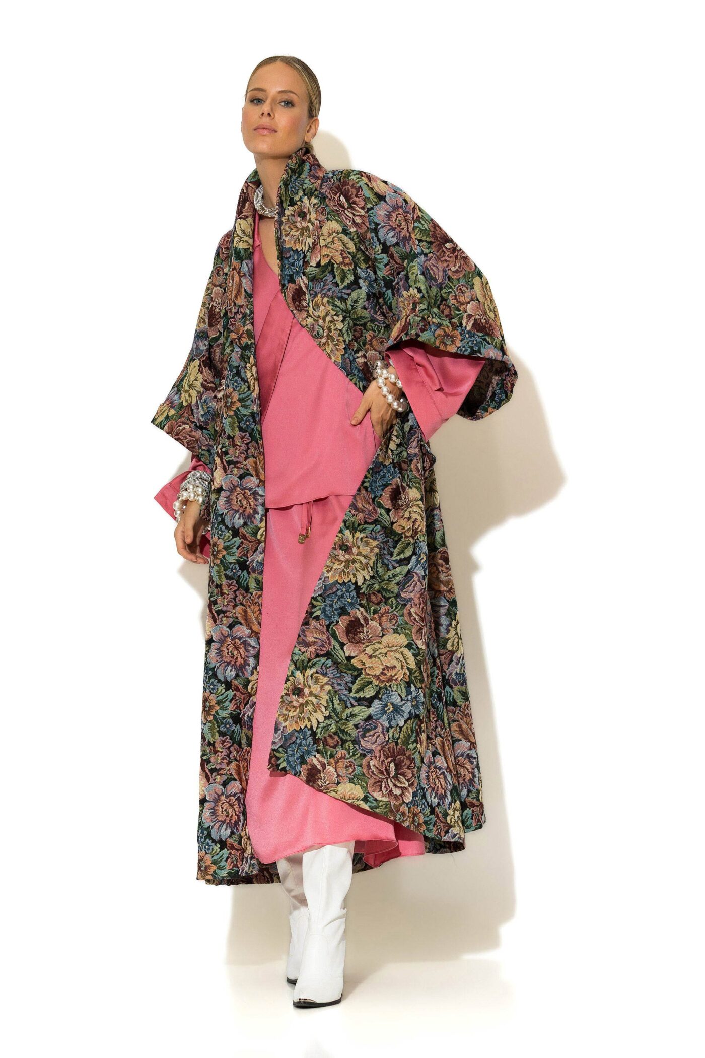 This longline coat in kimono style, crafted from brocade fabric has an oversized loose fit and a floral print making every appearance unique.