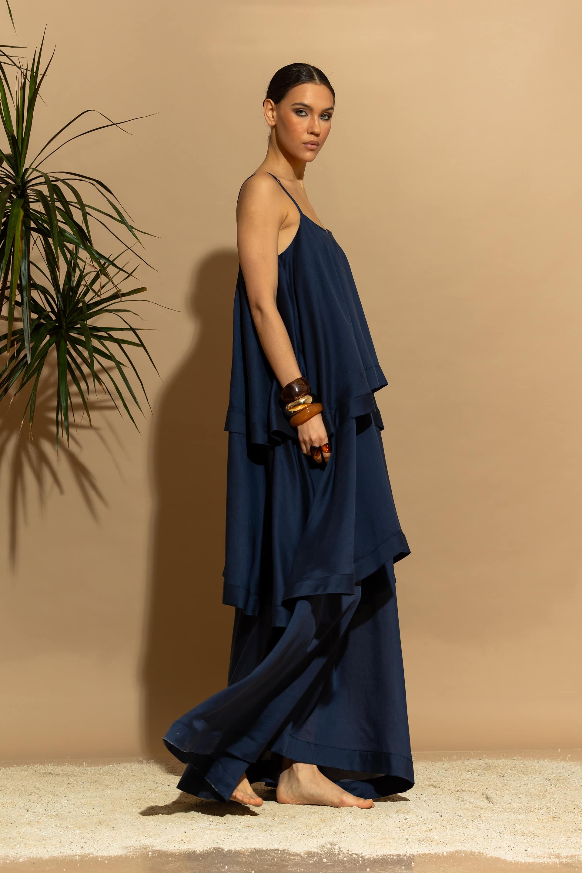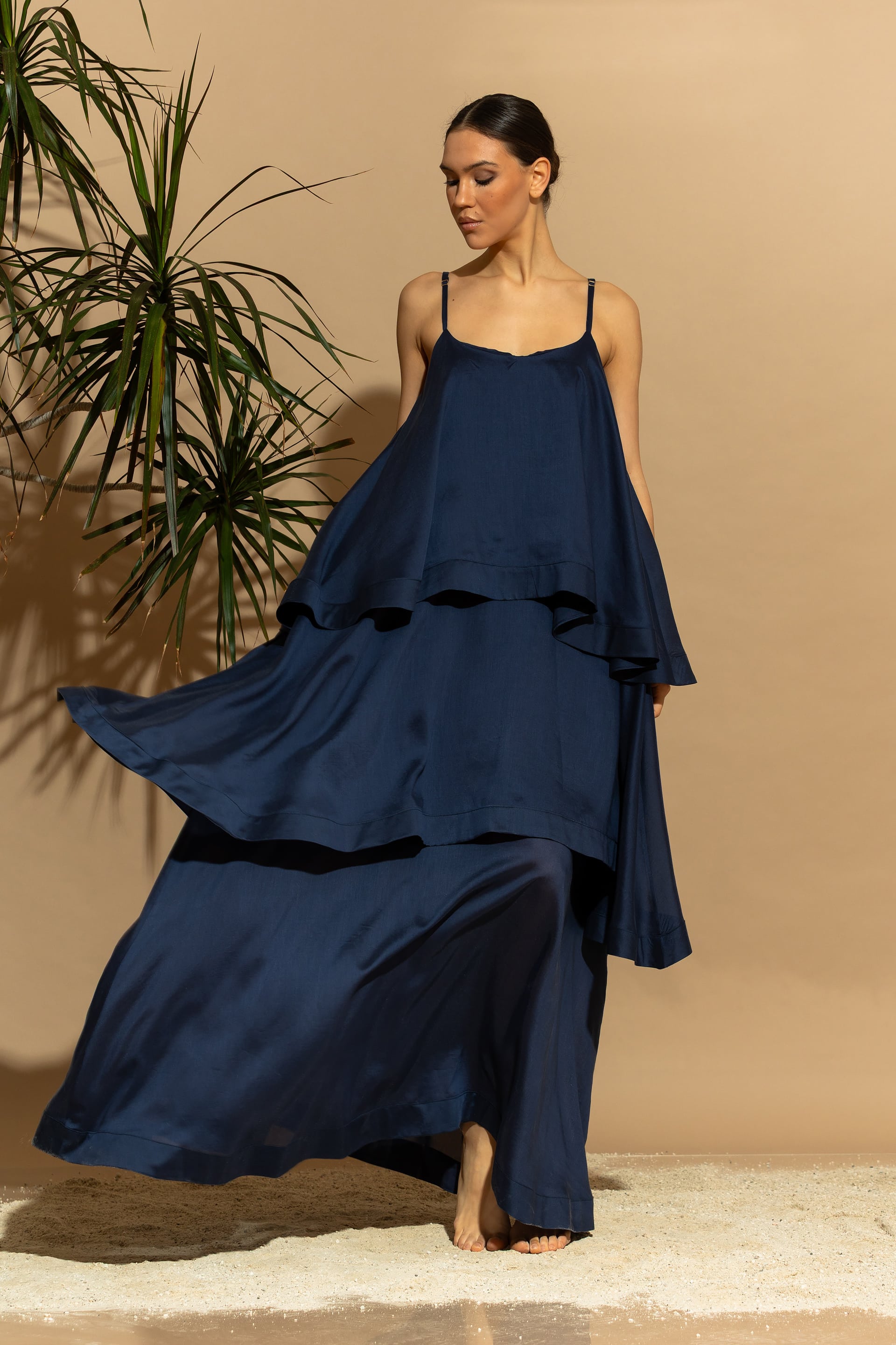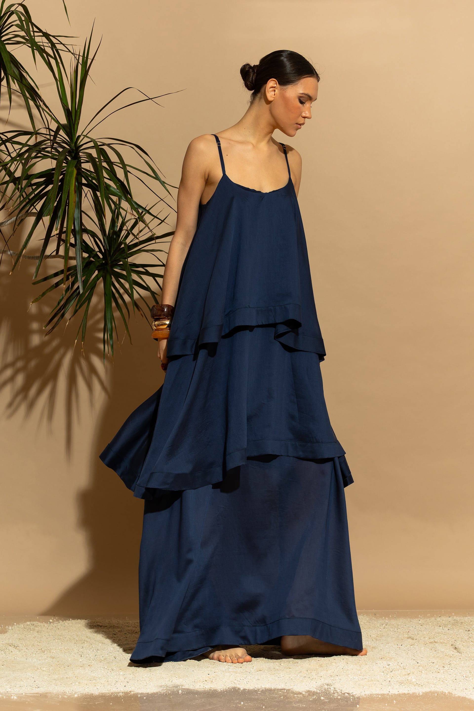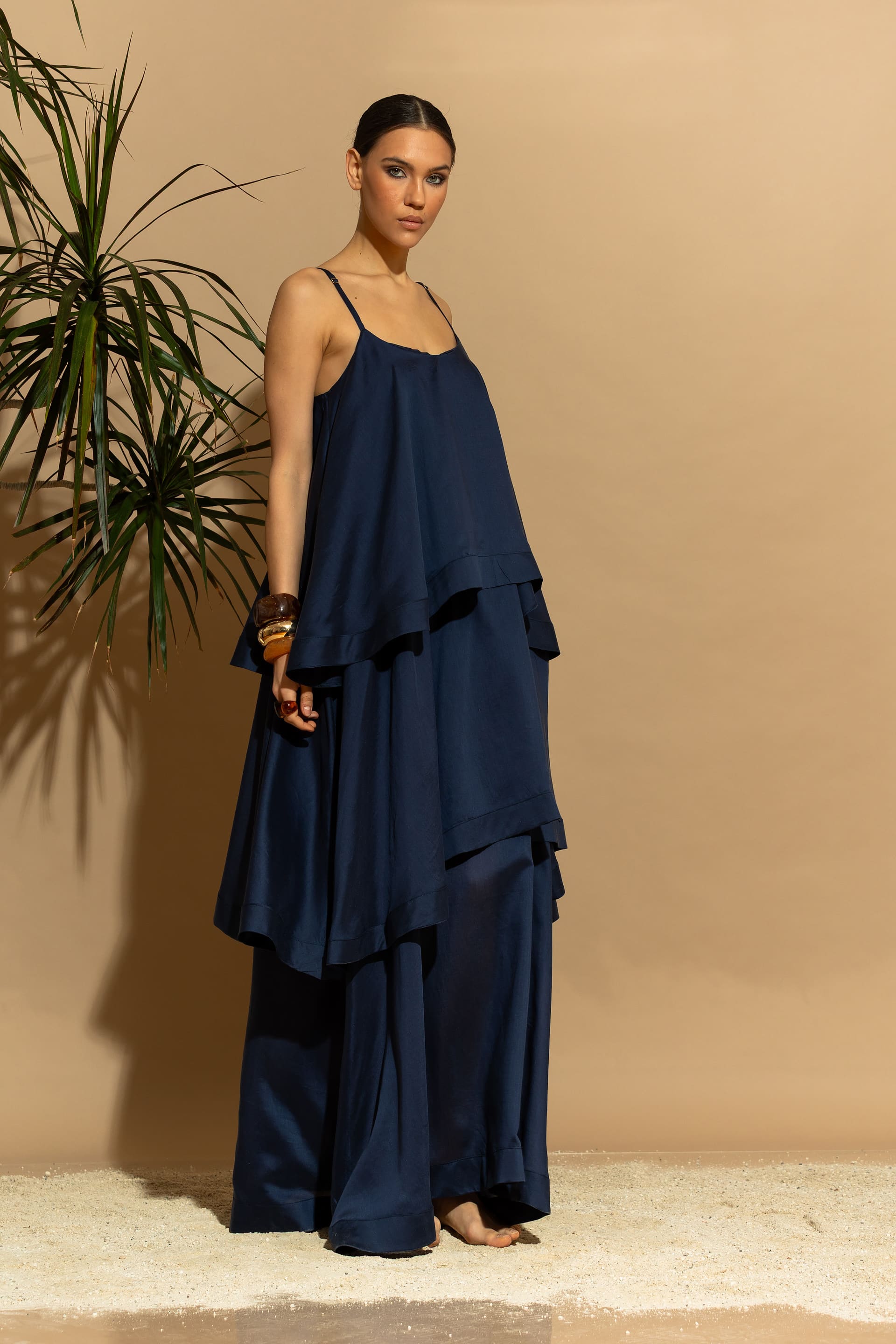 Elevate your summer wardrobe with this stunning, eco-conscious luxury maxi dress. Designed with a tiered ruffled silhouette, it features a sophisticated minimal aesthetic that seamlessly blends two voluminous exterior ruffles with a sheer, double-layered Tencel™ base.