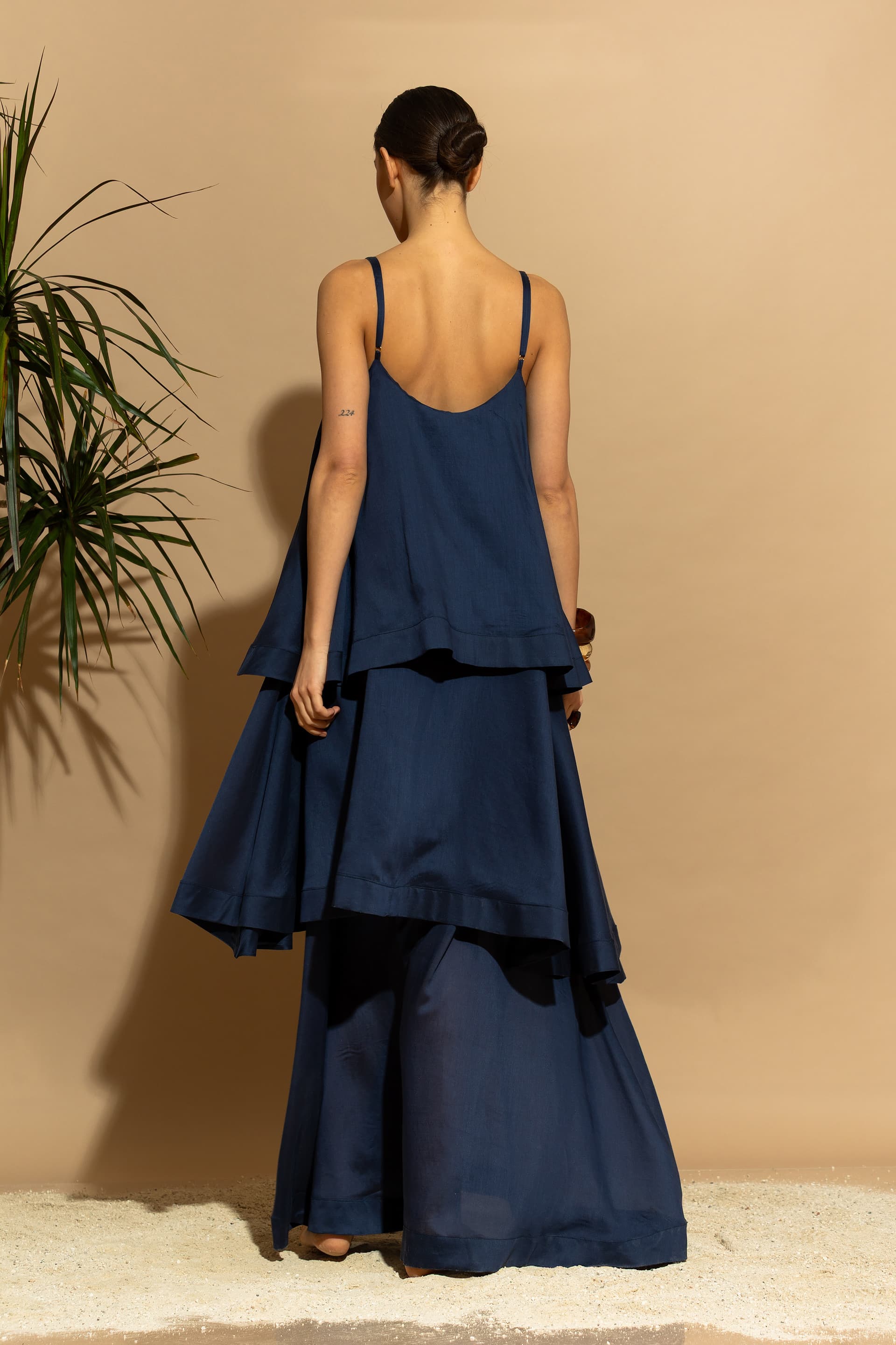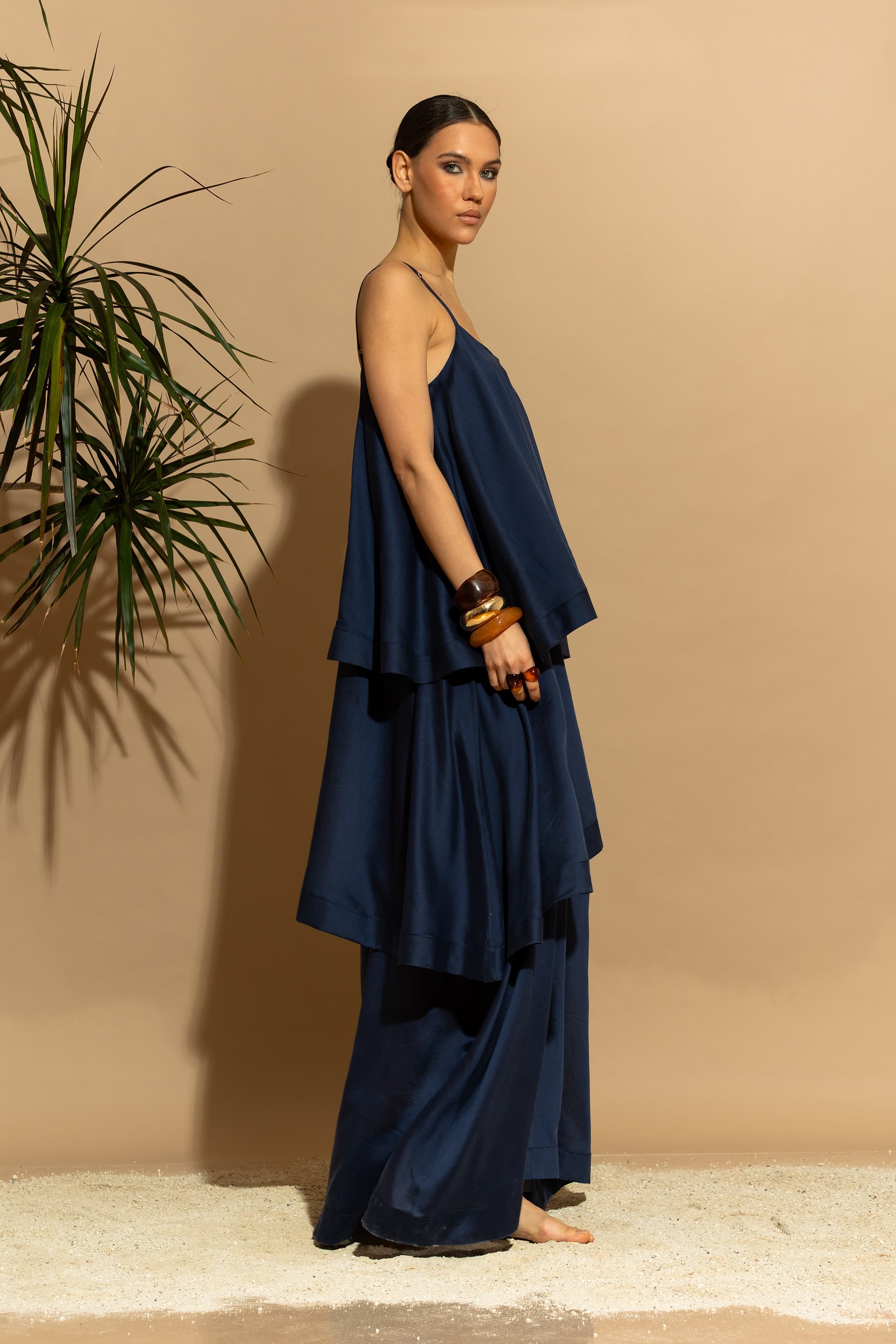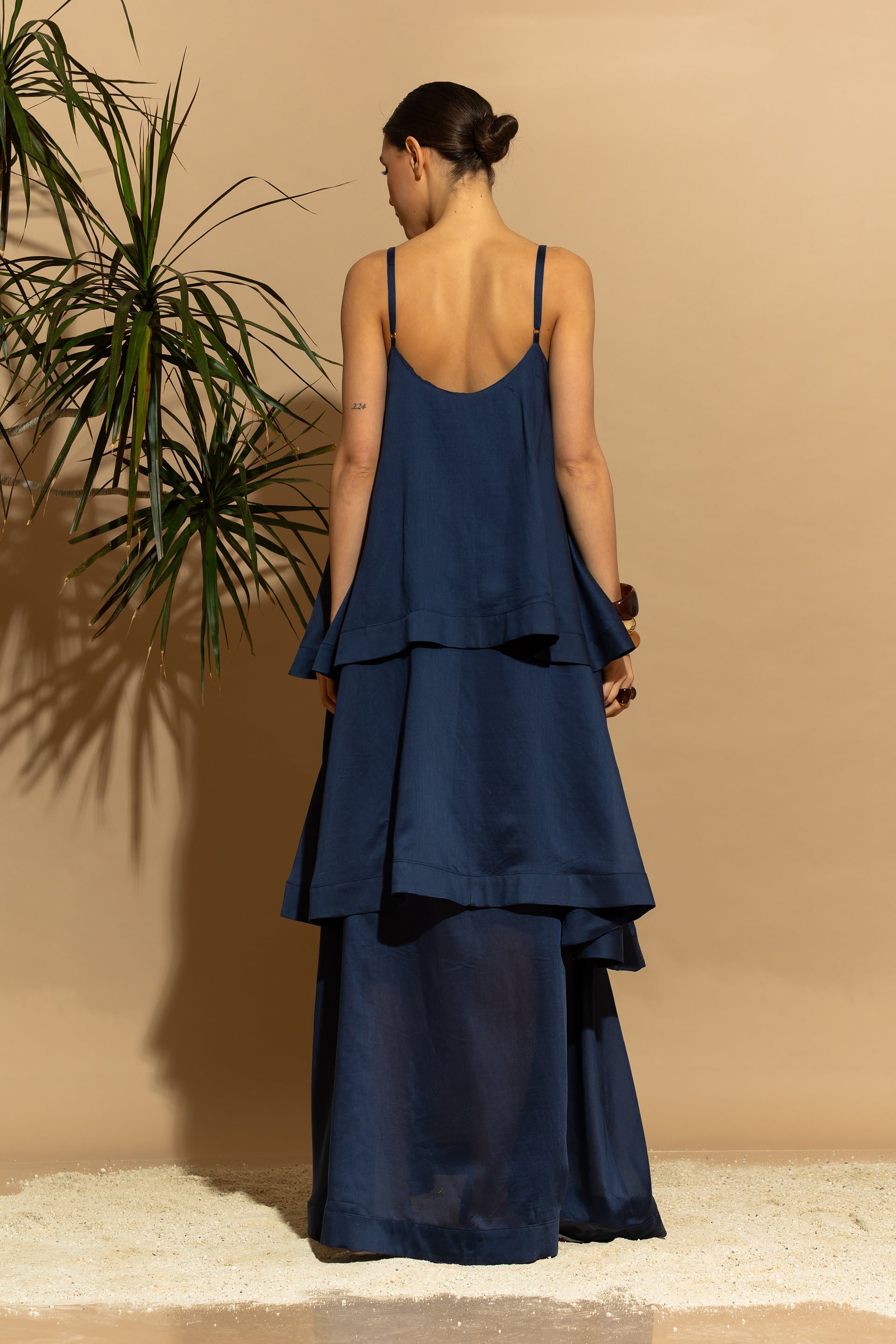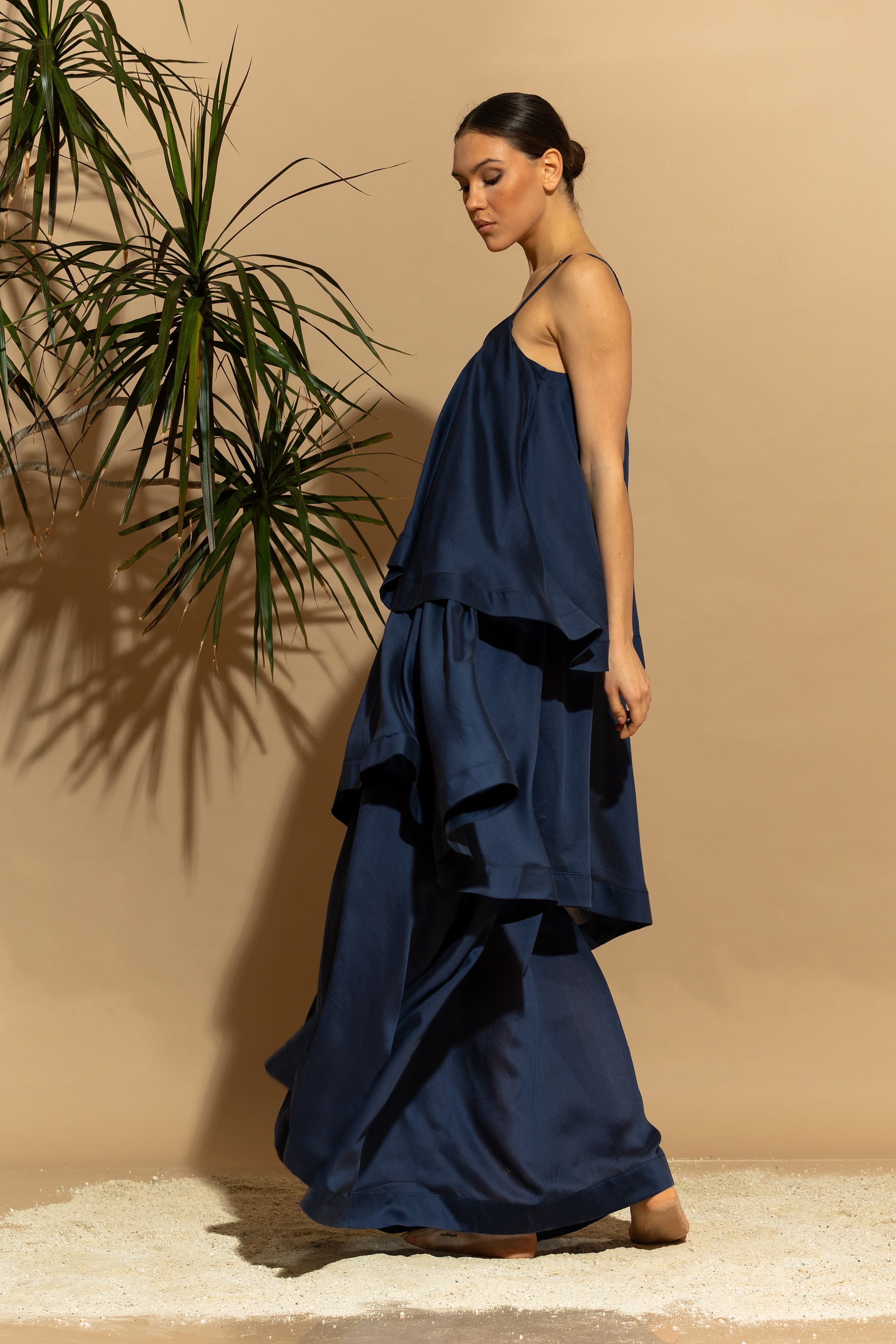 Elevate your summer wardrobe with this stunning, eco-conscious luxury maxi dress. Designed with a tiered ruffled silhouette, it features a sophisticated minimal aesthetic that seamlessly blends two voluminous exterior ruffles with a sheer, double-layered Tencel™ base.