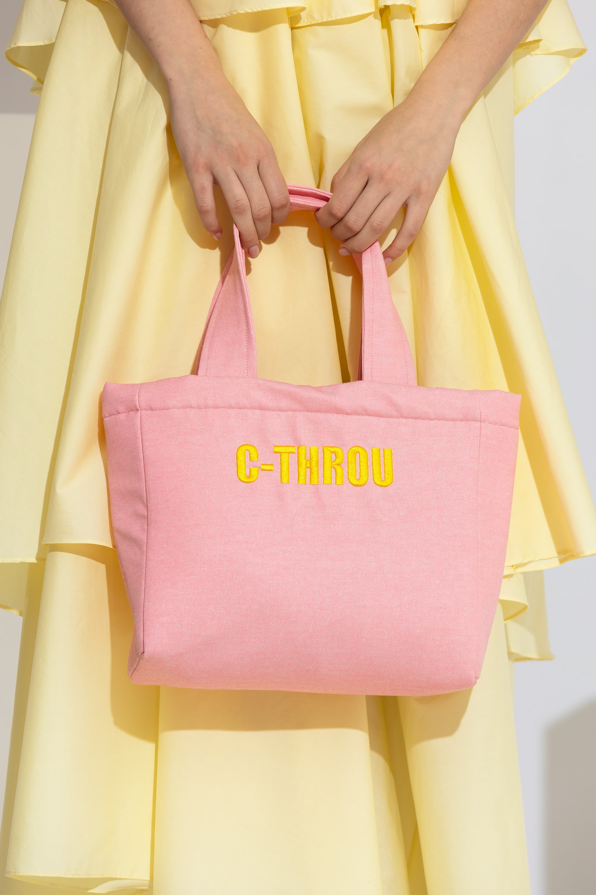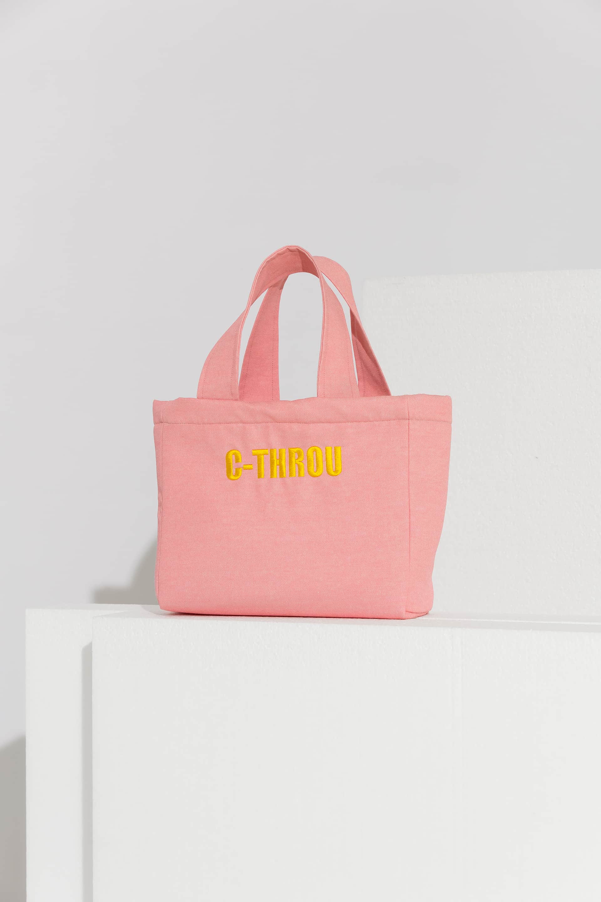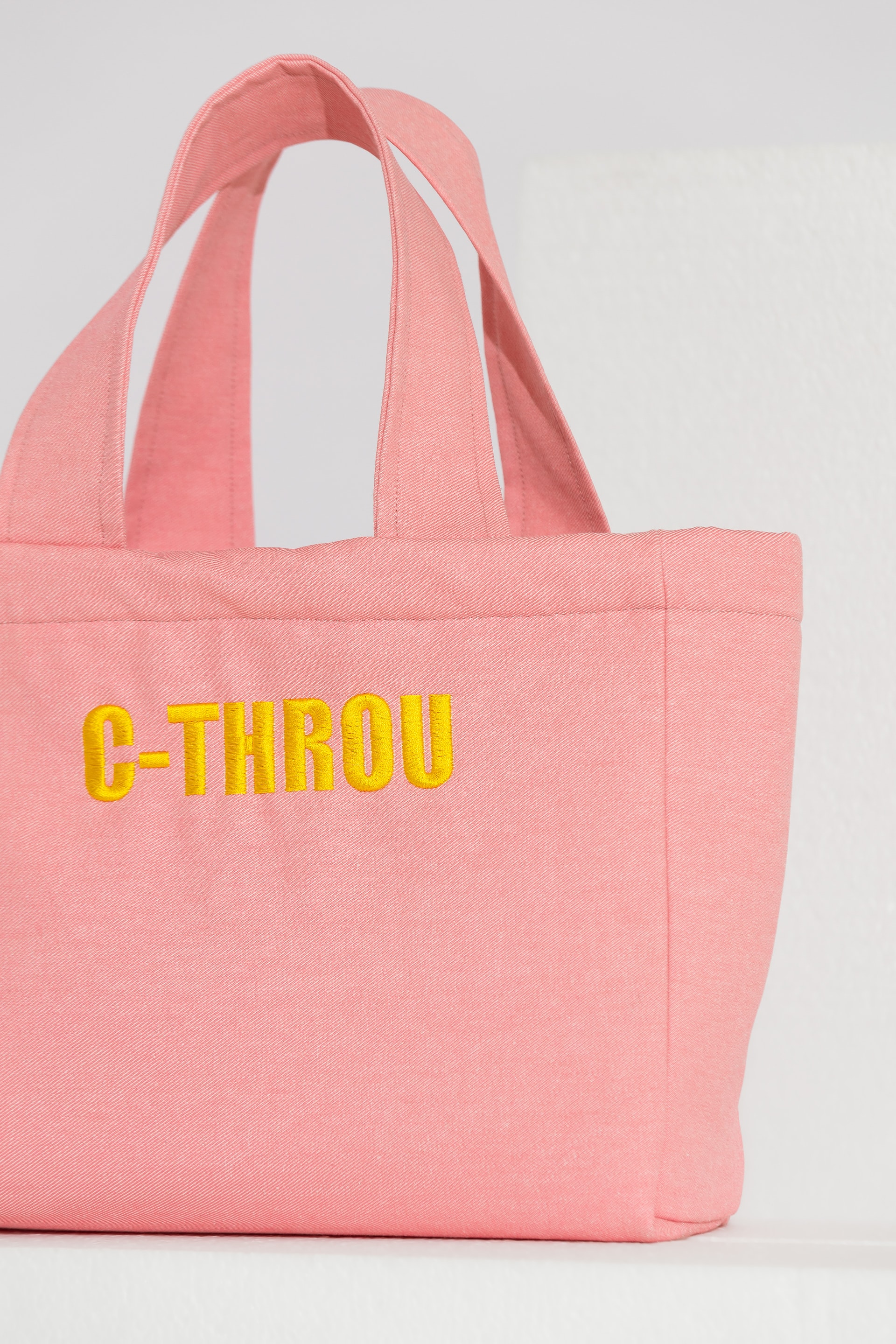 A compact tote bag crafted from structured denim fabric. The design is characterized by a rectangular silhouette, featuring the “C-THROU” logo embroidered in a contrasting color on the front panel. It is finished with tonal denim top handles and a clean interior compartment that holds your essentials with ease. This chic accessory will accompany you on your sun-drenched island escapes and sophisticated city strolls, making it an indispensable part of your summer wardrobe.