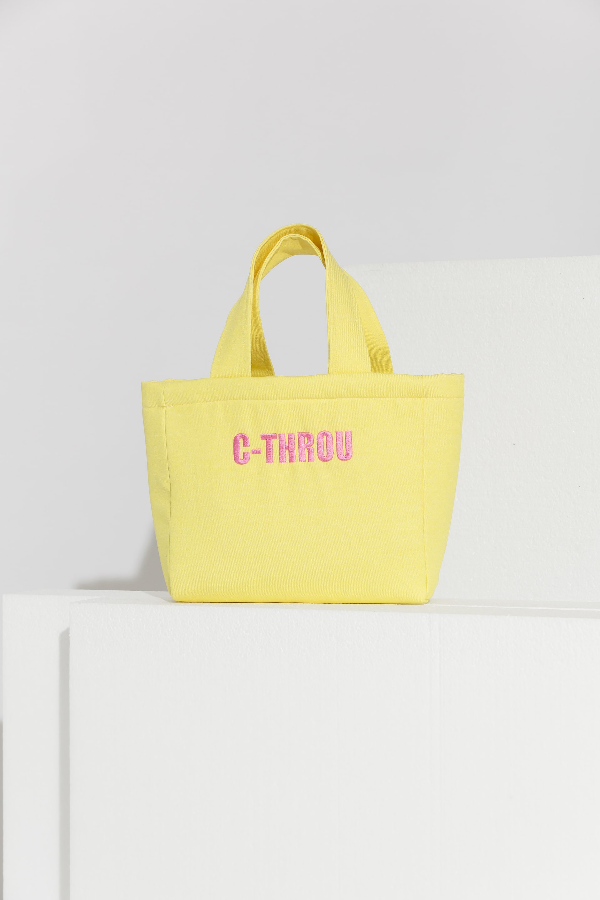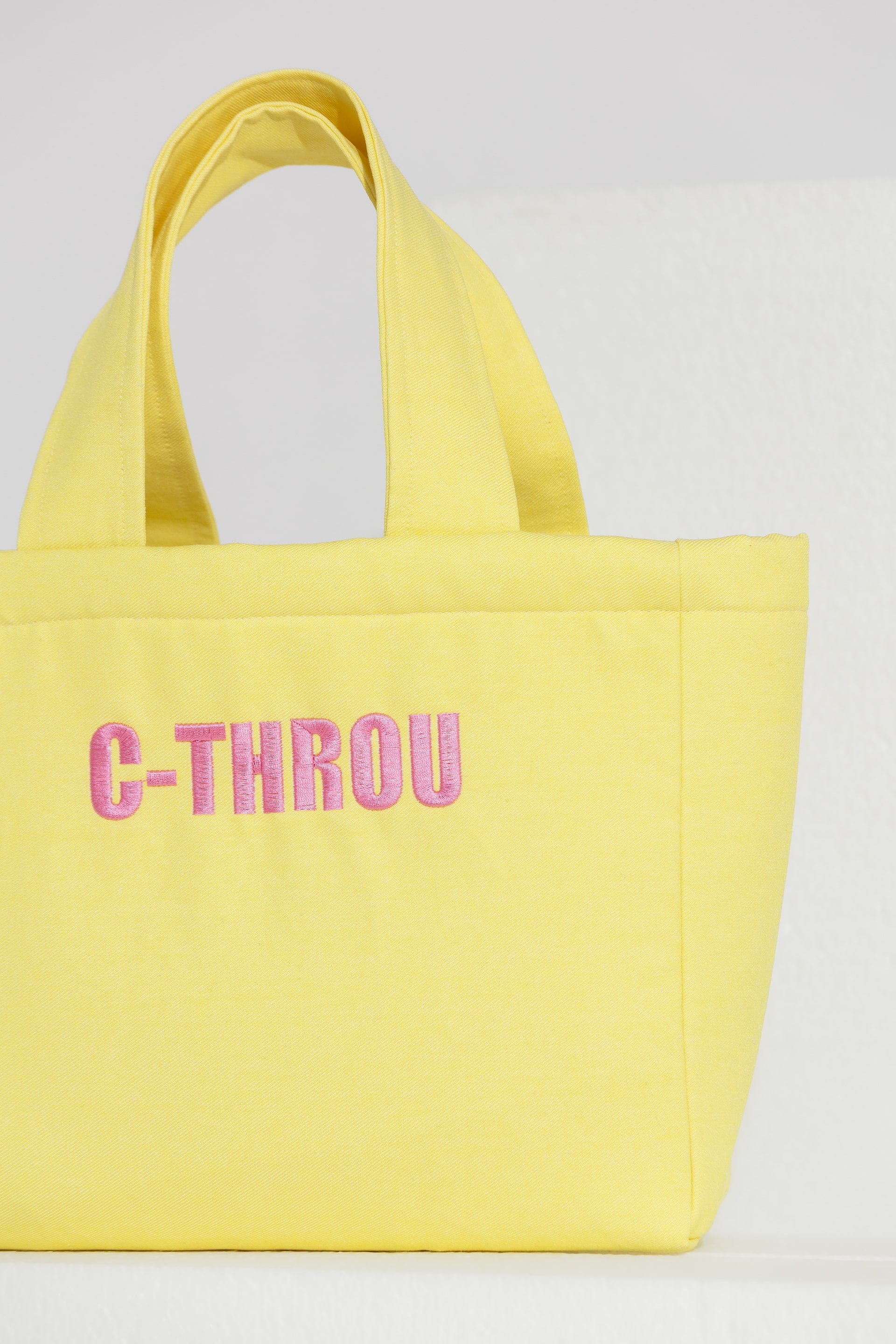 A compact tote bag crafted from structured denim fabric. The design is characterized by a rectangular silhouette, featuring the “C-THROU” logo embroidered in a contrasting color on the front panel. It is finished with tonal denim top handles and a clean interior compartment that holds your essentials with ease. This chic accessory will accompany you on your sun-drenched island escapes and sophisticated city strolls, making it an indispensable part of your summer wardrobe.