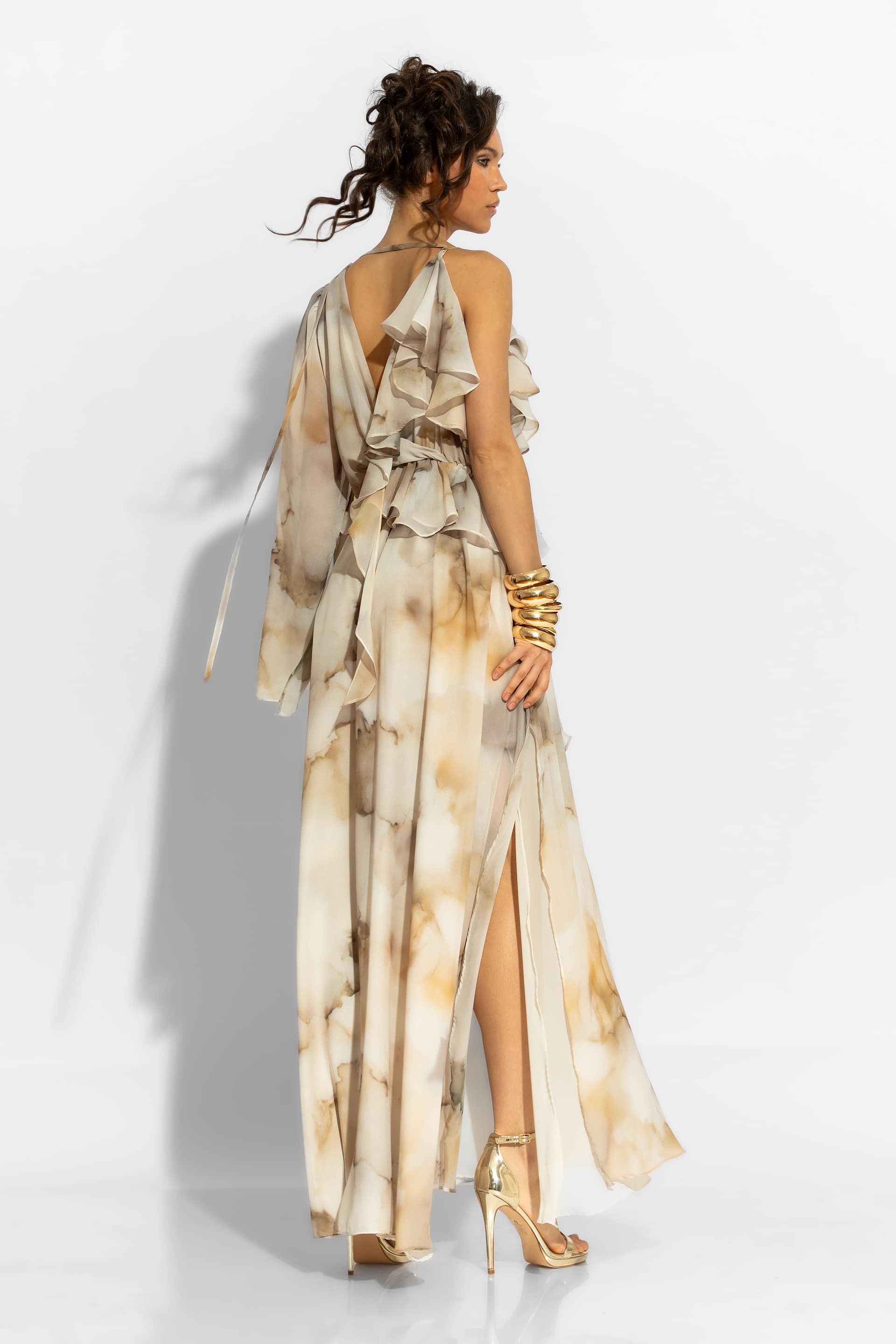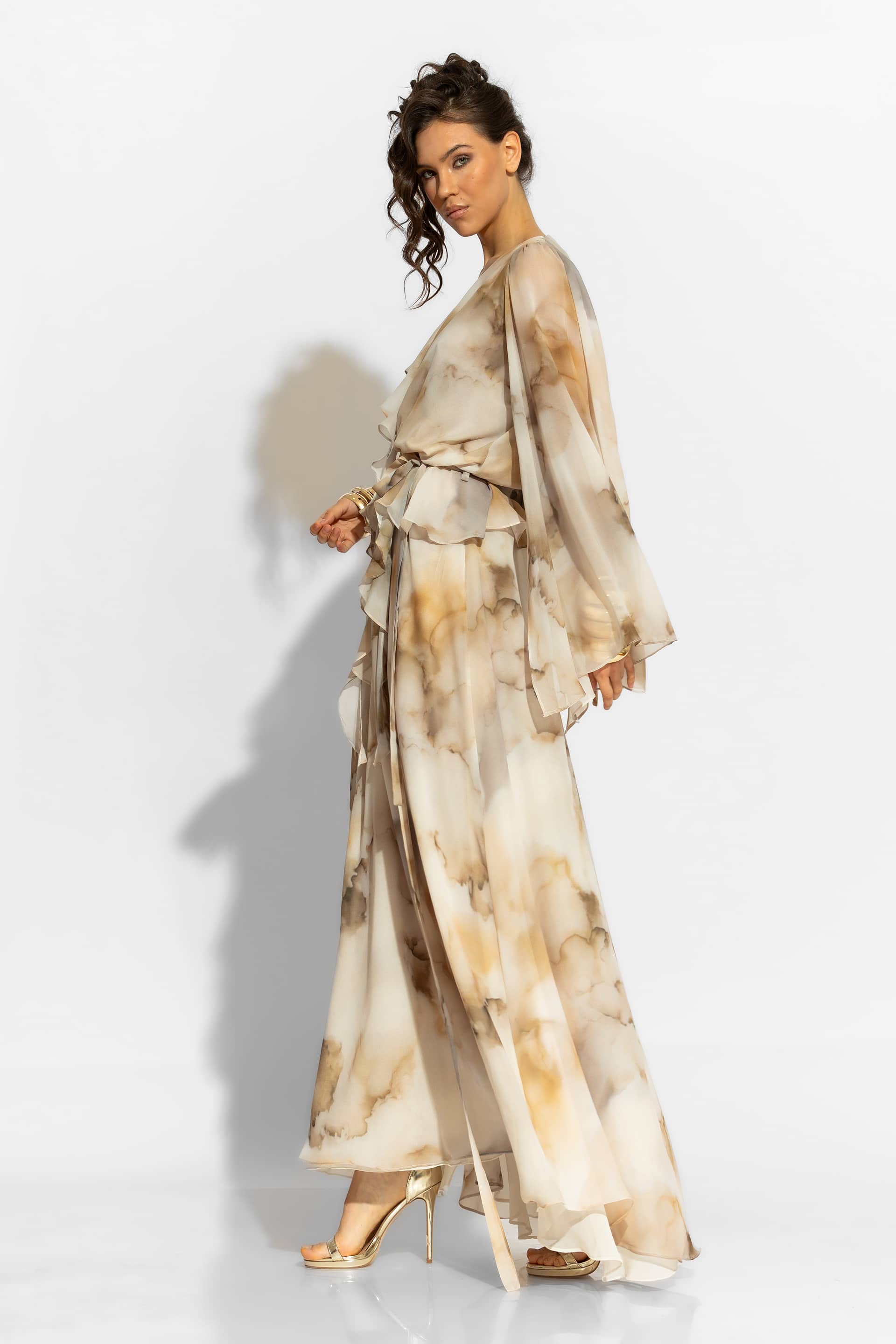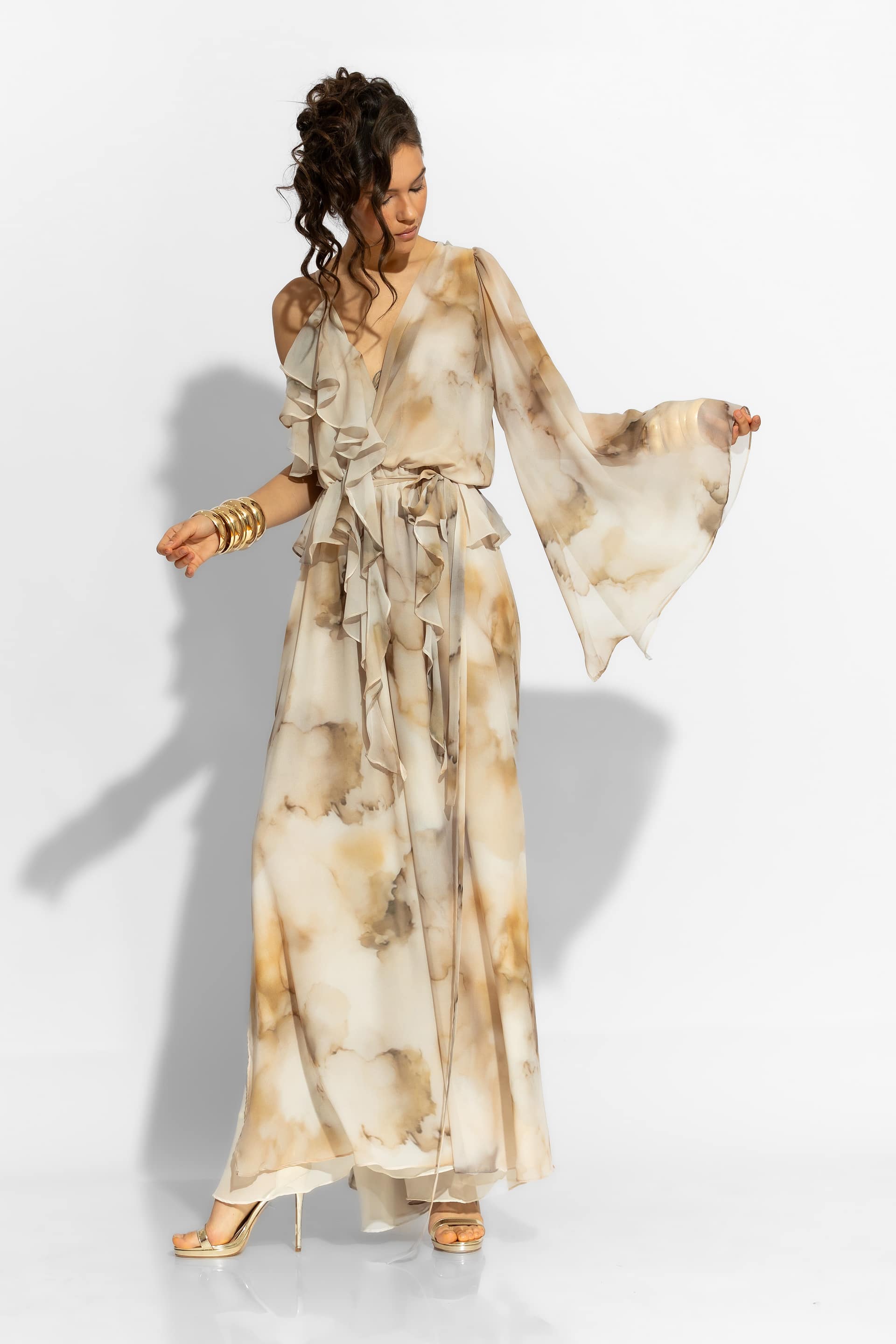 This modern elegant ruffled silhouette gown with delicate abstract chiffon print elevates every occasion. Featuring a dramatic wide ruffled bell sleeve and ruffled wrapped bodice flatters every silhouette. Double chiffon layering and elasticated waist for better fit. This maxi dress exudes bohemian luxury with its voluminous silhouette and fluid movement, making it an ideal choice for high-end summer events and evening appearances.