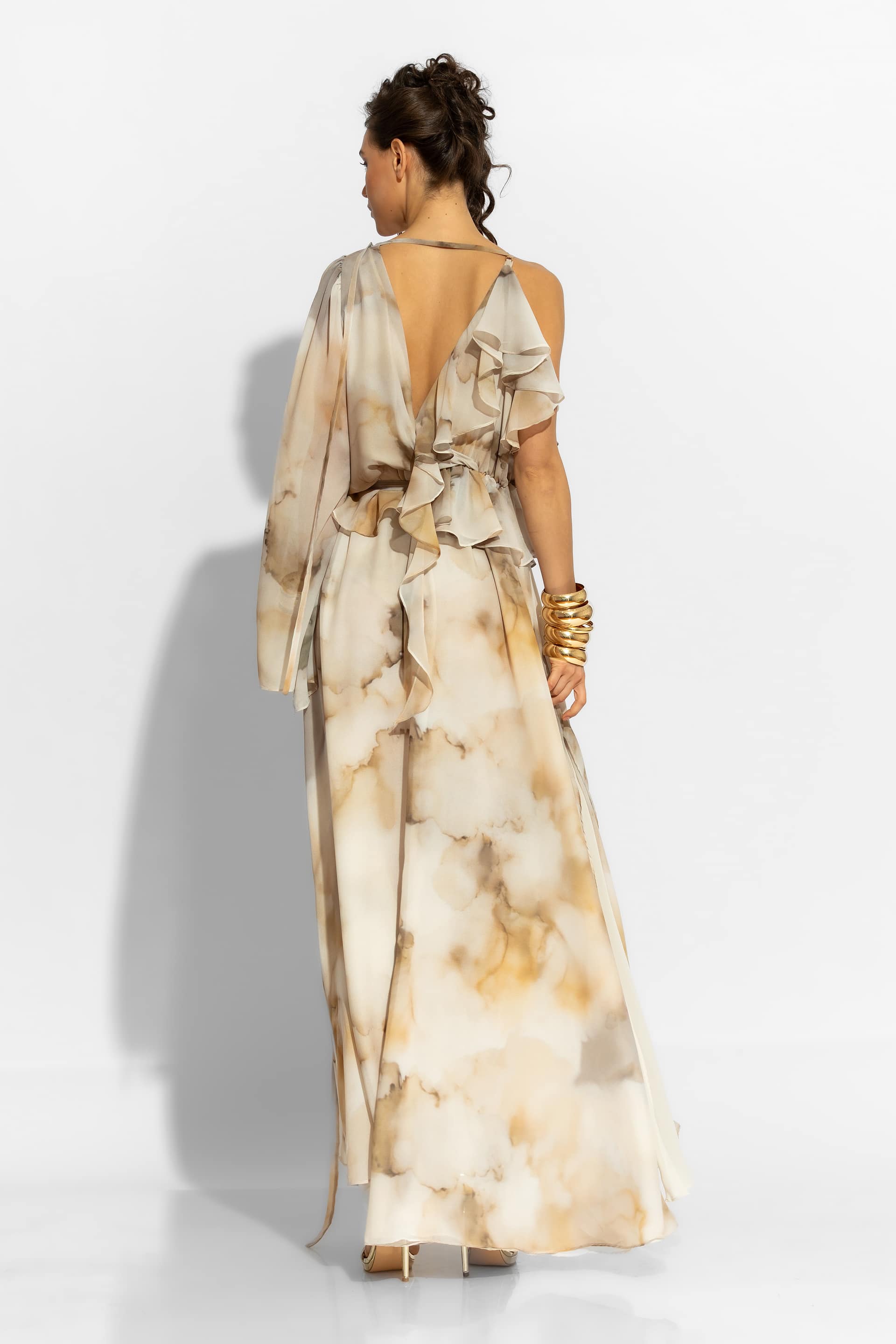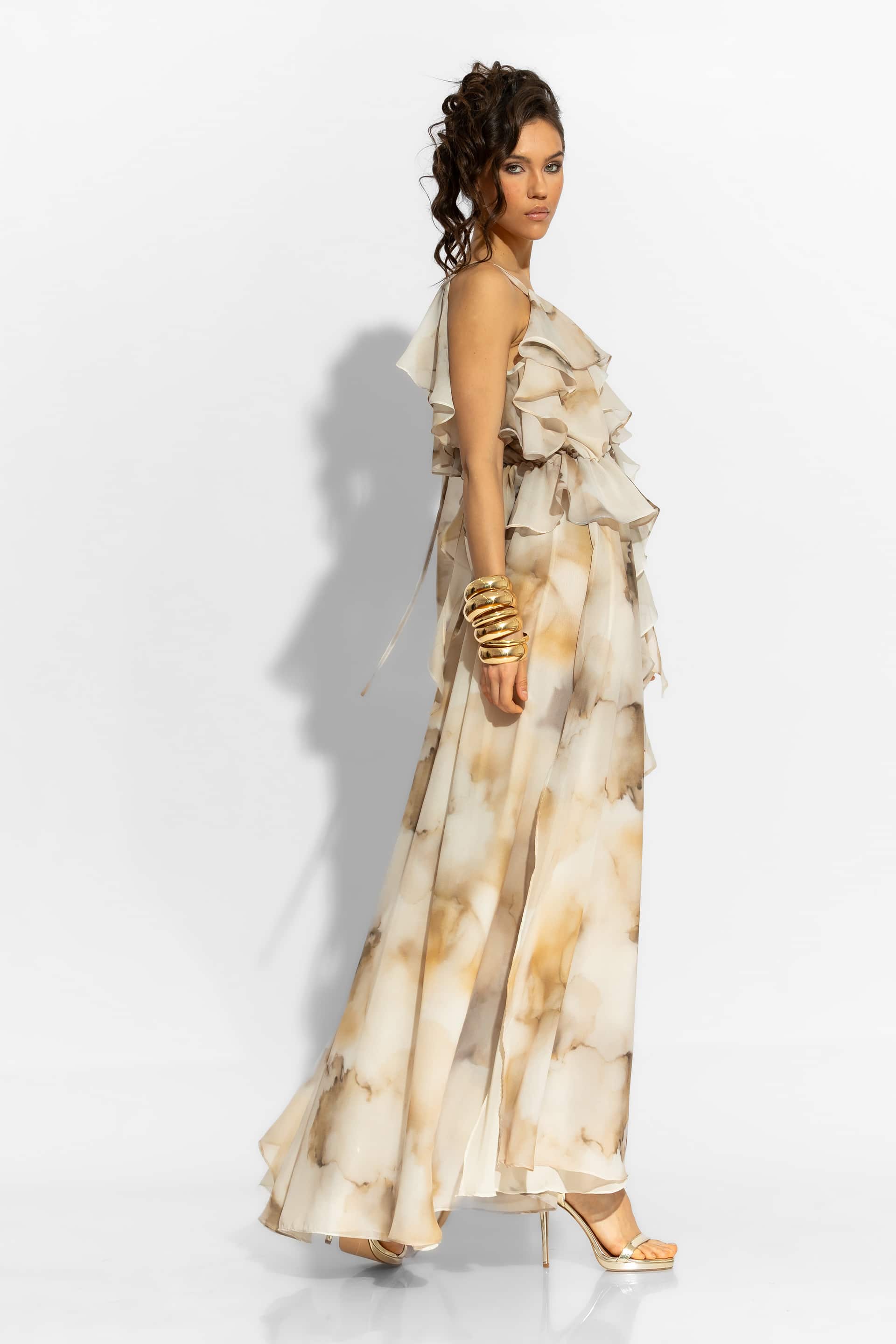 One Shoulder Maxi Ruffled Chiffon Dress in Beige