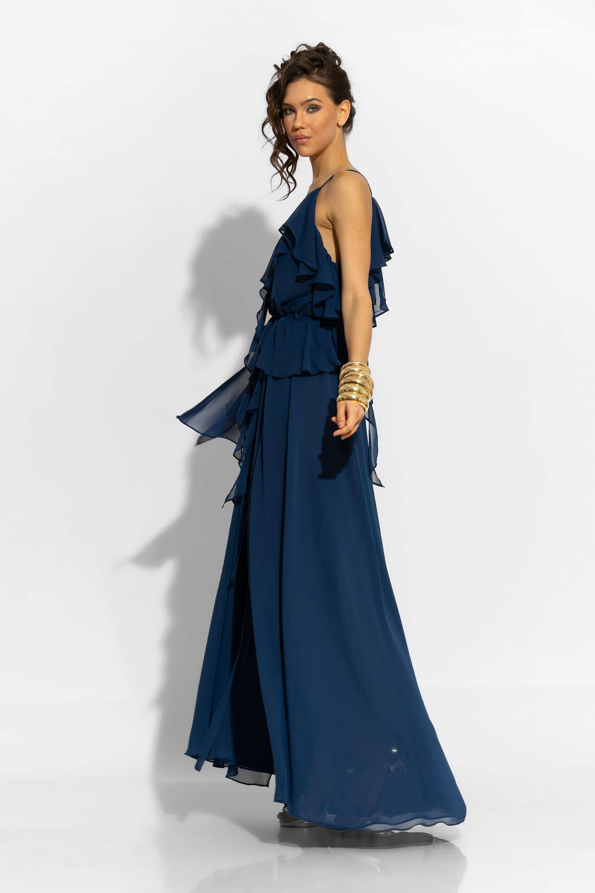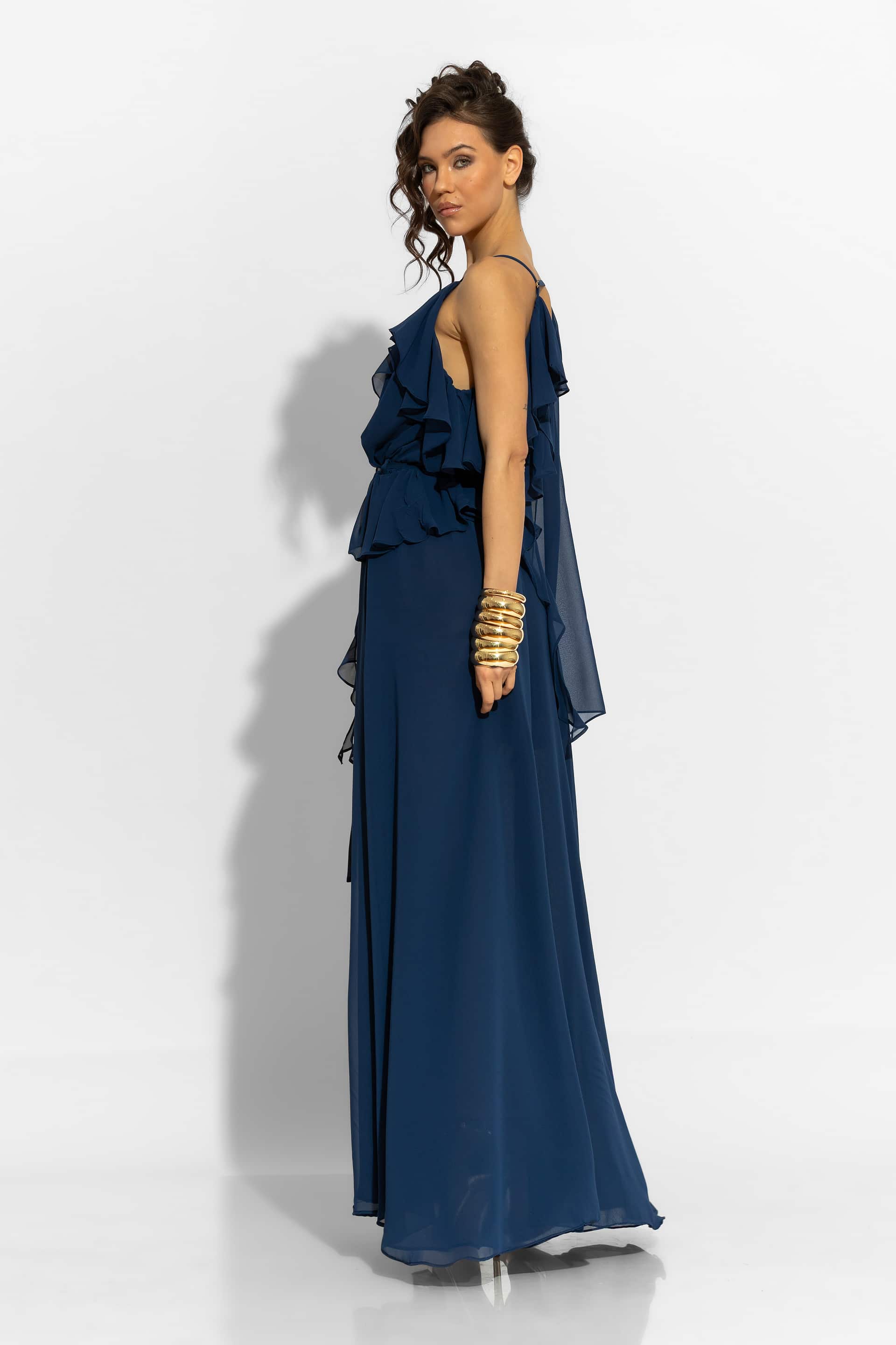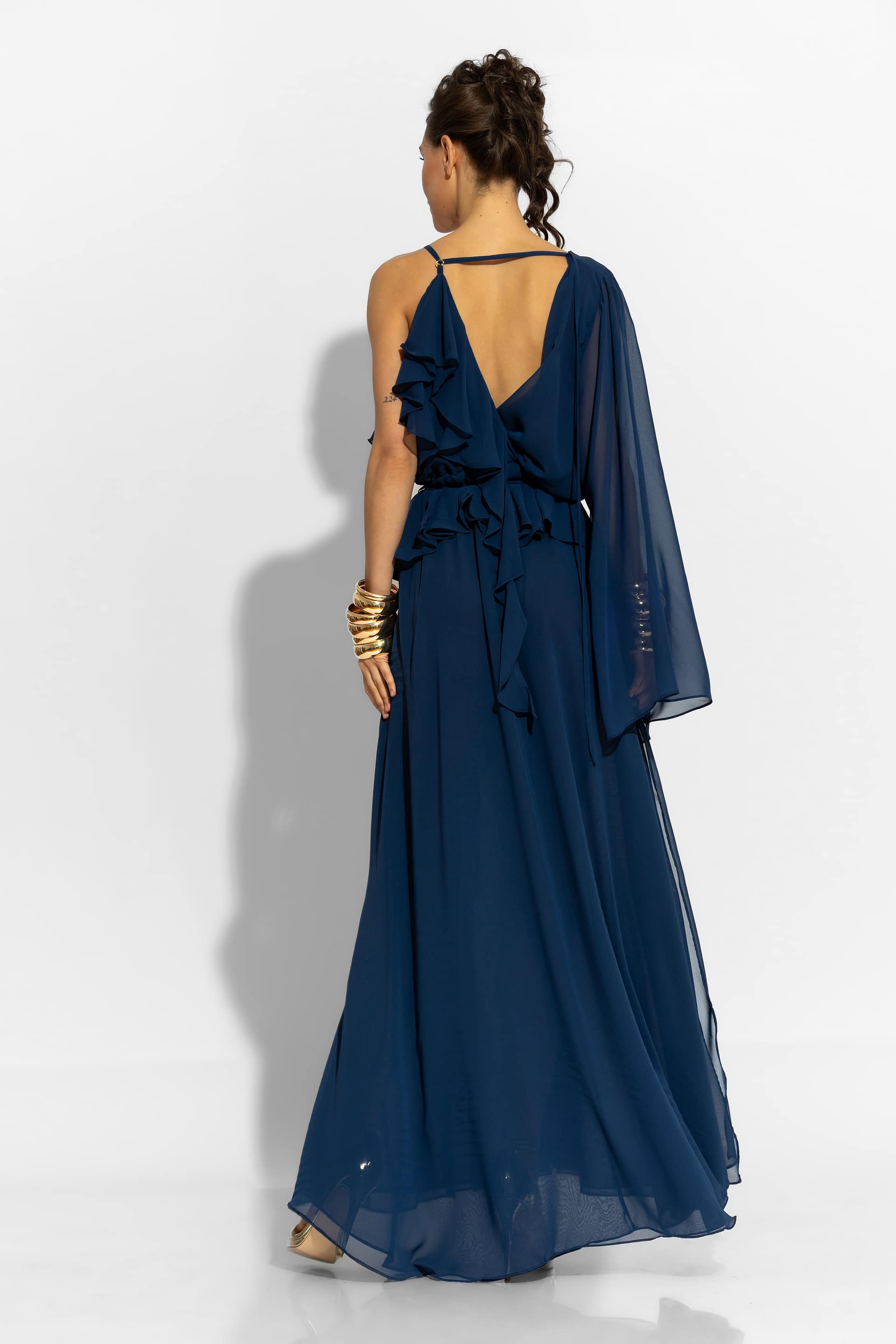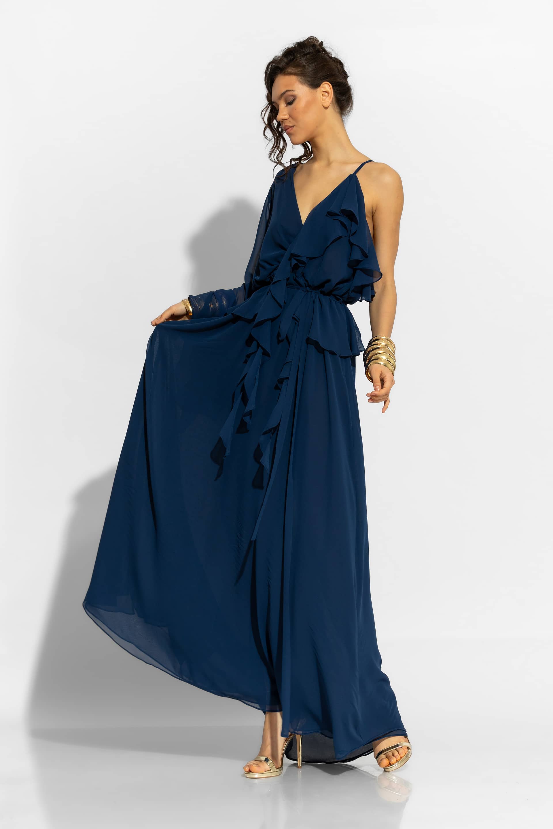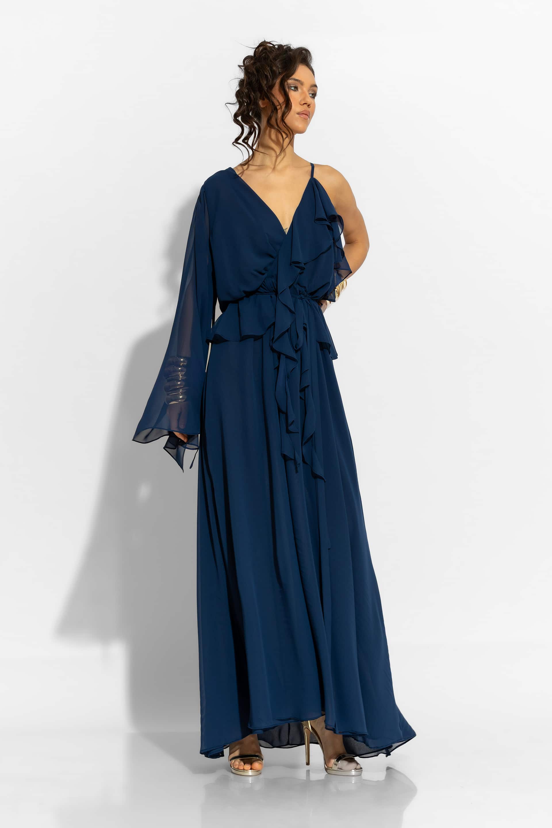 This modern elegant ruffled silhouette gown with delicate chiffon elevates every occasion. Featuring a dramatic wide ruffled bell sleeve and ruffled wrapped bodice flatters every silhouette. Double chiffon layering and elasticated waist for better fit. This maxi dress exudes bohemian luxury with its voluminous silhouette and fluid movement, making it an ideal choice for high-end summer events and evening appearances.