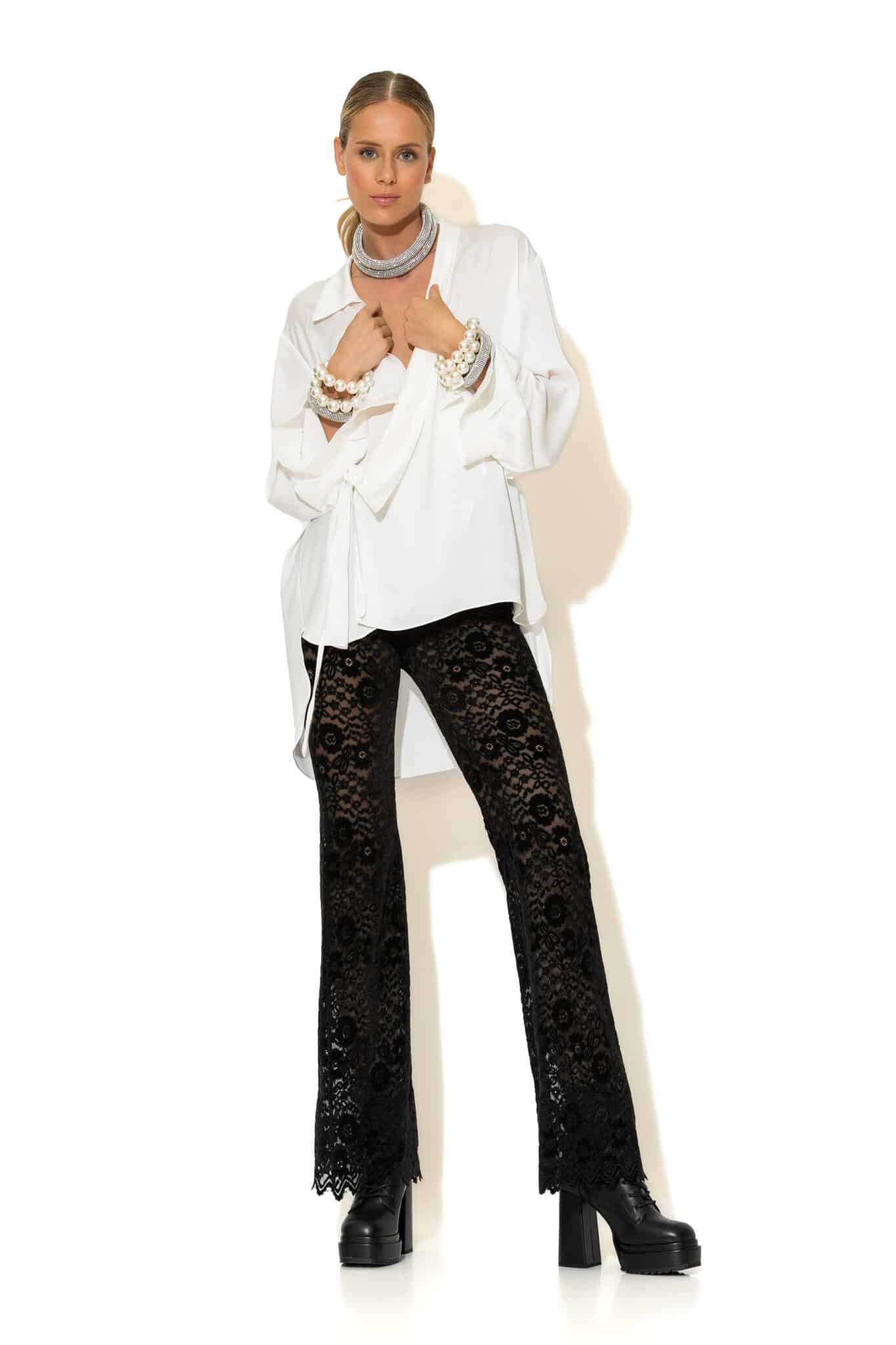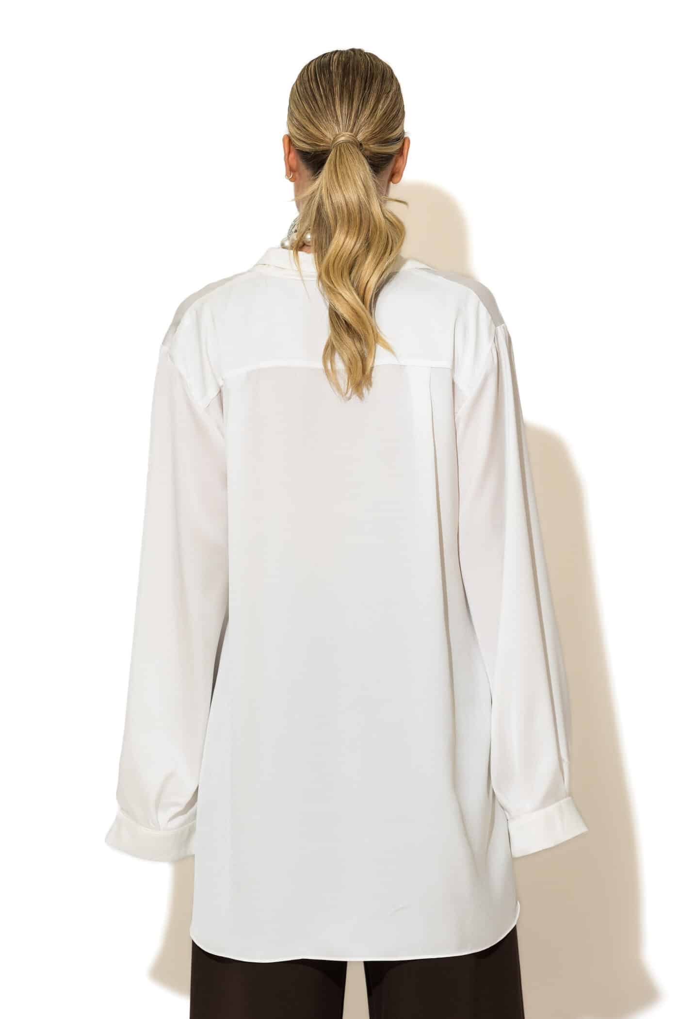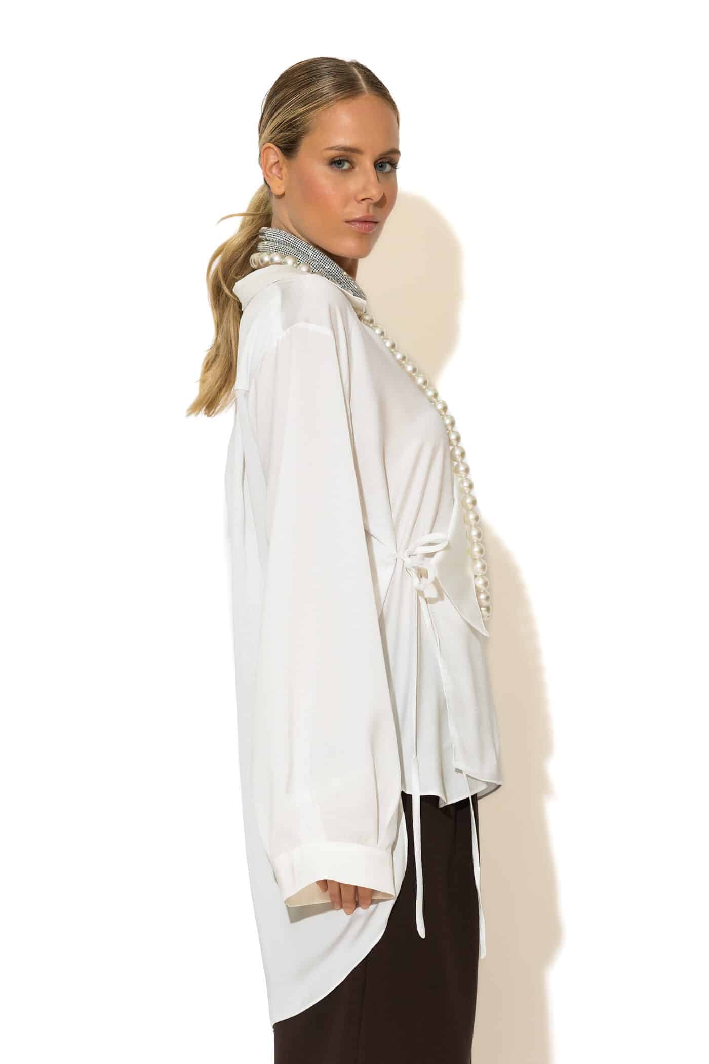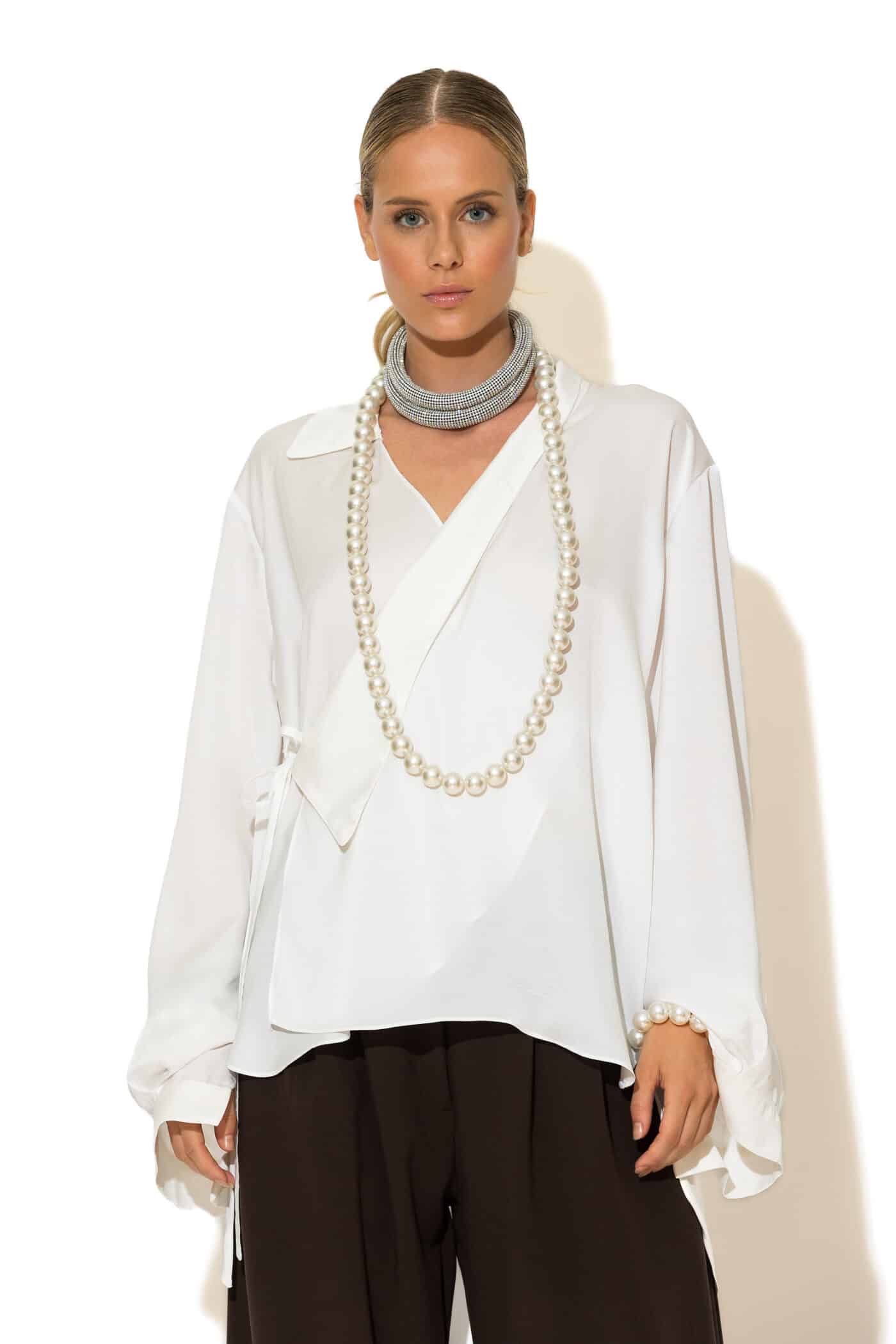 This perfect shirt with its luxurious satin fabric and its wrap line flatters every figure.