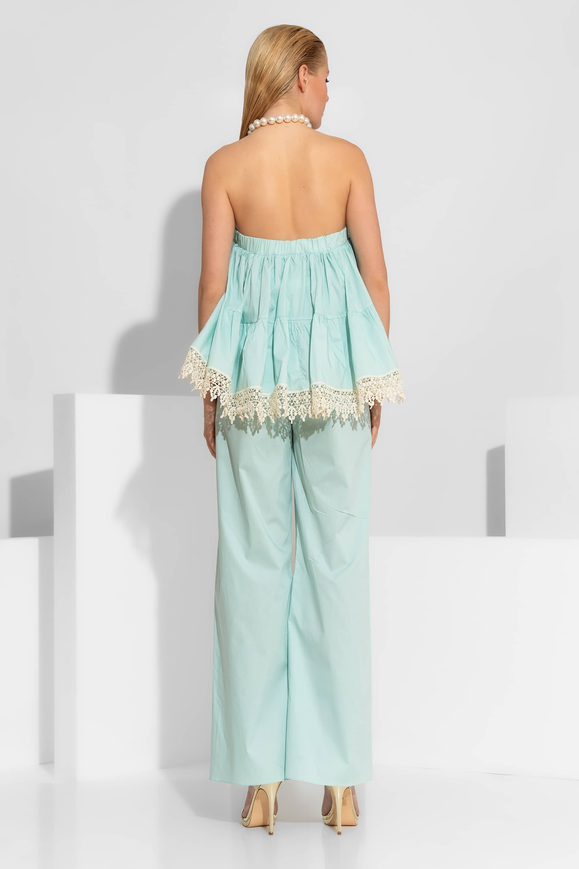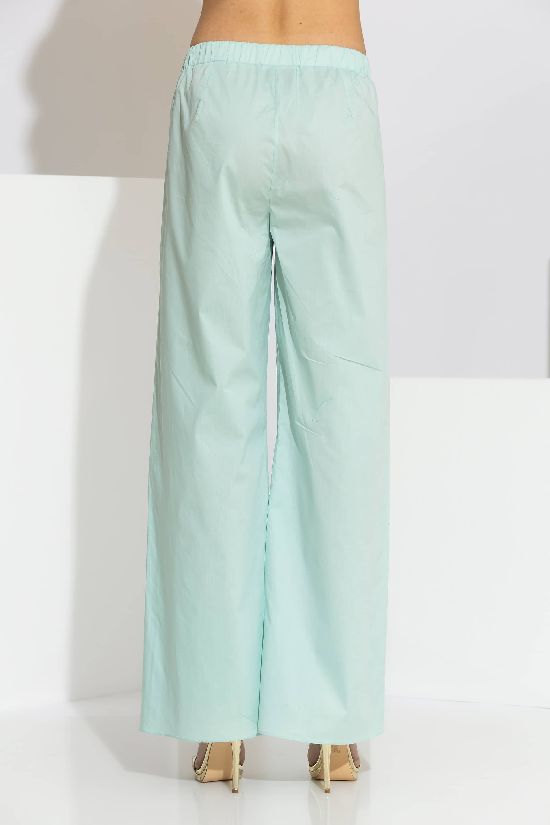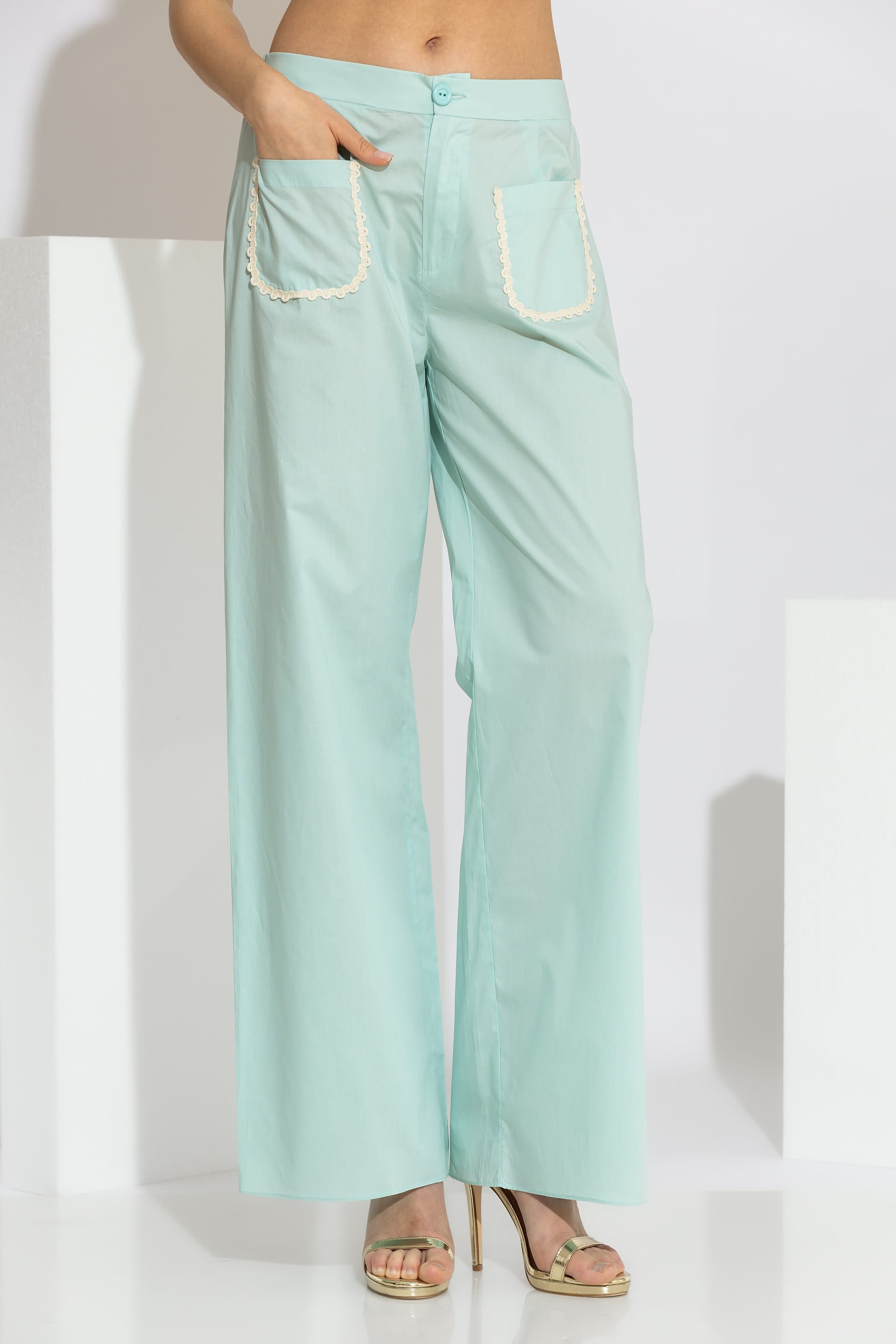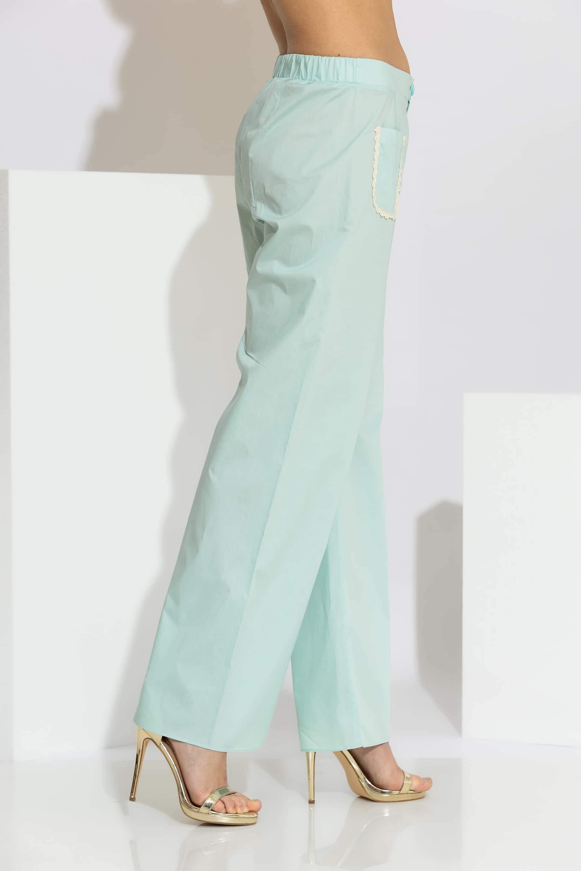 High-end wide-leg pants crafted from 100% premium cotton poplin. This piece is designed with a comfortable elasticated waistband at the back and a clean front finish with a button closure. The silhouette is elevated by two patch pockets on the front, embellished with delicate guipure lace trim. A versatile and breathable garment that will accompany you on your serene coastal walks and upscale summer retreats, ensuring a flawless and sophisticated silhouette.