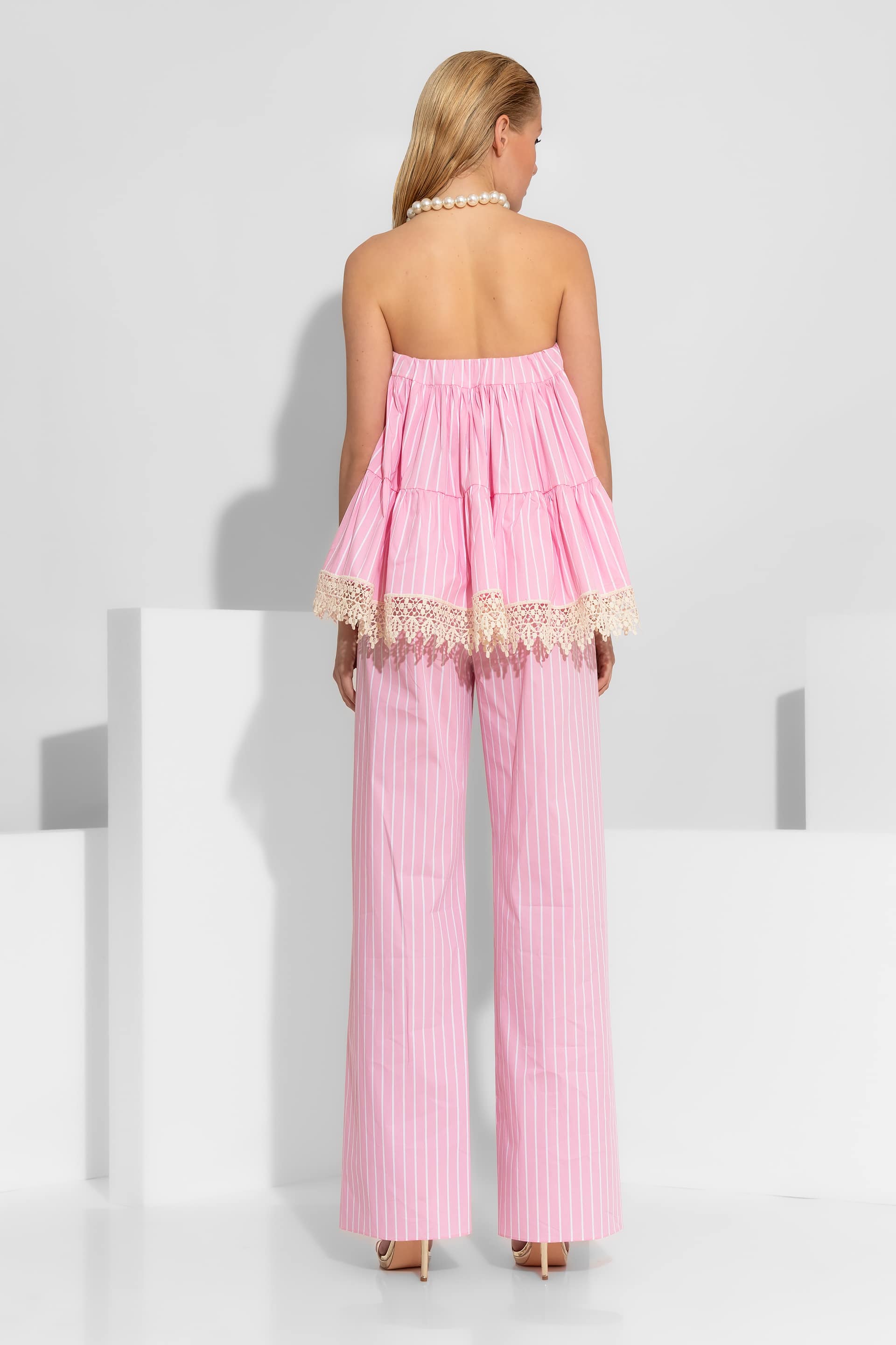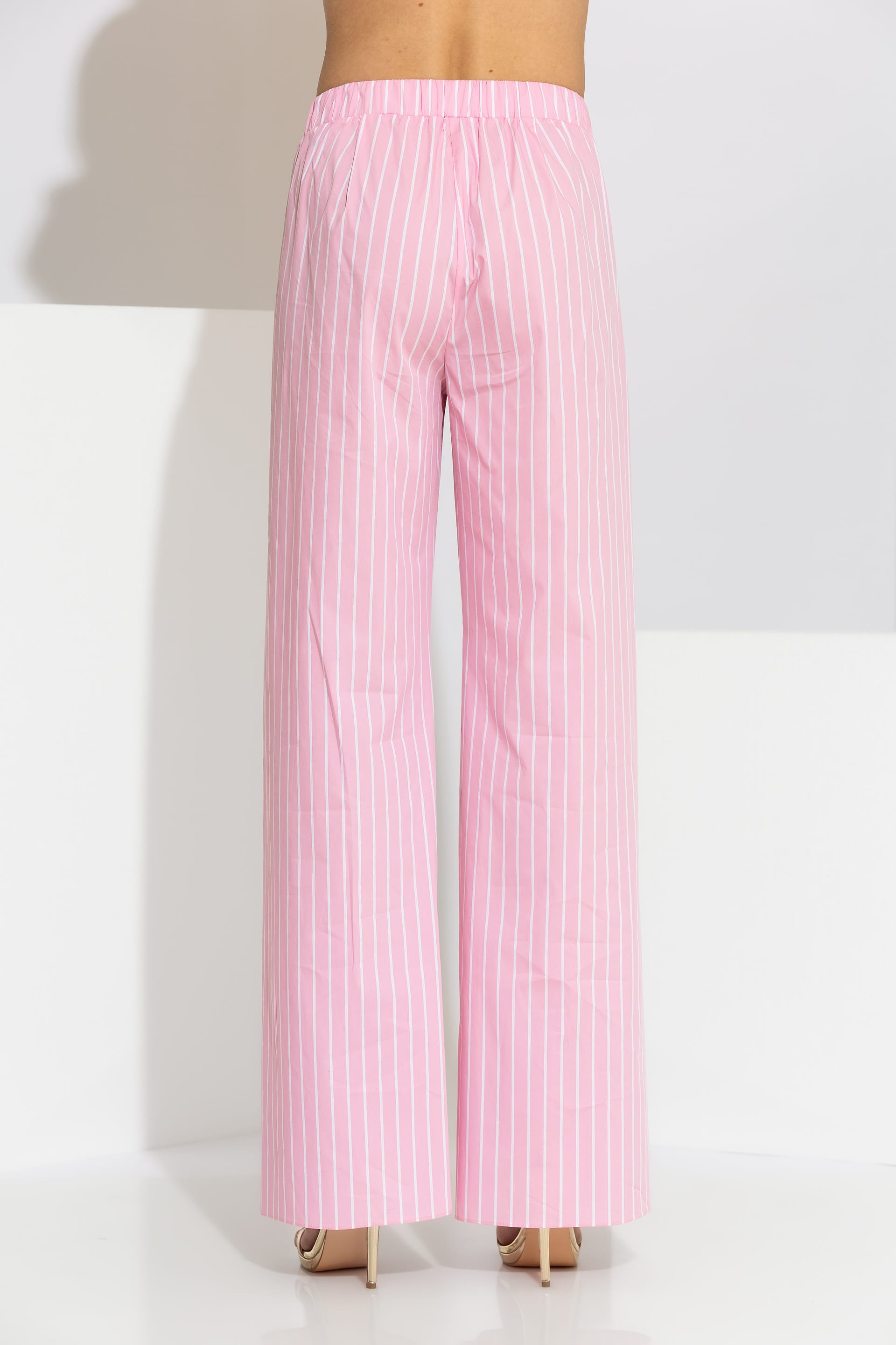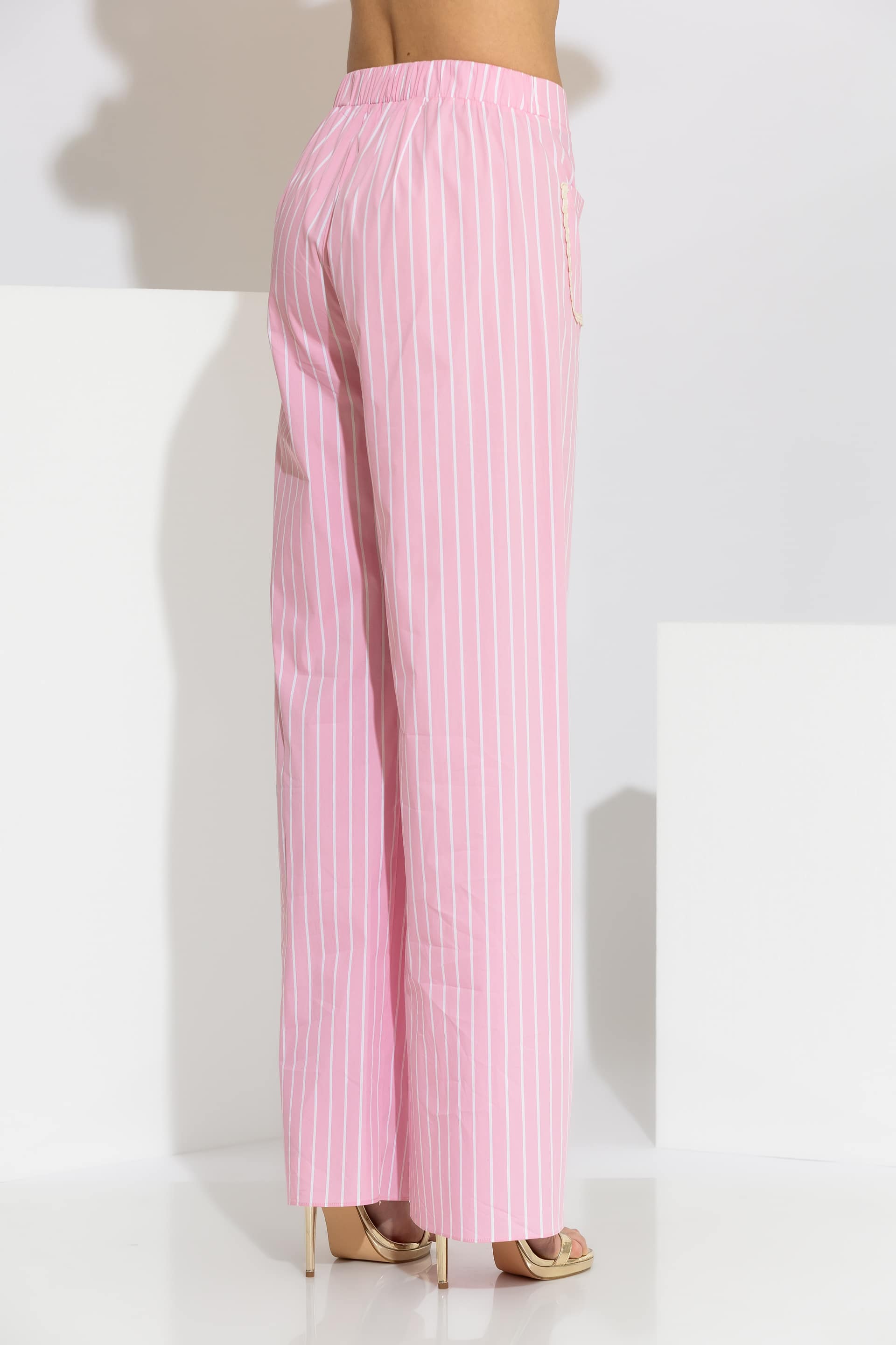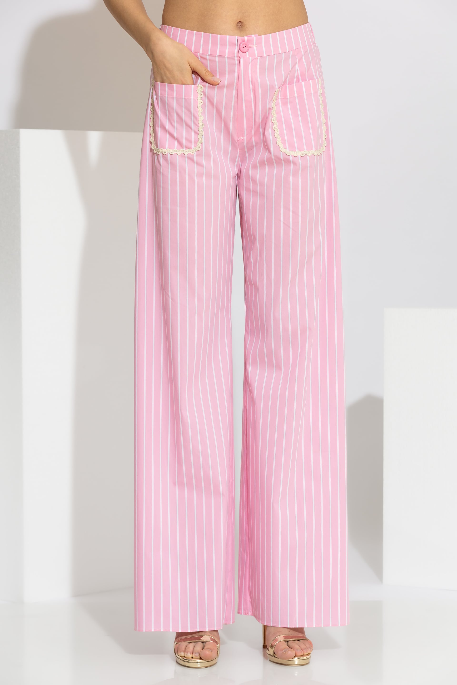 High-end wide-leg pants crafted from premium striped cotton blend poplin. This piece is designed with a comfortable elasticated waistband at the back and a clean front finish with a button closure. The silhouette is elevated by two patch pockets on the front, embellished with delicate guipure lace trim. A versatile and breathable garment that will accompany you on your serene coastal walks and upscale summer retreats, ensuring a flawless and sophisticated silhouette.