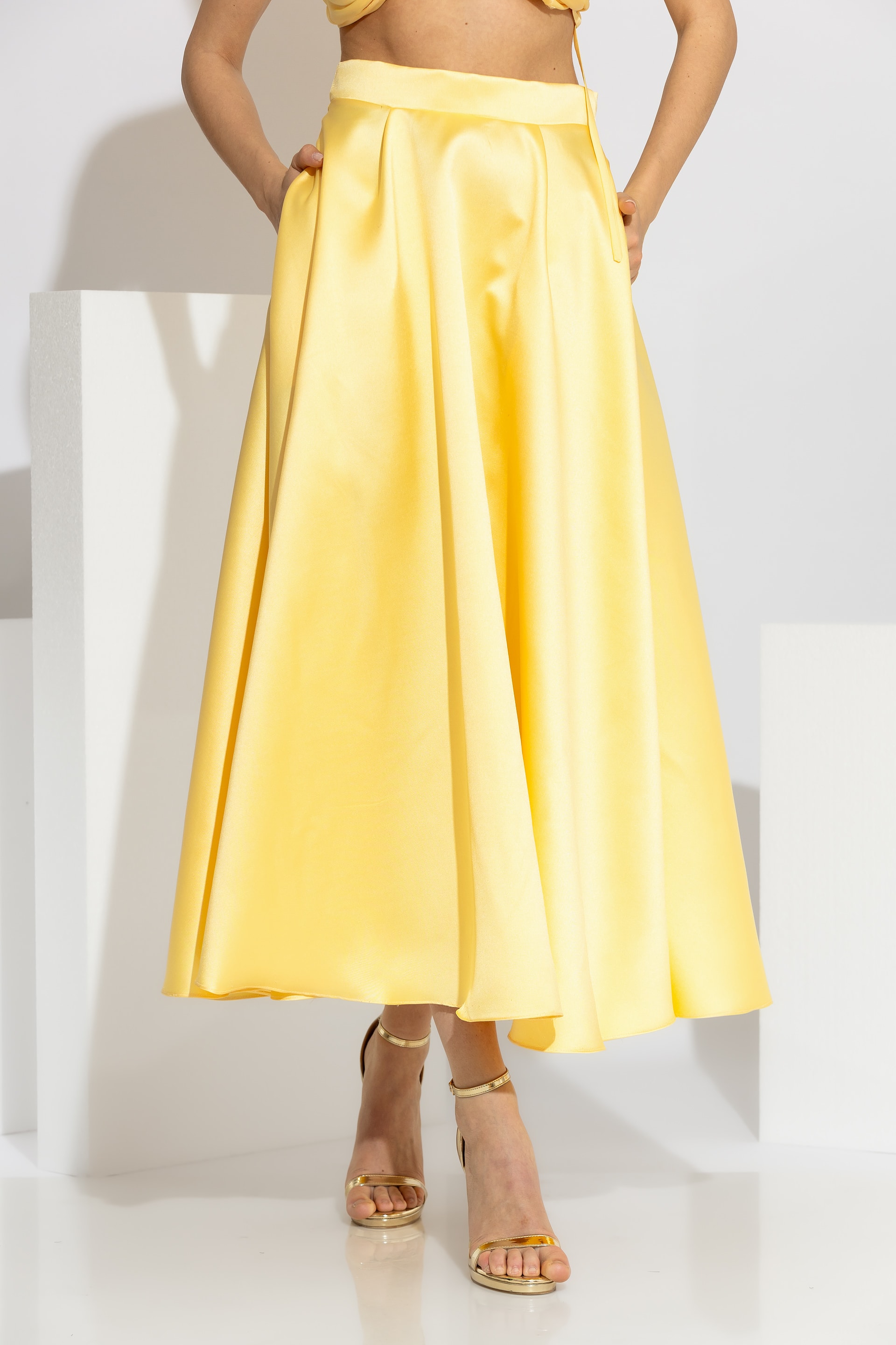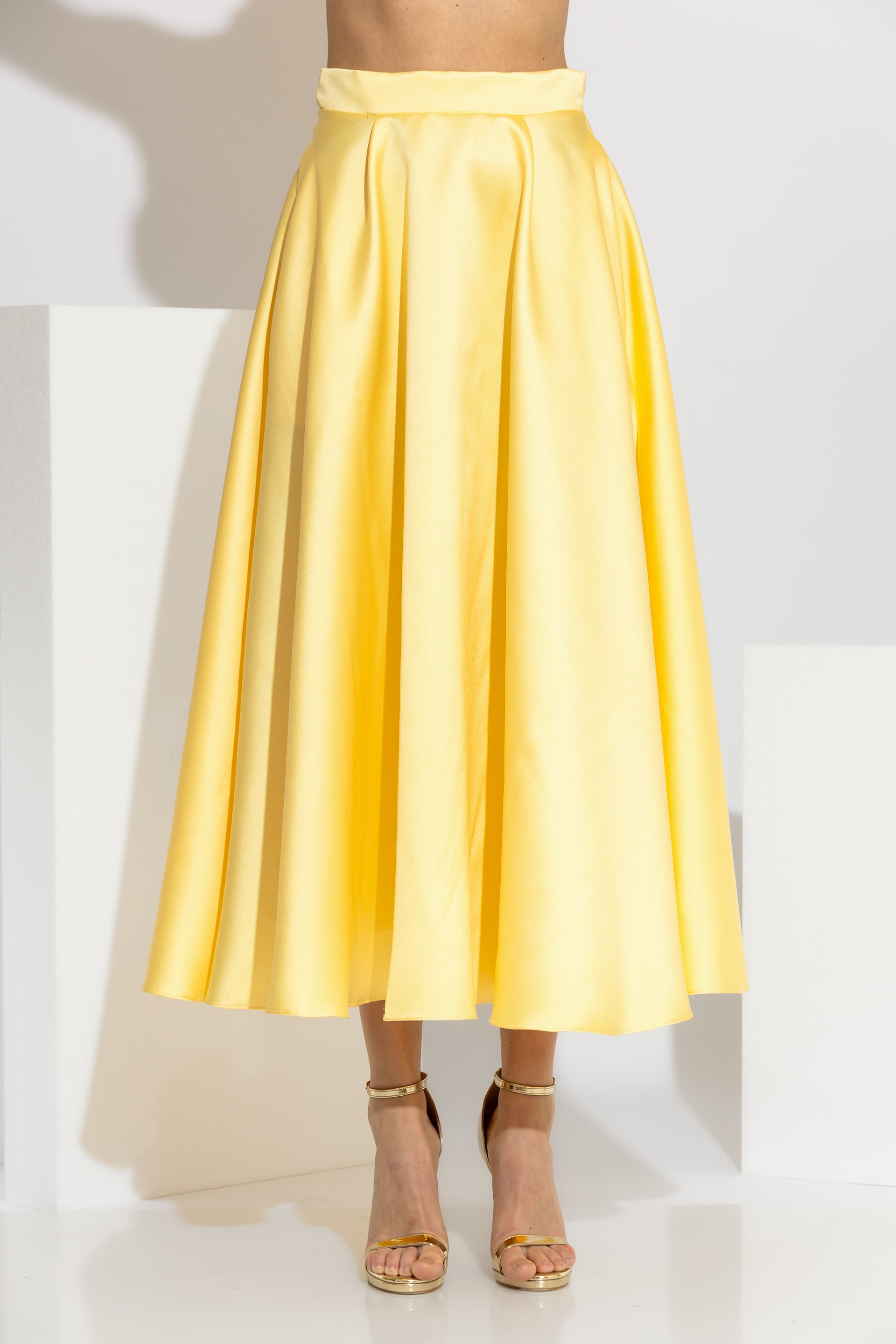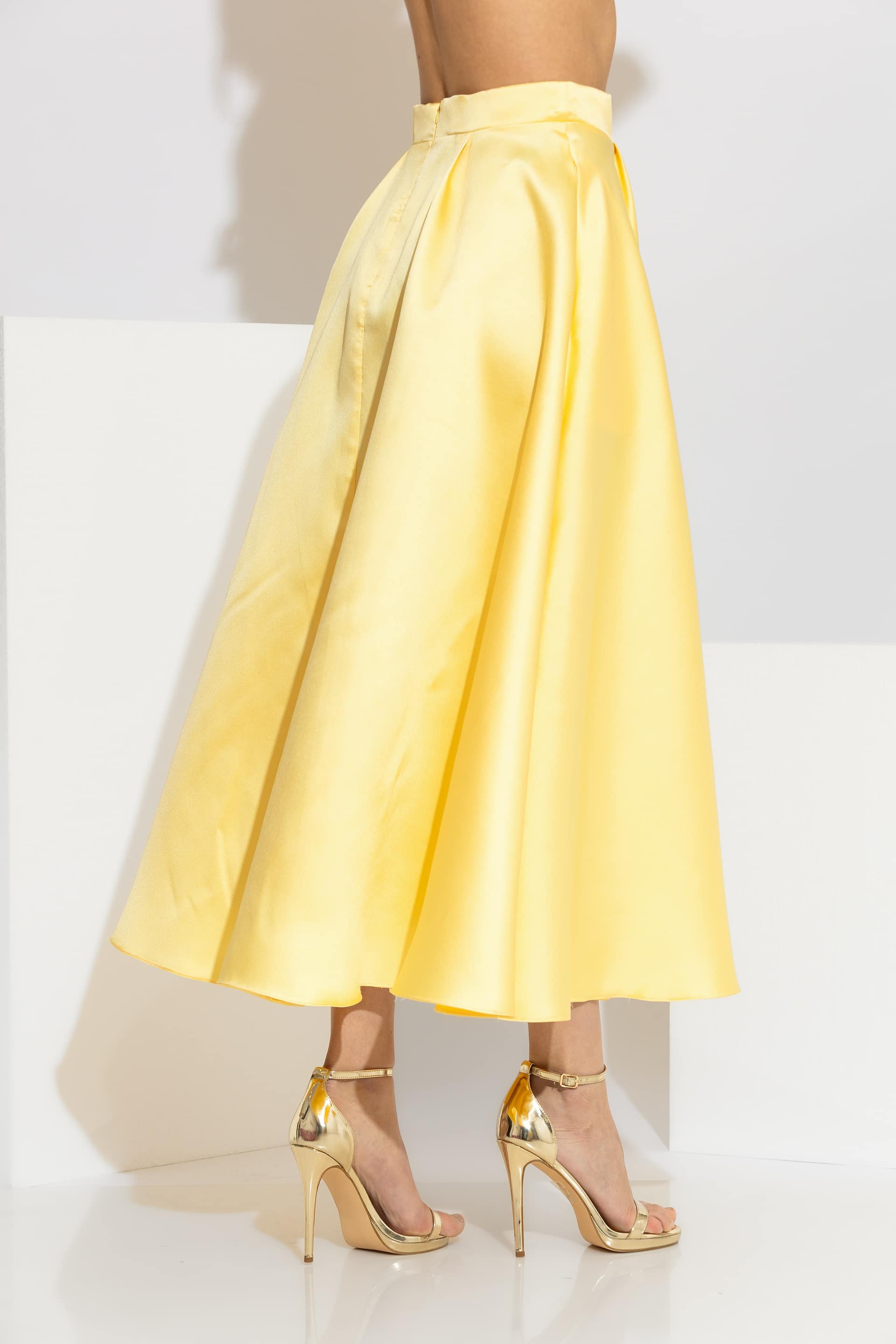 A statement cocktail skirt in luxurious taffeta, designed to create a bold, architectural silhouette. Featuring elegant front pleats and a voluminous flared hem, it’s the ultimate piece for a high-fashion occasion.