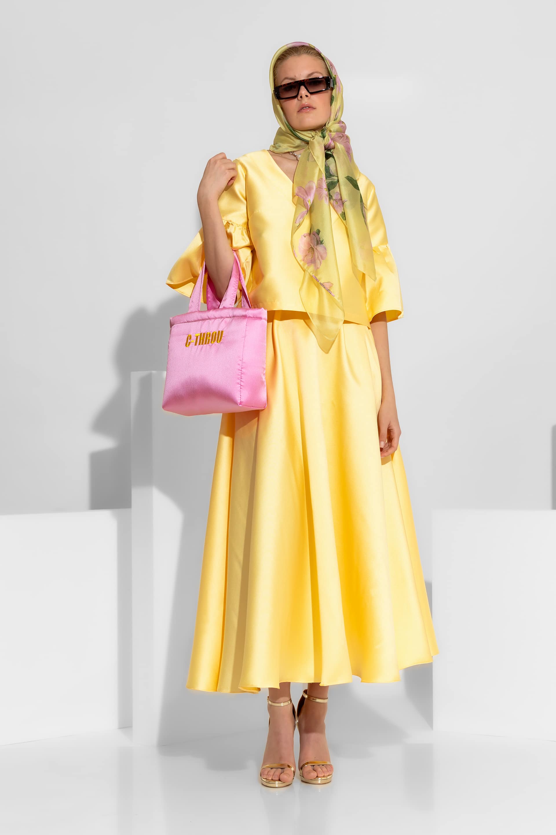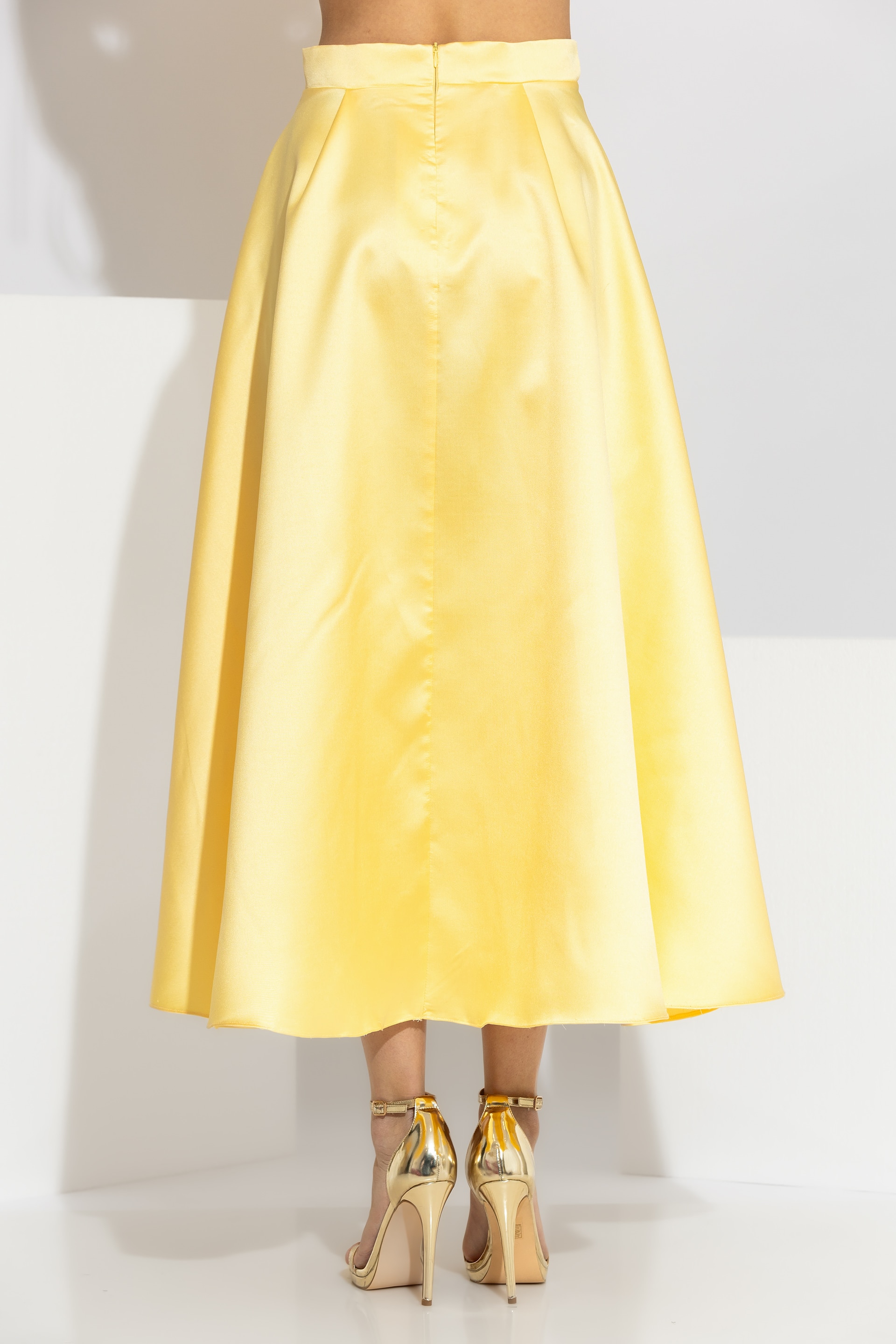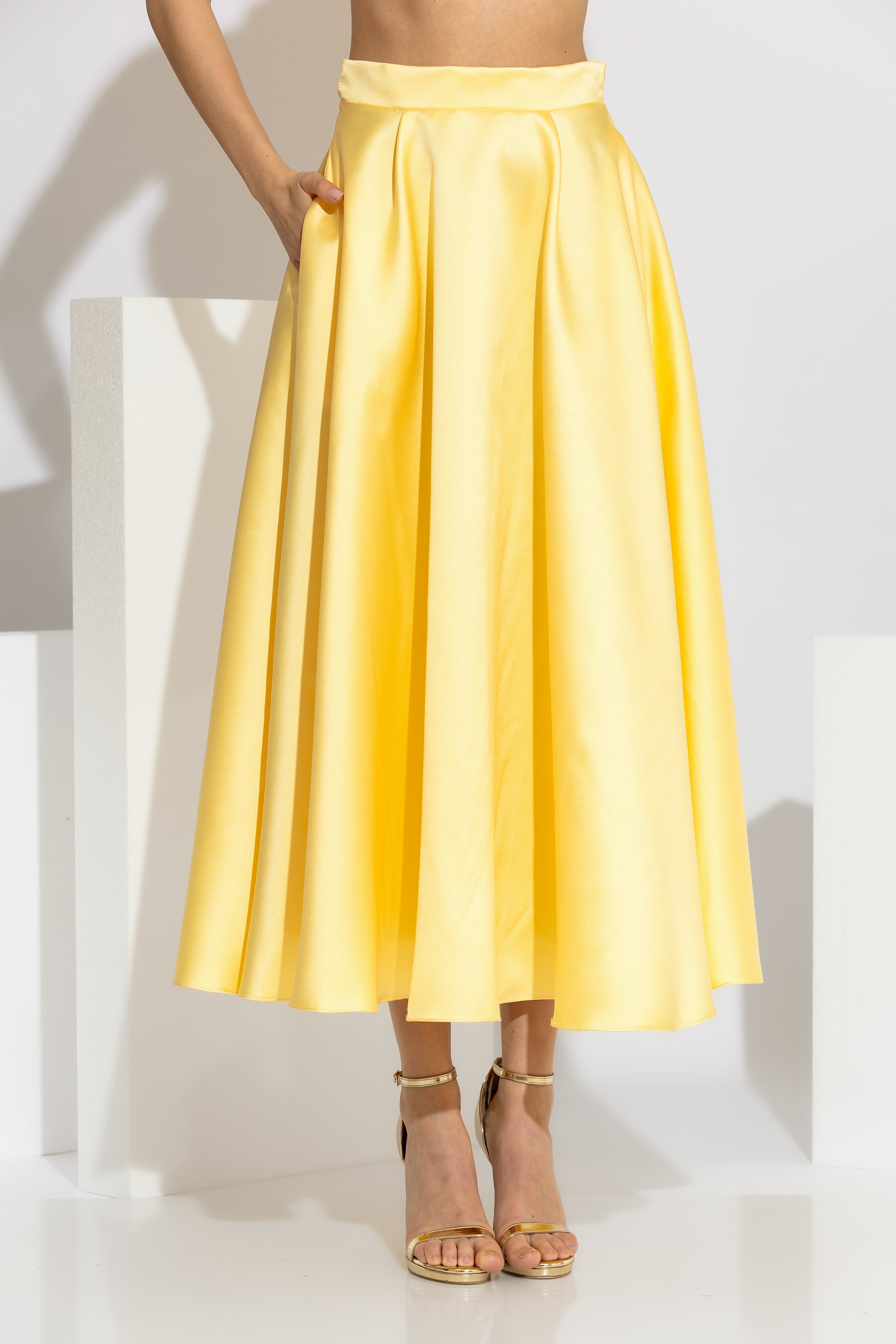 A statement cocktail skirt in luxurious taffeta, designed to create a bold, architectural silhouette. Featuring elegant front pleats and a voluminous flared hem, it’s the ultimate piece for a high-fashion occasion.