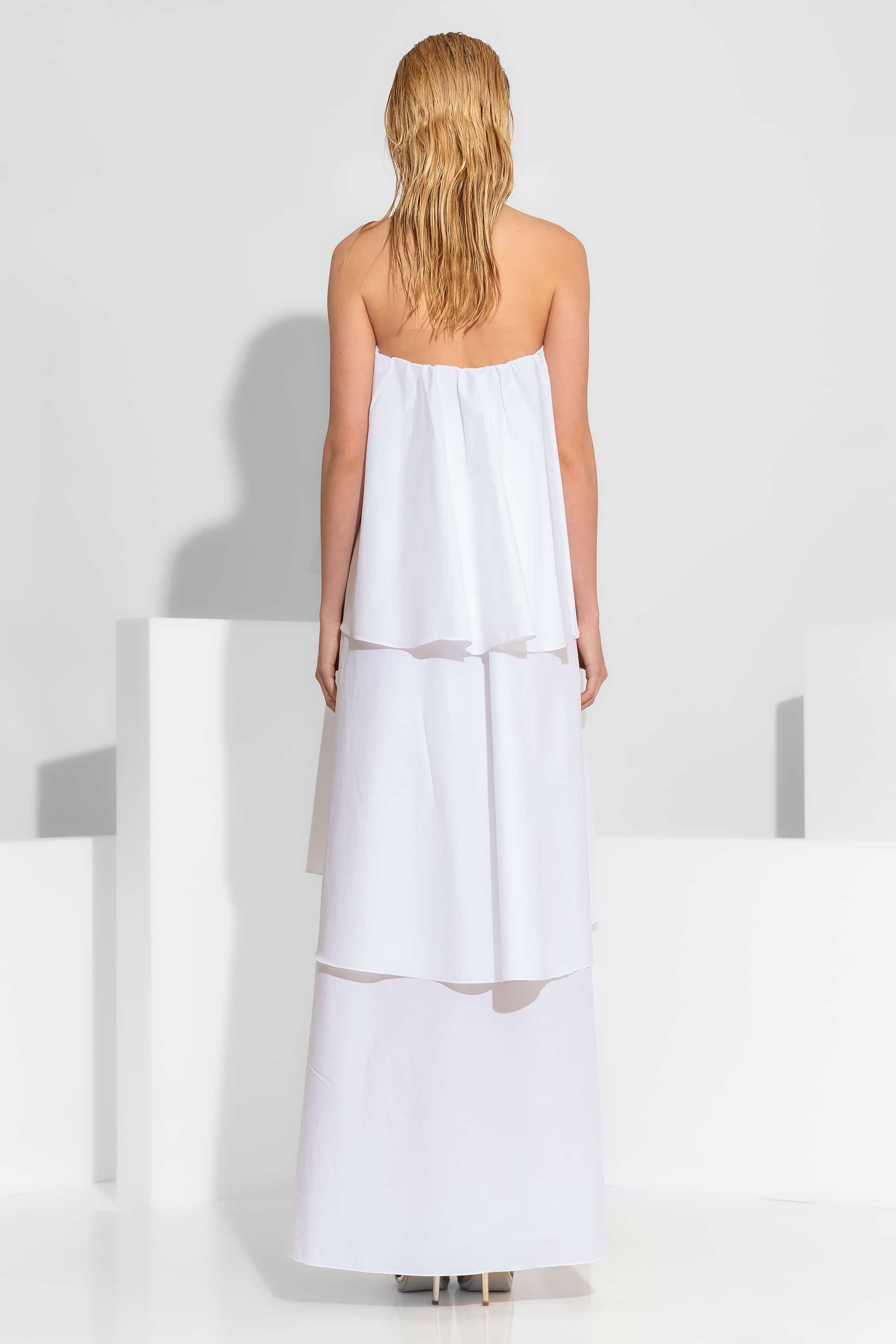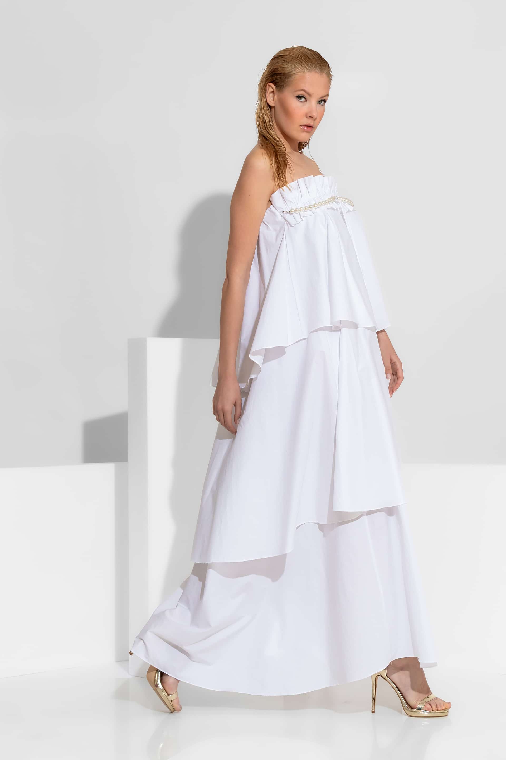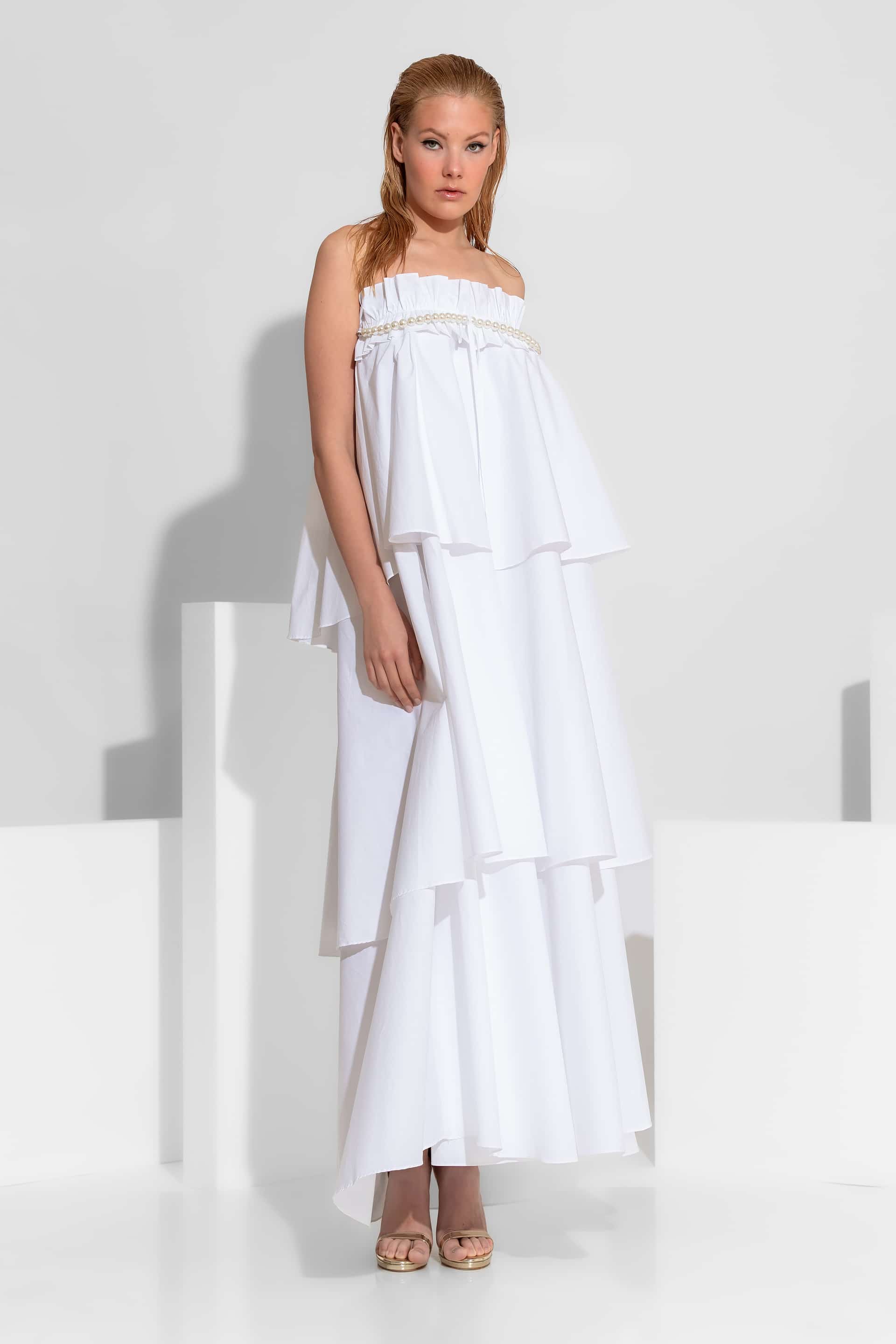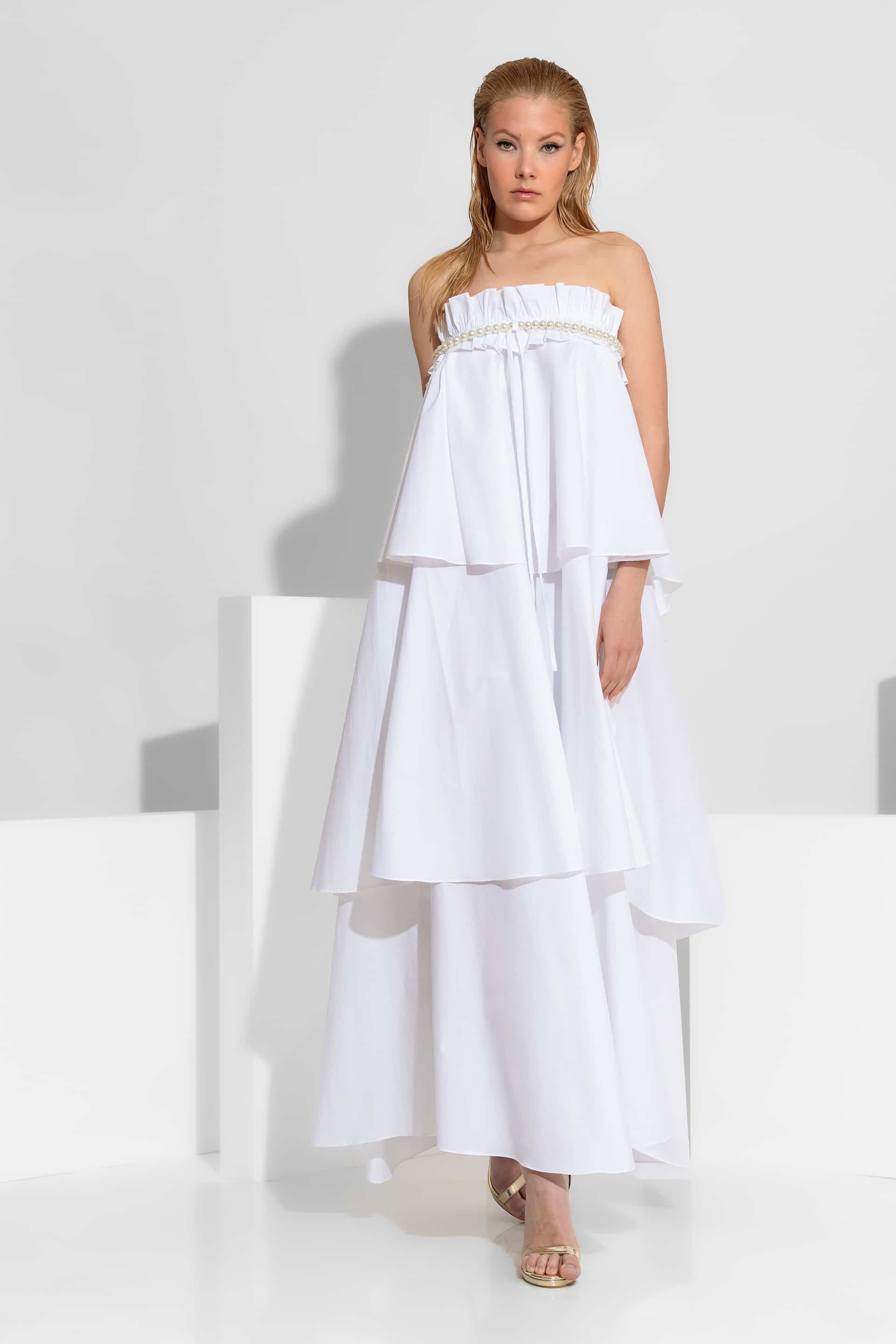 A romantic and contemporary statement maxi dress , meticulously crafted from 100% premium cotton poplin. This strapless piece is defined by its architectural tiered ruffles and intricate hand-placed pearl accents. The design is finished with a charming ribbon tie and ruching at the center bust. The pearl and ribbon detail is fully detachable, allowing it to be worn separately as a statement necklace.