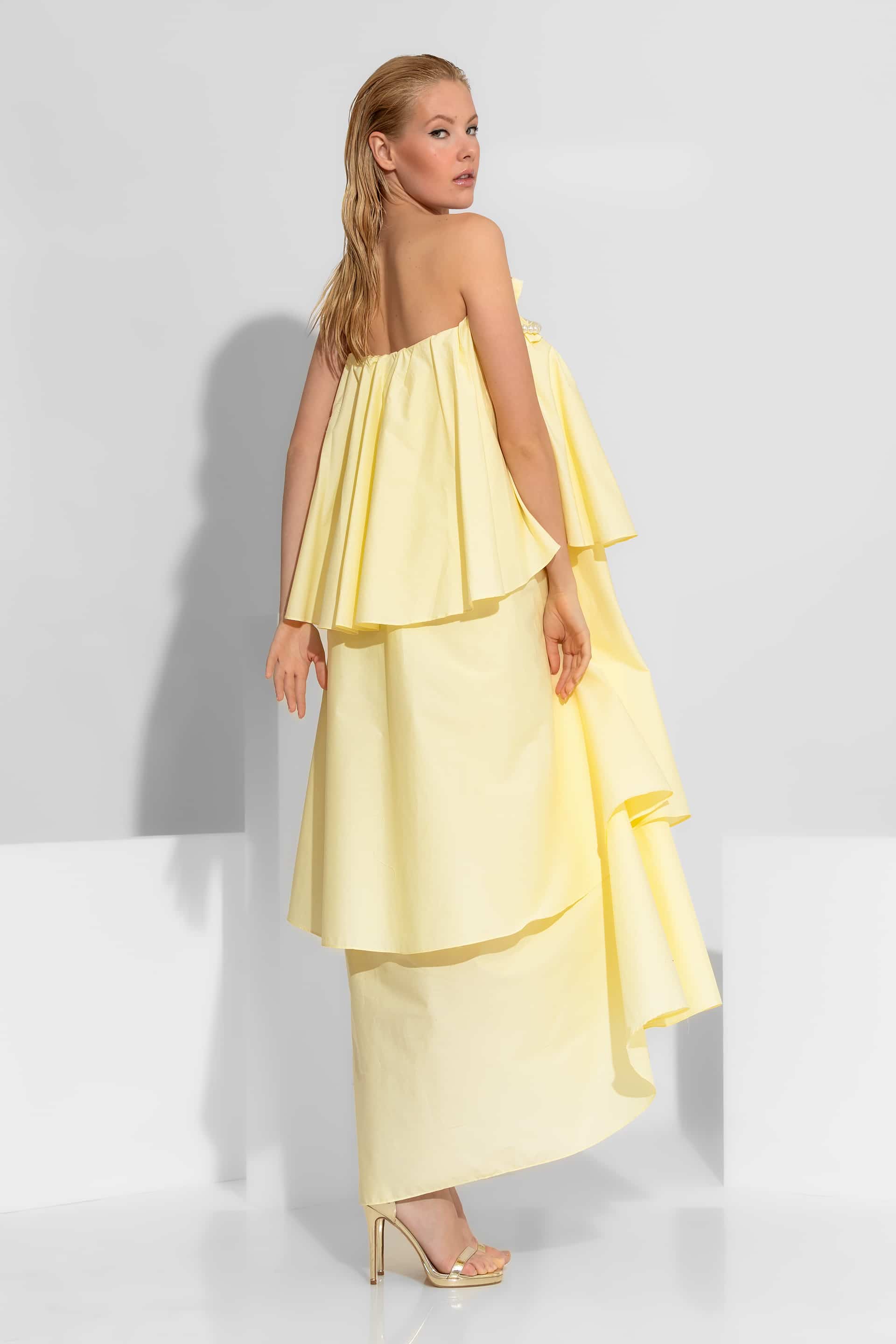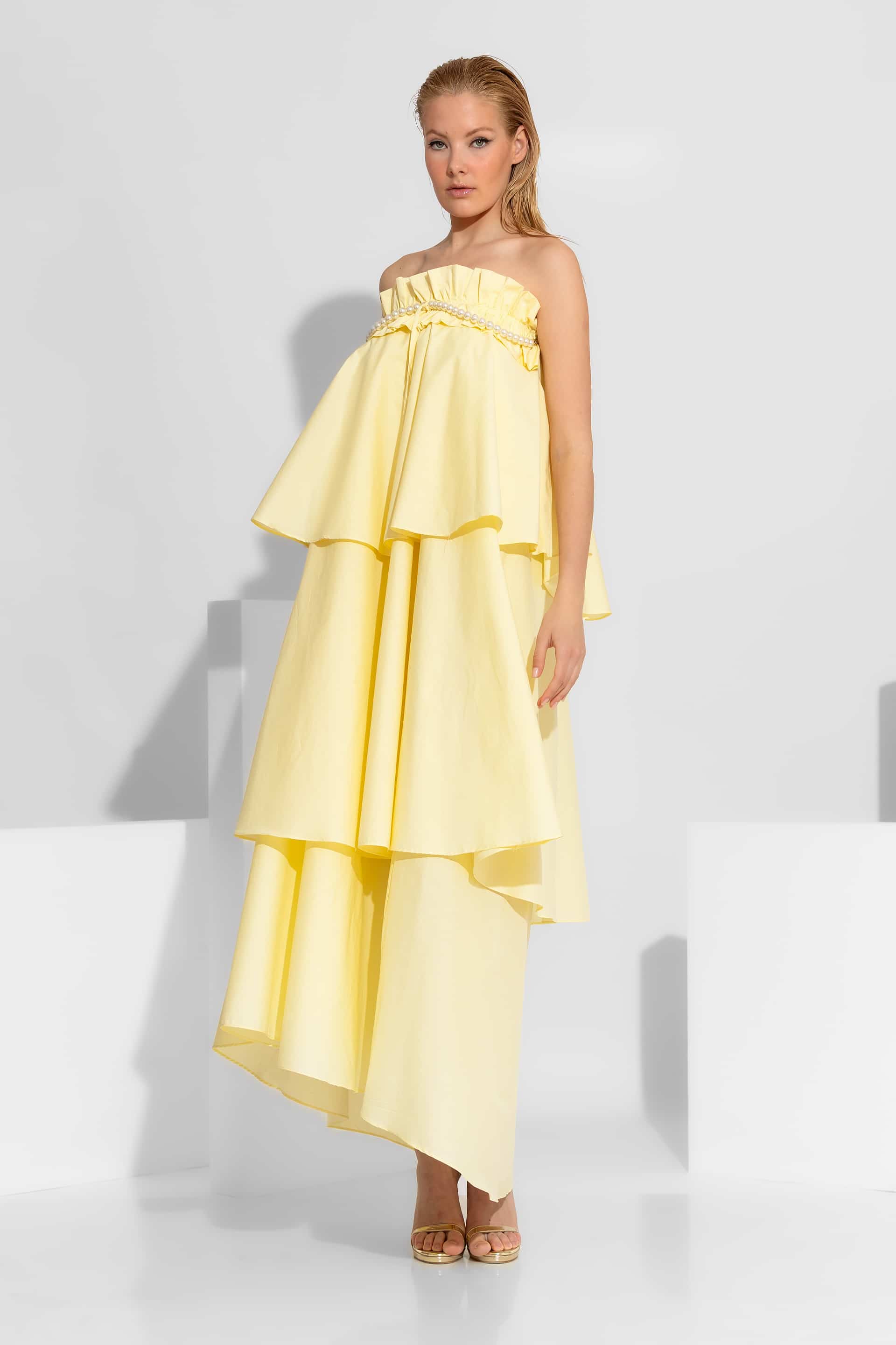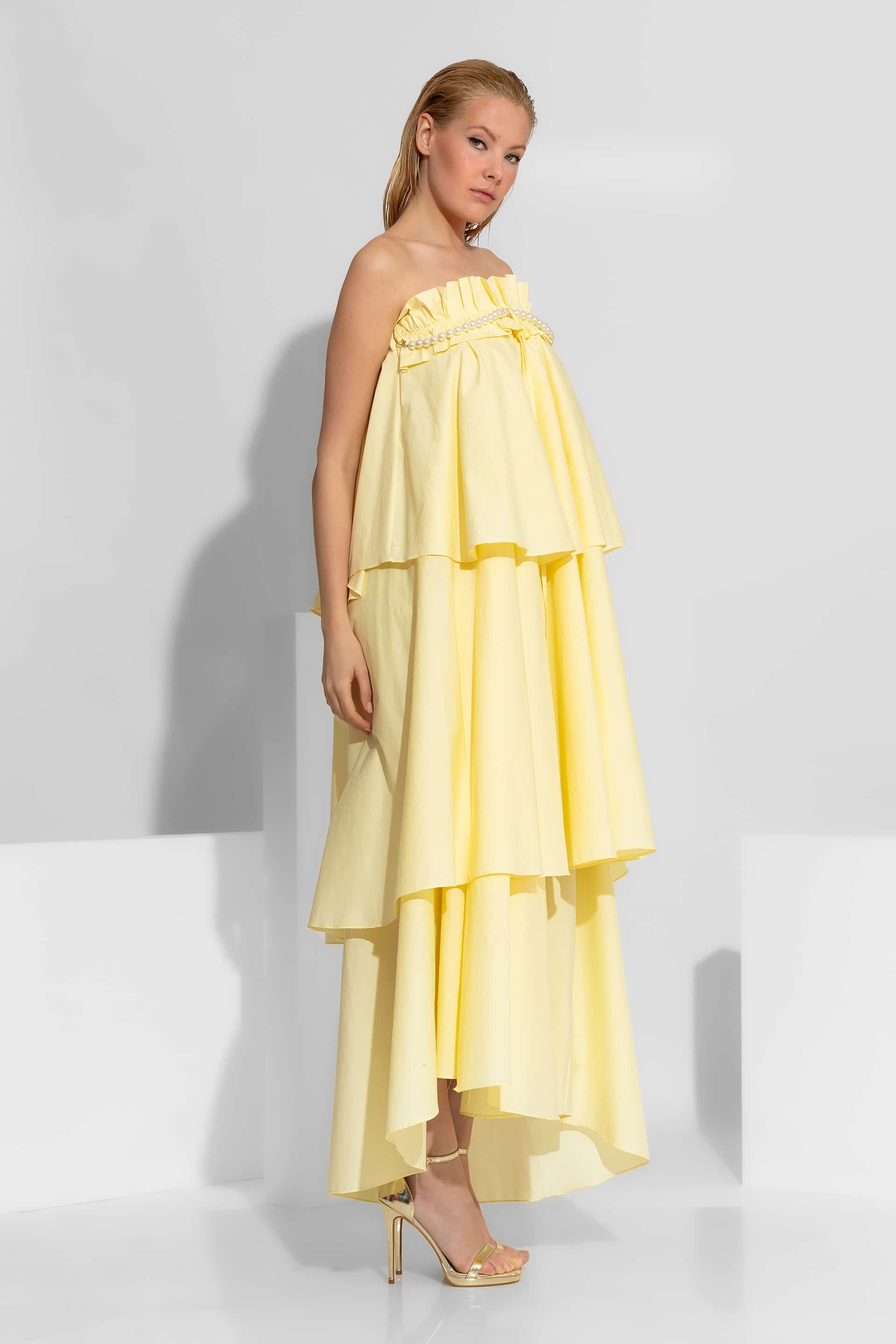 Voluminous Ruffled Maxi Dress with Removable Pearl Detail