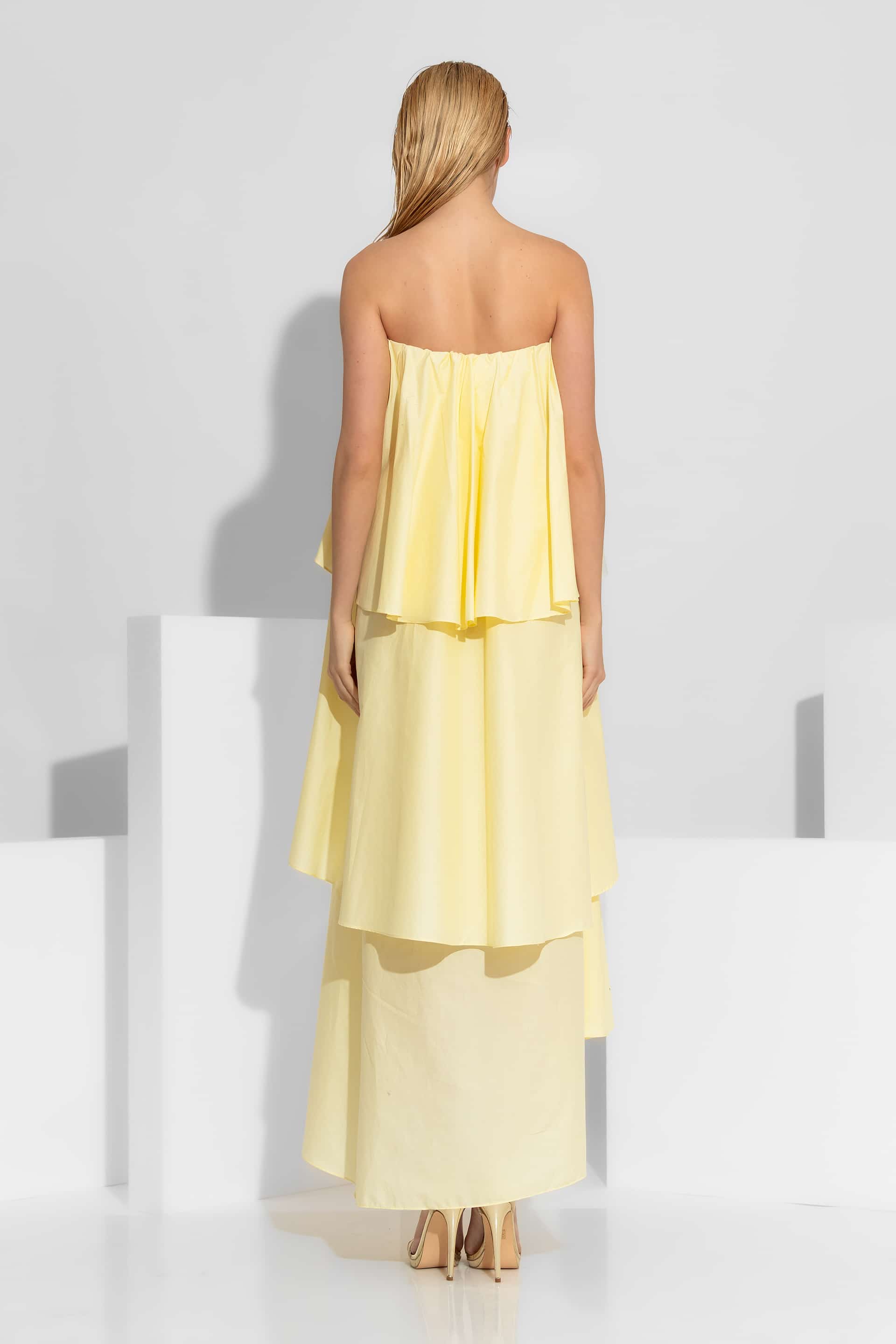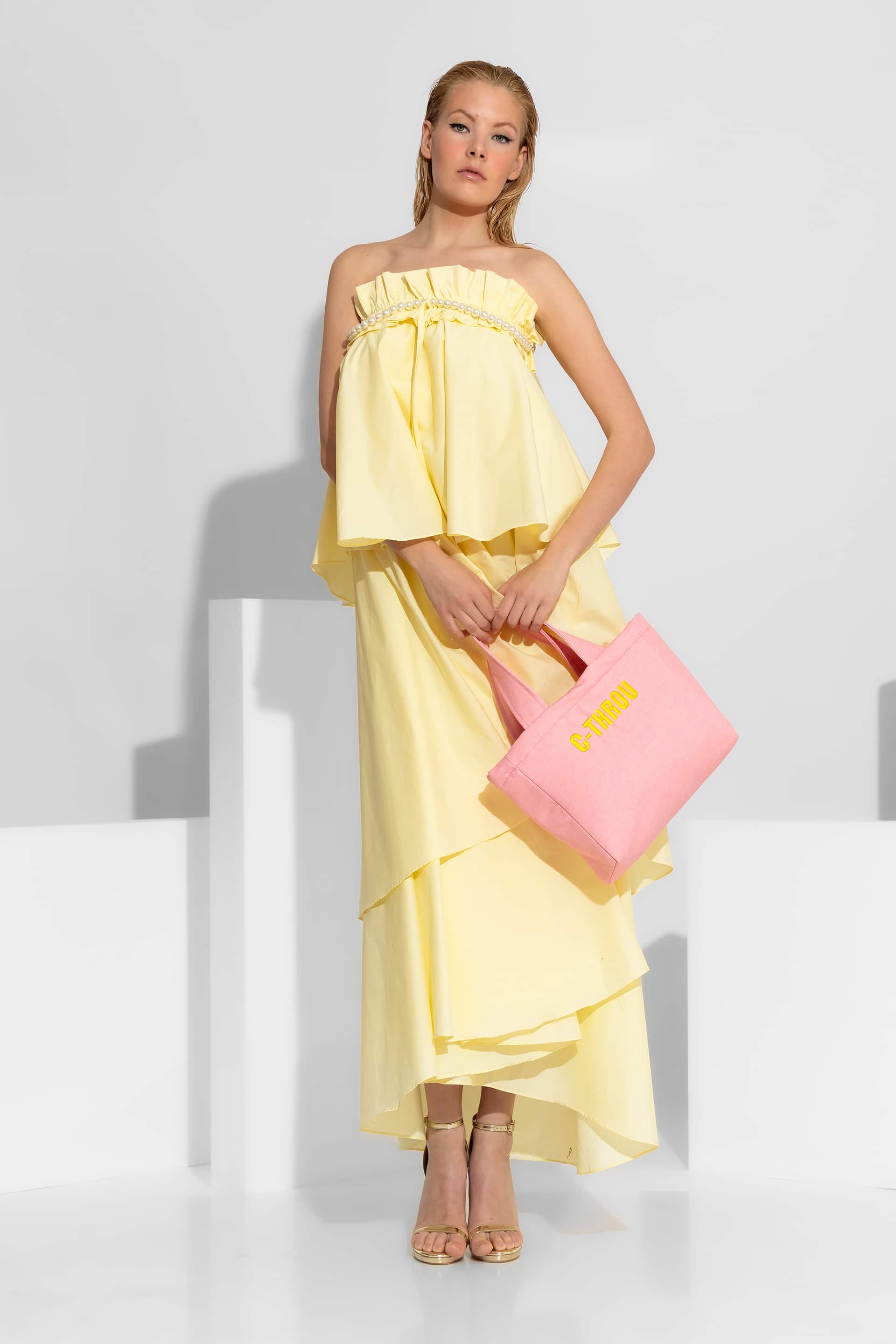 A romantic maxi dress , defined by its architectural tiered ruffles and intricate hand-placed pearl accents. Crafted from 100% premium cotton poplin, the design is finished with a charming ribbon tie and ruching at the center bust. The pearl and ribbon detail is fully detachable, allowing it to be worn separately as a statement necklace.
