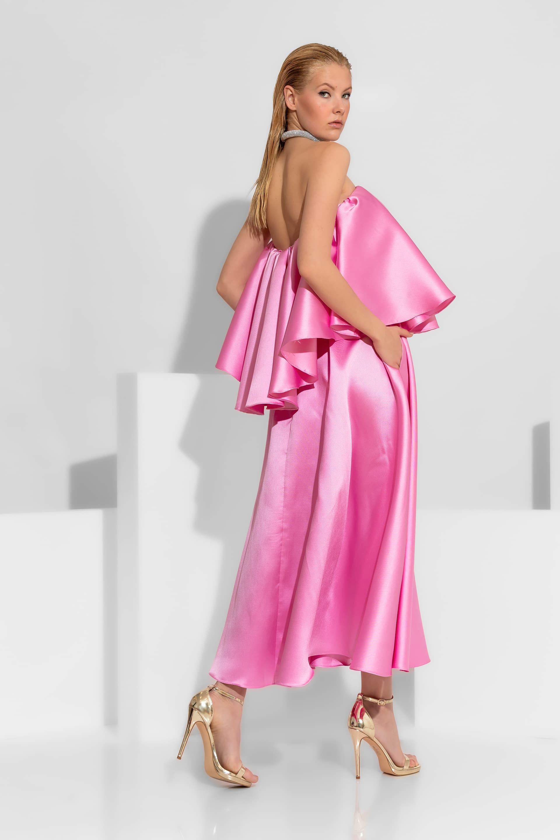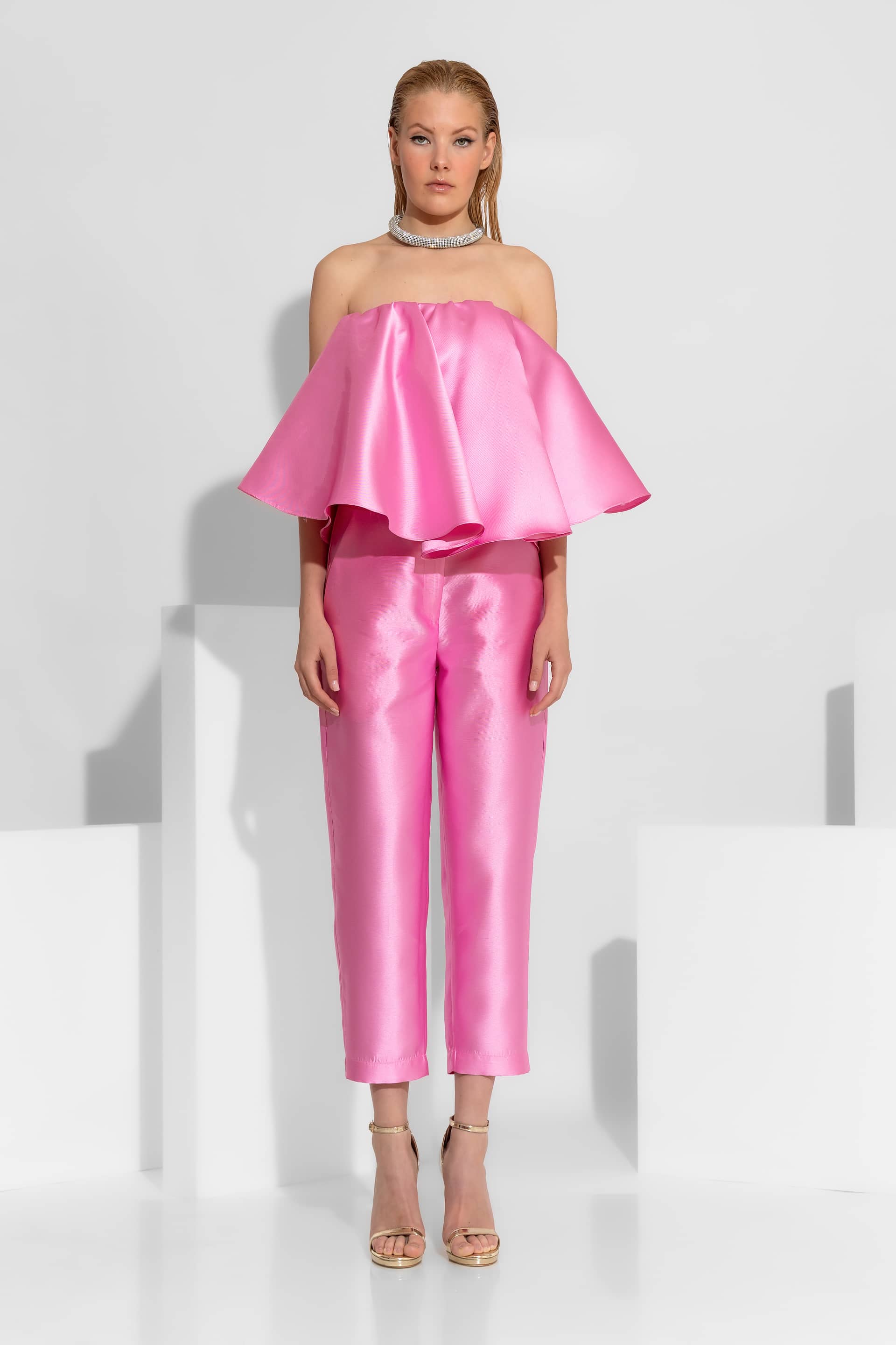 A statement cocktail top in luxurious taffeta, designed to create a bold, architectural silhouette.