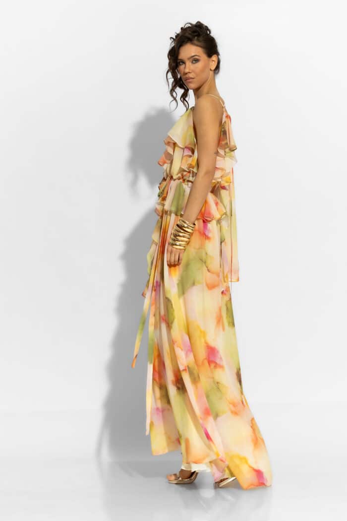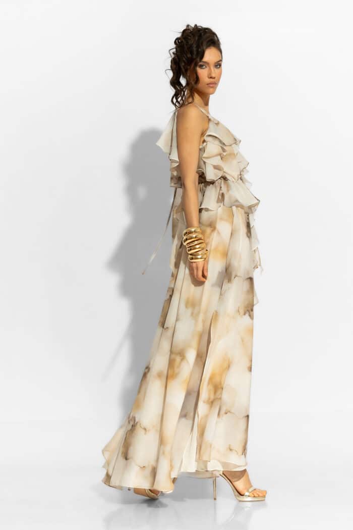 One Shoulder Maxi Ruffled Chiffon Dress in Beige